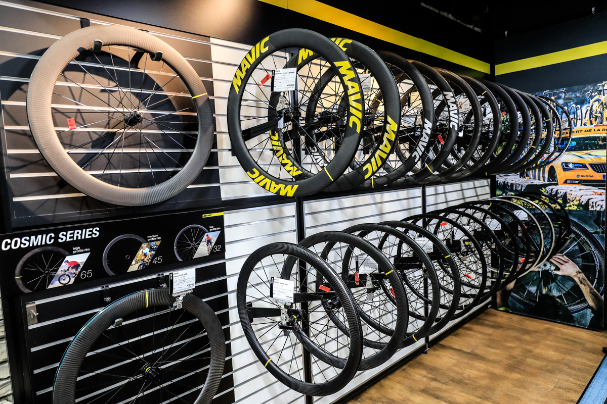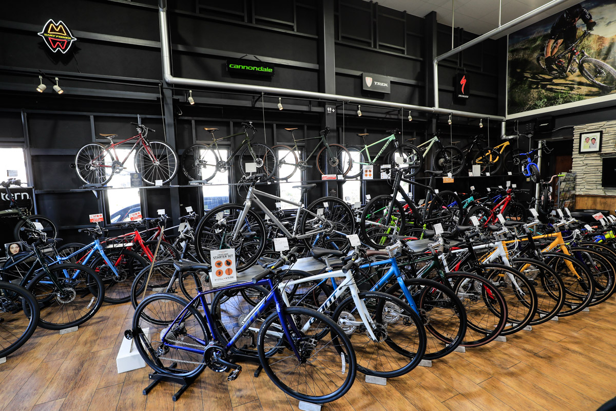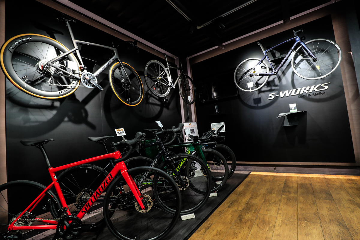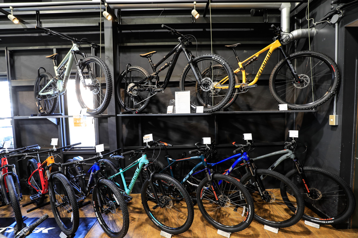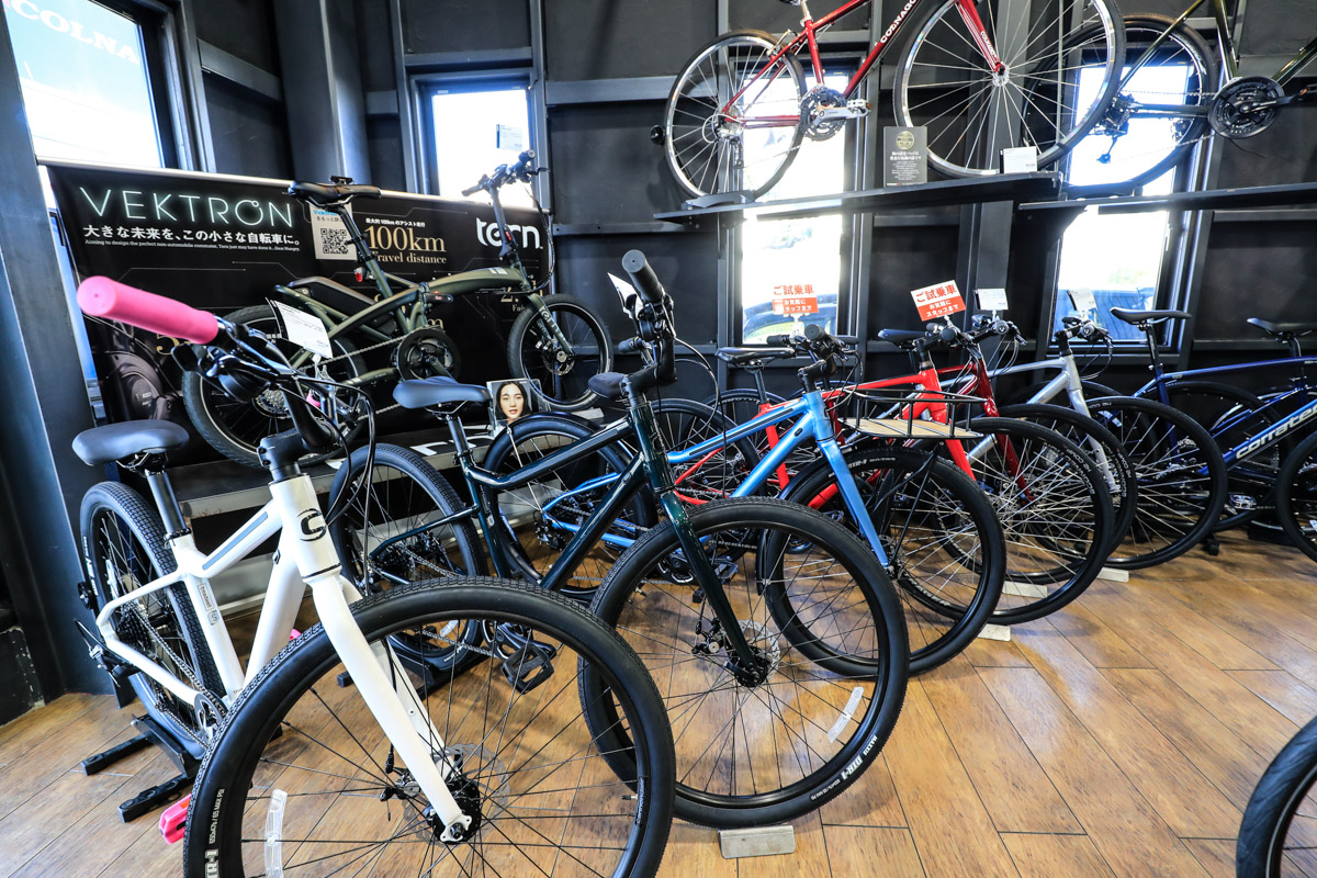 ショップの扉をくぐって店内に進むと、まず目に飛び込んでくるのは1階フロアにズラリと並んだロードバイク、MTB、クロスバイクの数々。トレックやキャノンデール、スペシャライズド、ジャイアント、ピナレロ、コルナゴ、ビアンキ、デローザ、BMC、ルック、コナなど世界の有名ブランドが揃う。