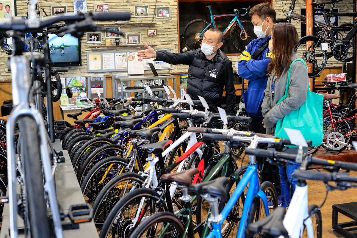 カミハギサイクルのテーマは、”Ride With Us” 。「ただ自転車を売るだけでは無く、お客様が我々と一緒になって自転車を楽しんでいける環境を整え、提案していきたいという思いがあります。」と語るのは、現在、自身でトライアスロン競技にも没頭している代表取締役の上萩泰司さん。