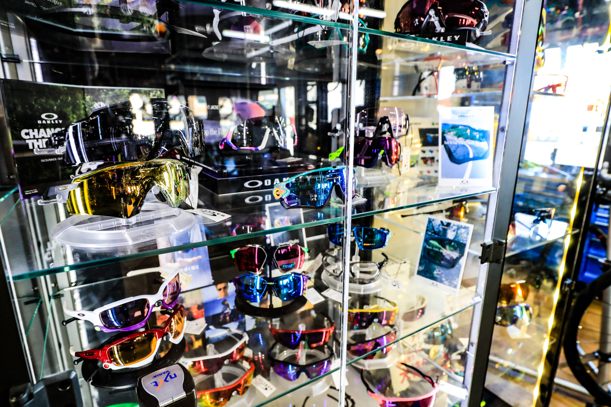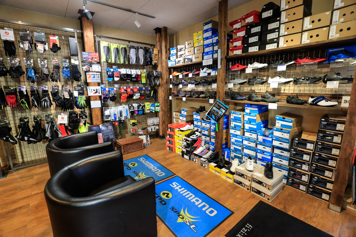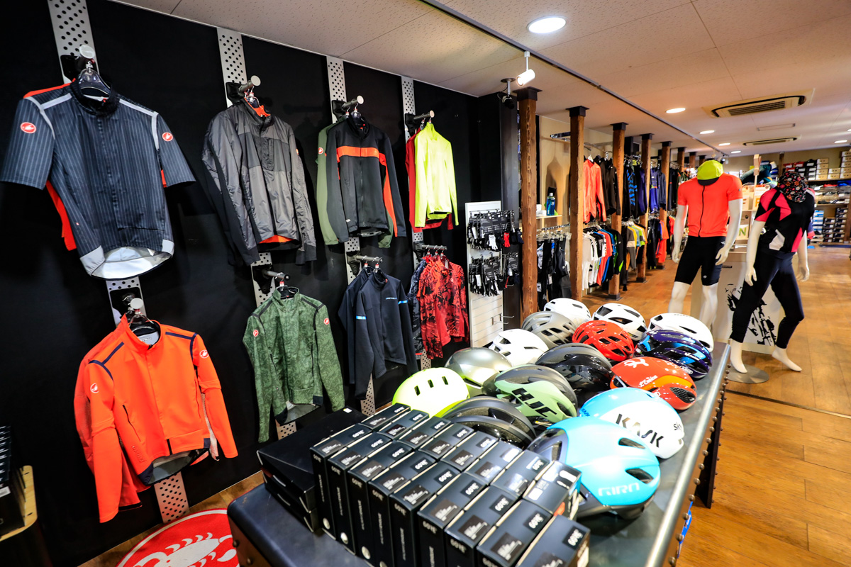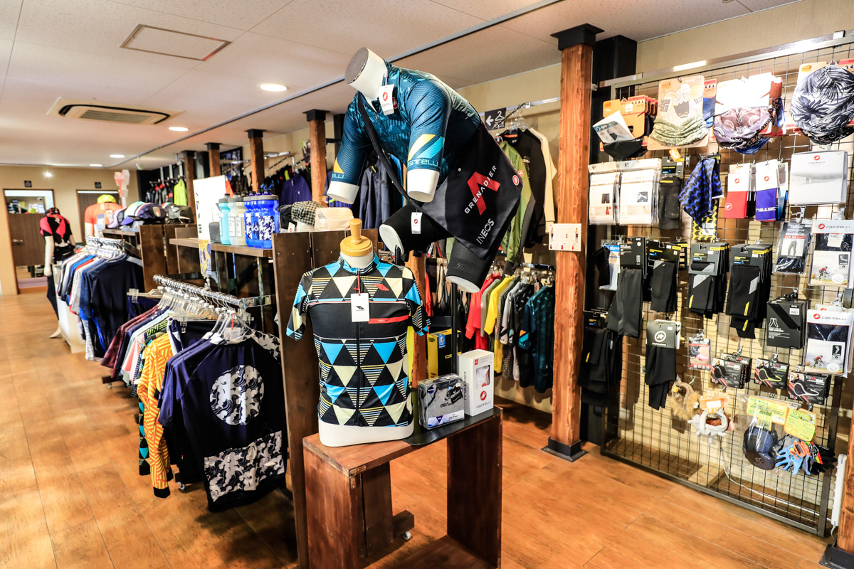 階段を上がった2階部分は暖色系の照明に照らされたウェアコーナーとなっていて、アソスやカステリなどこだわりを感じる品揃えだ。東海地区では唯一のホリゾンタルの取り扱い店であり、イザドアなどプレミアムなブランドも揃う。他にもトライアスロンコーナーやカジュアルウェアの用意もあり、オン・オフ問わず様々なニーズに対応してくれそう。開放感を感じさせる売り場面積は120坪もある広大なもの。
