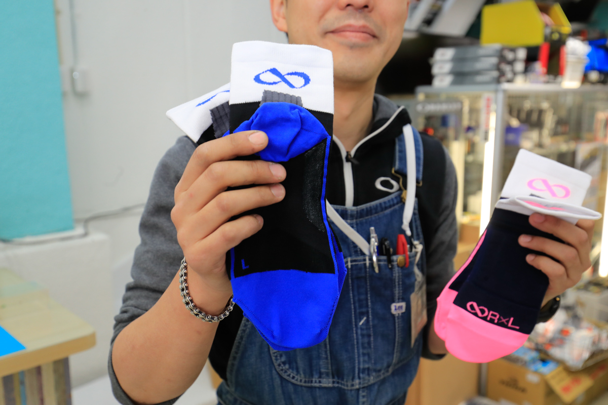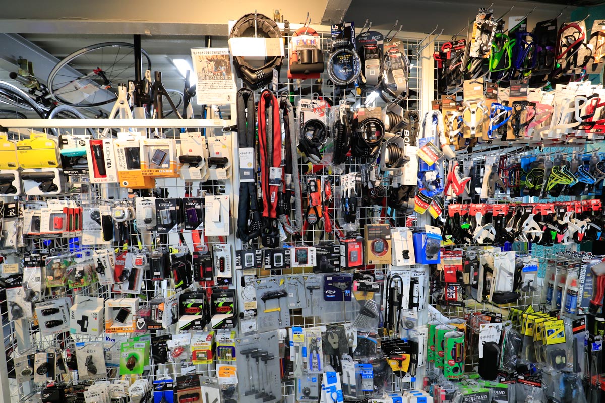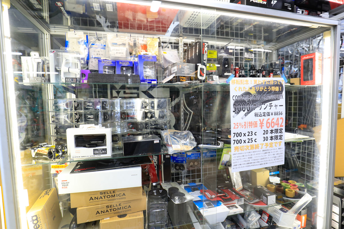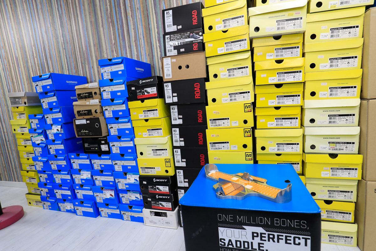シューズはマヴィックやシマノ、フィジーク製品を多く在庫し、店内で熱成型をする事が可能だ。個々の足の形を把握し、ユーザーと対話しながら1時間ほどかけてじっくりフィッティングを行い、購入後の再成型などアフターケアにも対応している。ペダルも定番ブランドはもちろんのこと、馴染みの薄いブランドまで豊富に取り揃えられている。インソールやソックスなども豊富。フィット感を左右するものは徹底して取り揃える。