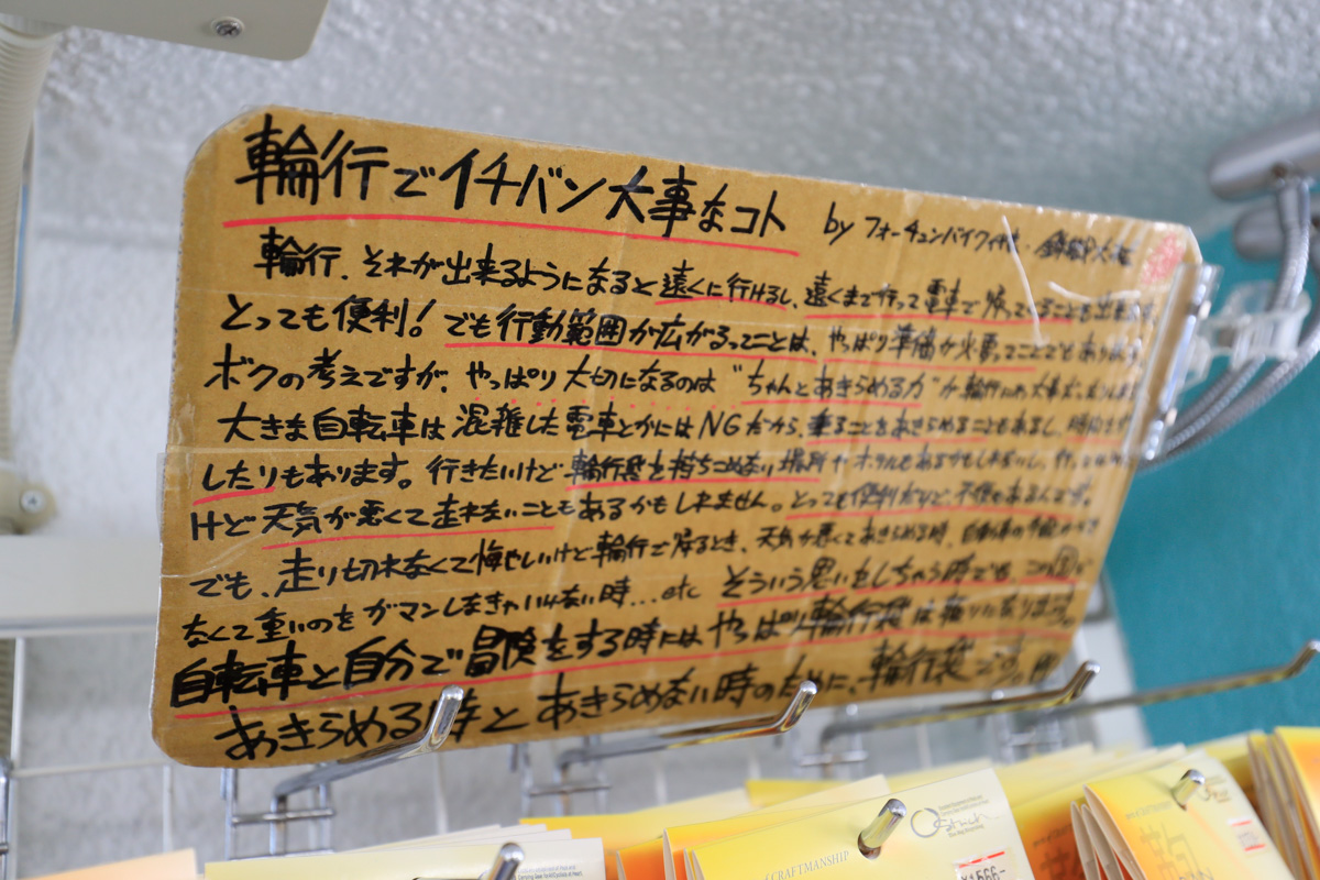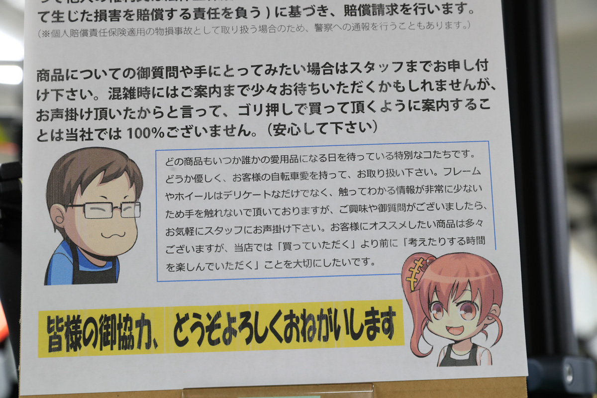 そんな錦織さんの思いは、完成車やフレーム、補給食のような小物まで様々なアイテムに付けられたポップに現れている。初心者には分かりにくい専門用語を解説したり、文字だけではなく、イラストを交えておすすめのポイントが説明されていたり。分かりやすいだけではなく、読み物としても面白い。ブランドや商品に関する豊富な知識量がある。リスクを承知の上でメーカー非推奨の組み合わせもテストするという。