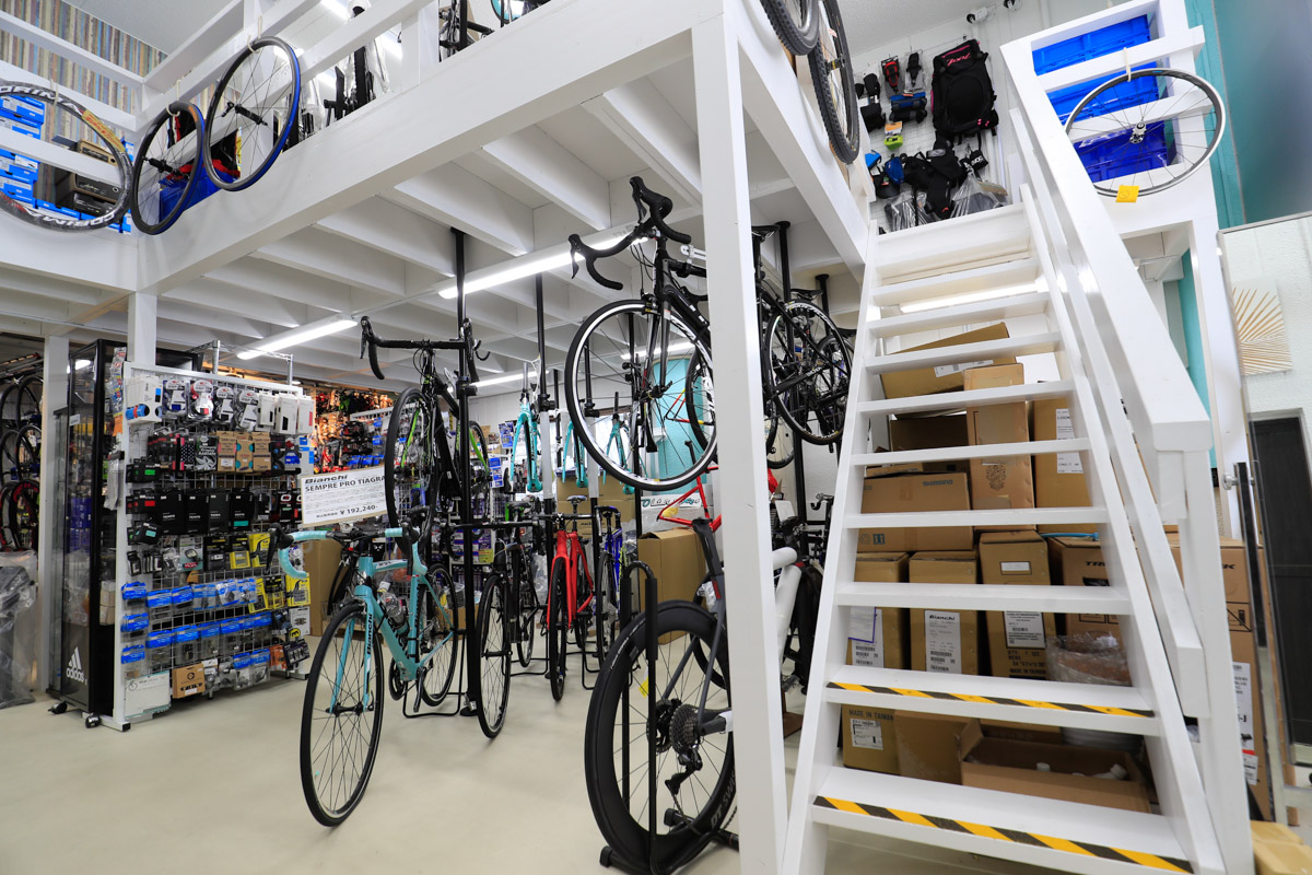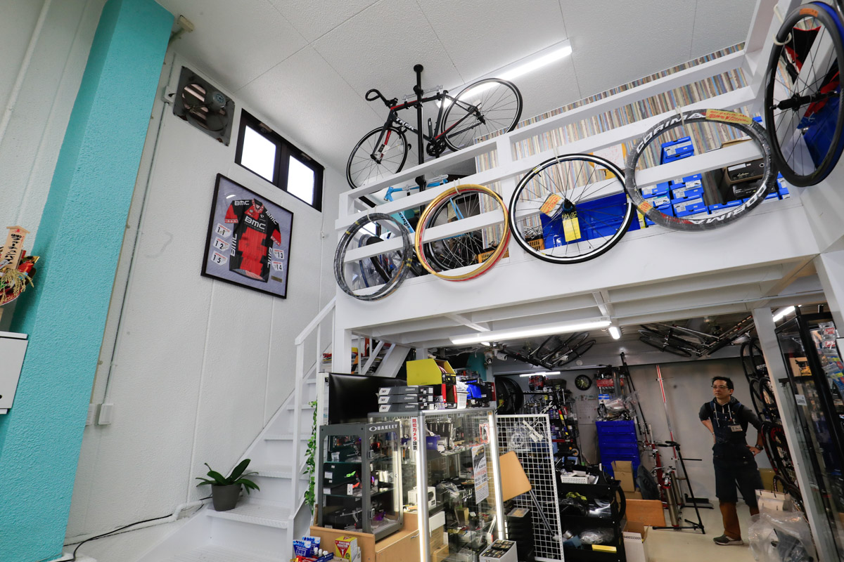 中二階のロフトに上がればクロスバイク、シューズやヘルメット、バッグ類、インソールなどソフトグッズやアクセサリーも並ぶ。アパレル類はこれからマヴィックをメインにした品揃えになるという。