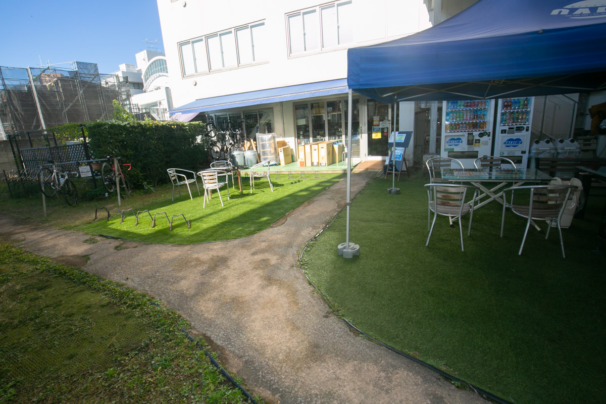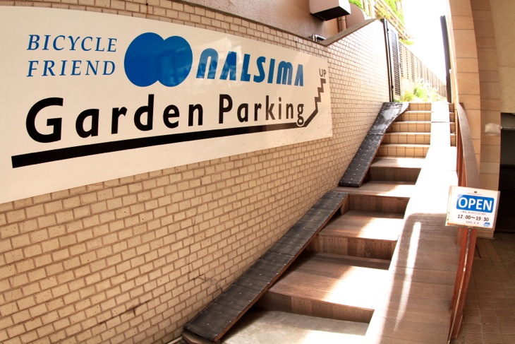 店舗ビル2階部分に位置するパティオ(中庭)を利用した「ガーデンパーキング」は、乗ってきた自転車をそのまま駐輪でき、気持ちのいい屋外でのんびり休憩できるようにベンチやテーブル、日よけのテントも用意されている。ドリンクの自販機も設置され、ライド後にはこのパティオでくつろぐことができる。