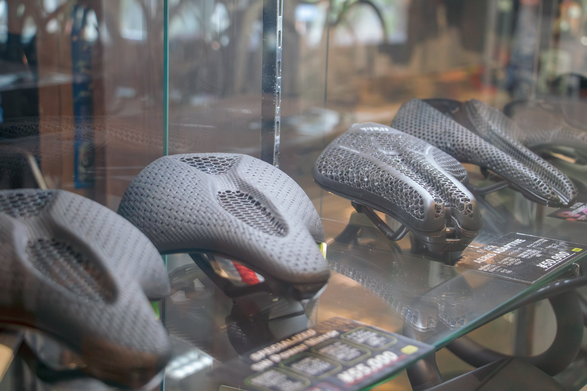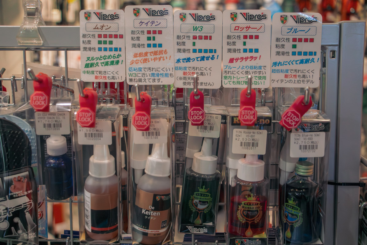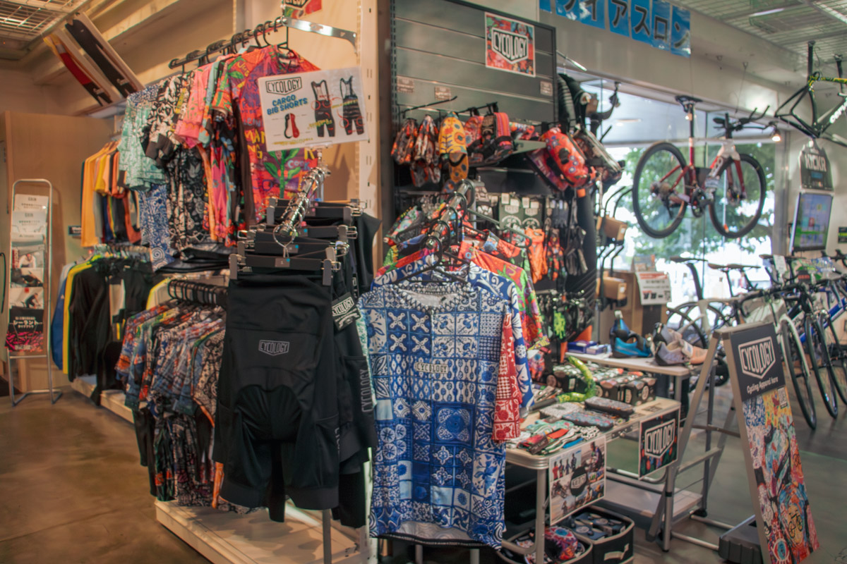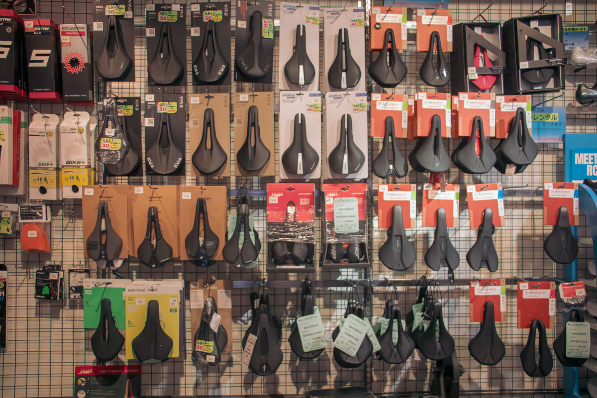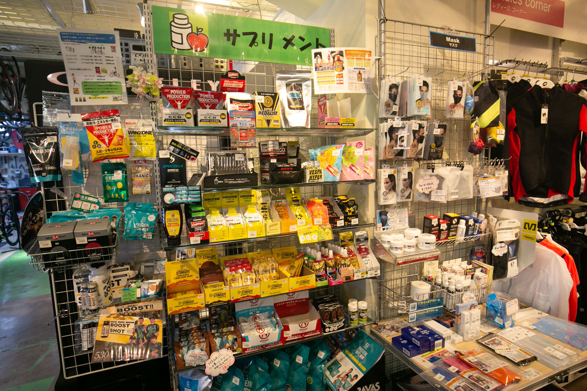 用品類もロードバイクユーザーが必要とするモノが、豊富かつ整然と陳列される。つぶさに見ていくと、どれも選ばれるべくして選ばれたということが分かる。アパレル、サドル、シューズ、アクセサリーなど、ユーザーにとって選択肢が多くあるべき製品の量はとても豊富で、ショッピングしていて楽しくなる。「こんなものがあったのか!」と新しい発見も。そして、ところどころに「スタッフのオススメ商品」のタグがつく。商品選びに迷ったらその店員さんを見つけて話を聞くことができる。