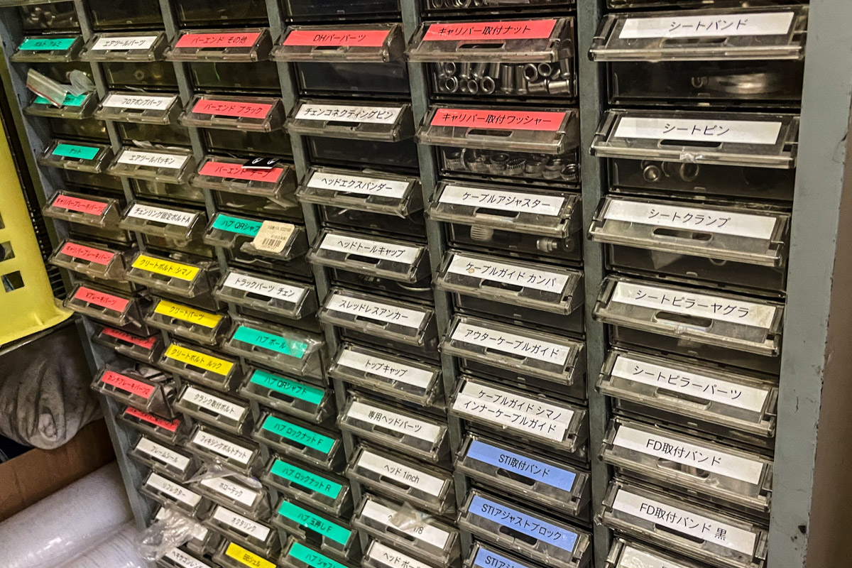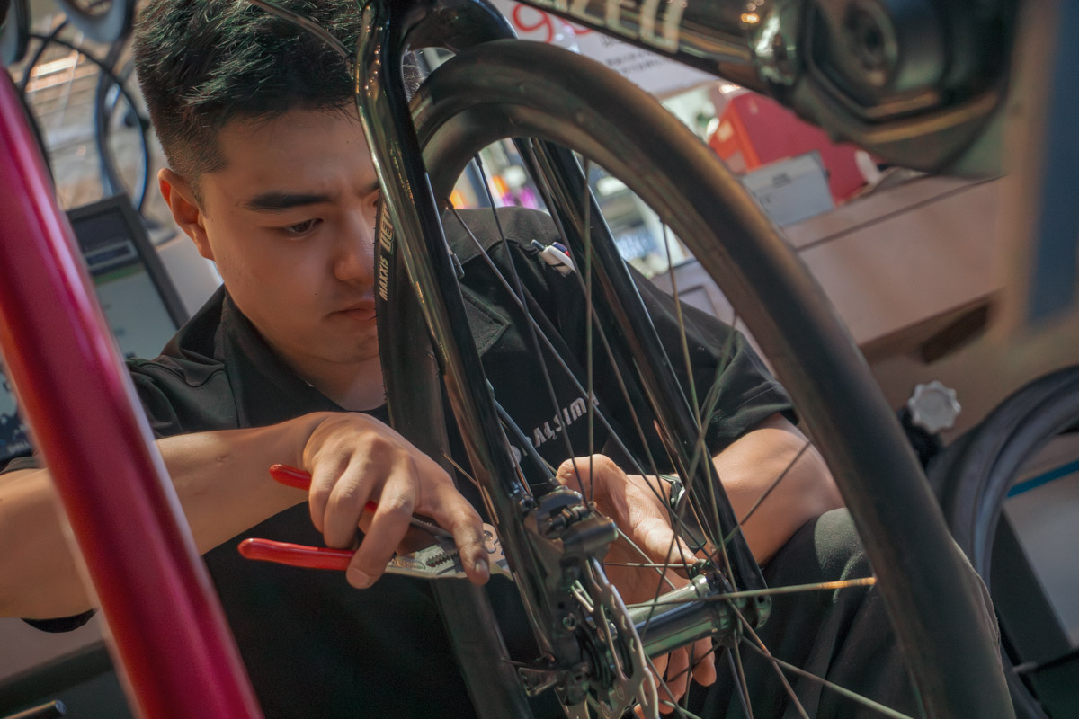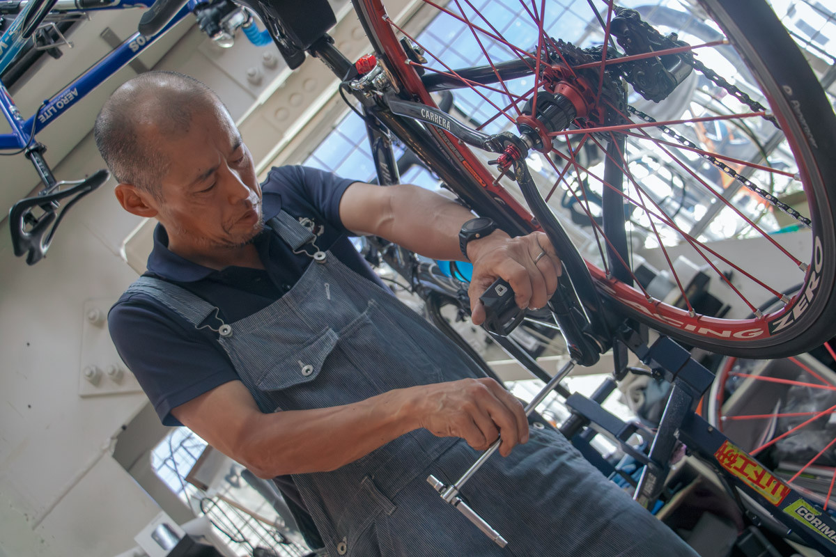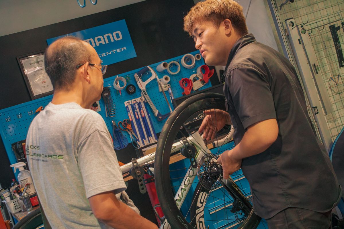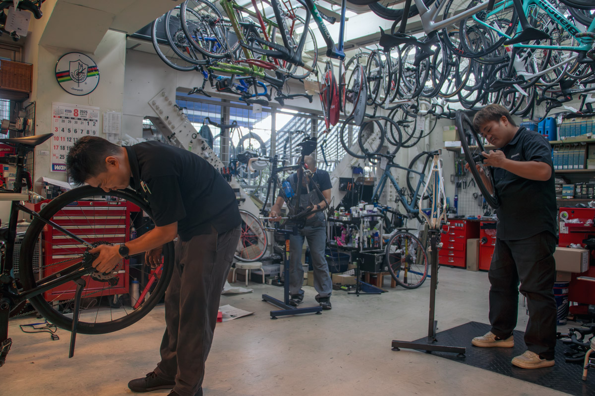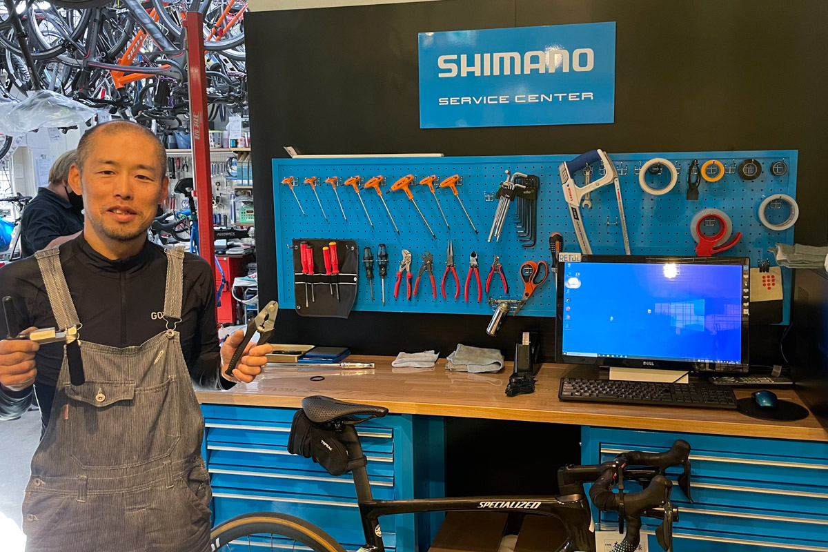 また、メカニック作業への信頼度が高いのもなるしまフレンドが評価されるところ。チーフメカニックの小畑さんはLEOMO所属の現役レーサーであり、研究家としても知られる存在。「ディスクブレーキやエアロロードバイクの流行によるケーブルの内蔵化など、近年のロードバイクの進化でメカニックの技量がより問われる時代になりました。スタッフは皆研究熱心で、いち早く自分たちで最先端の製品を使って、ときにメーカーより先に不具合を見つけて対処したりもします。安全のためにもぜひ作業はお任せください」。