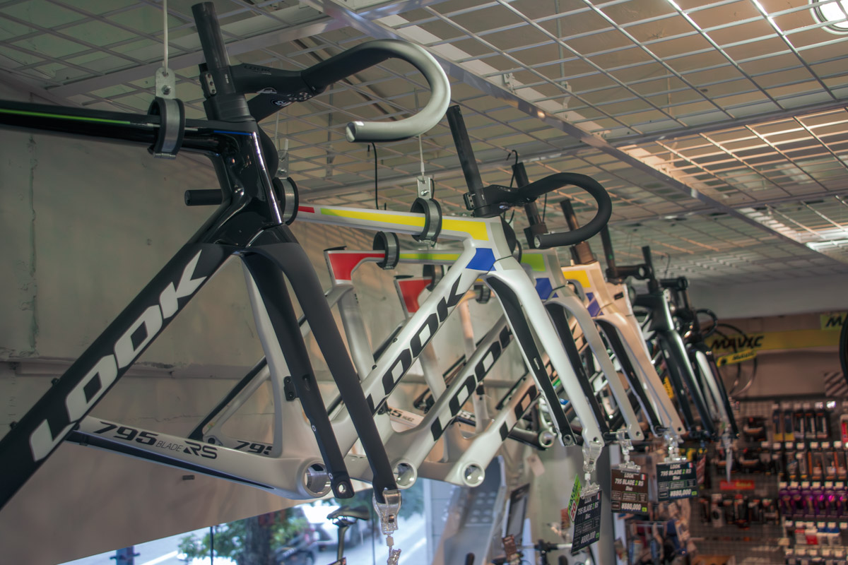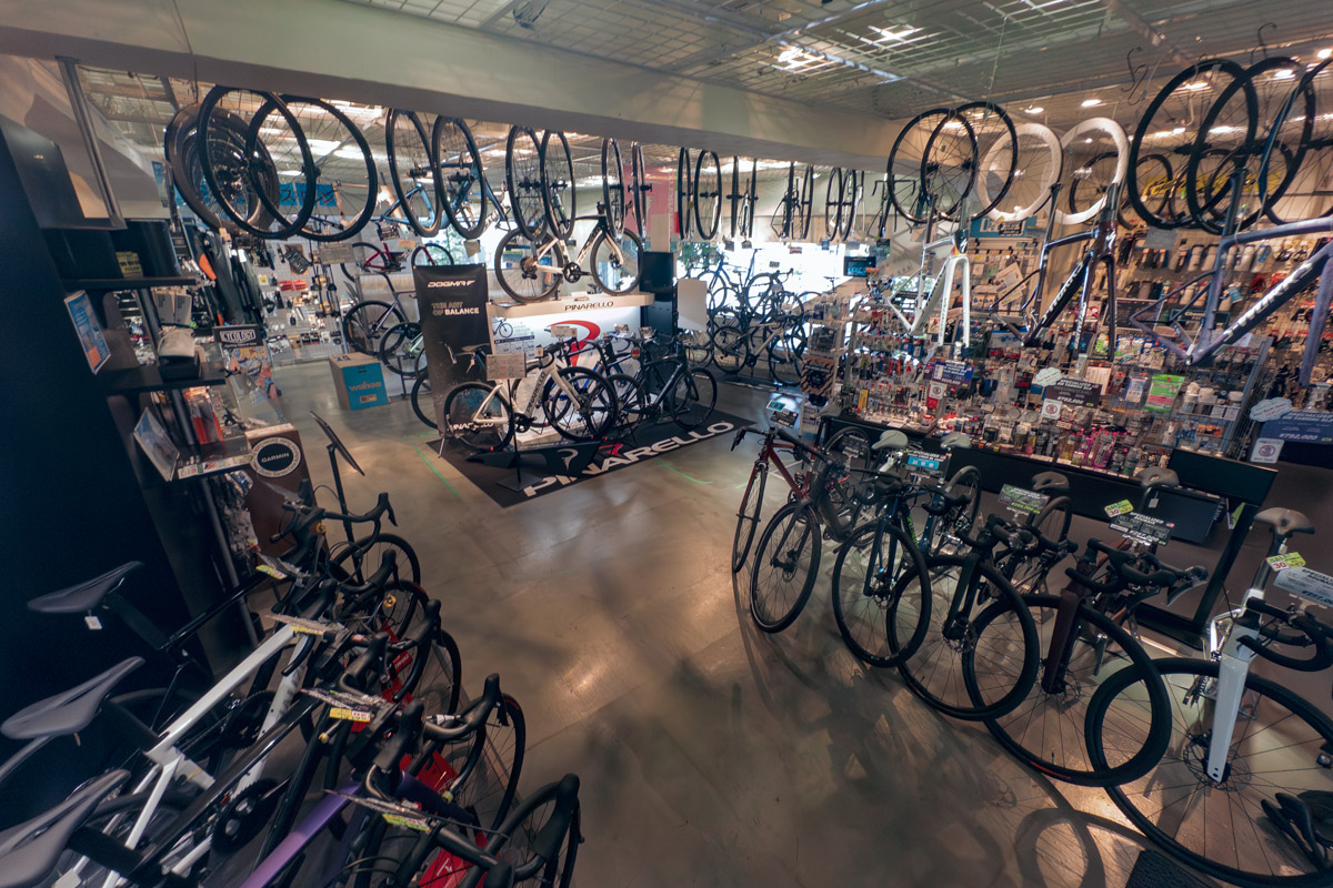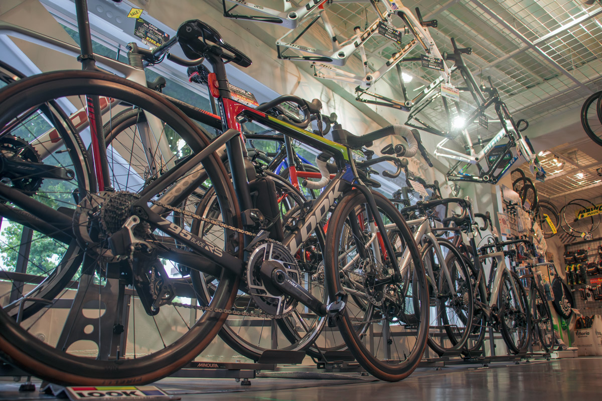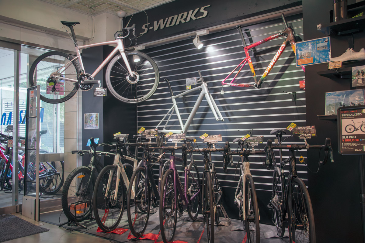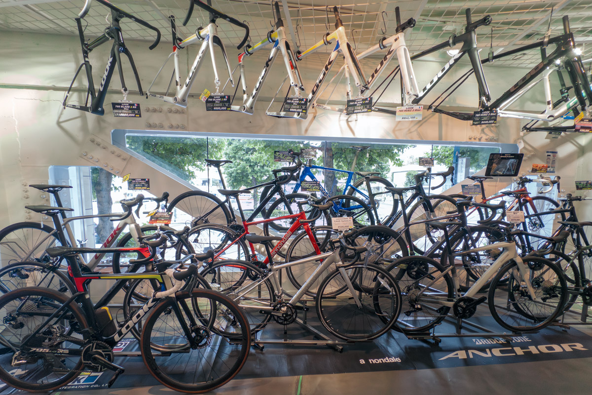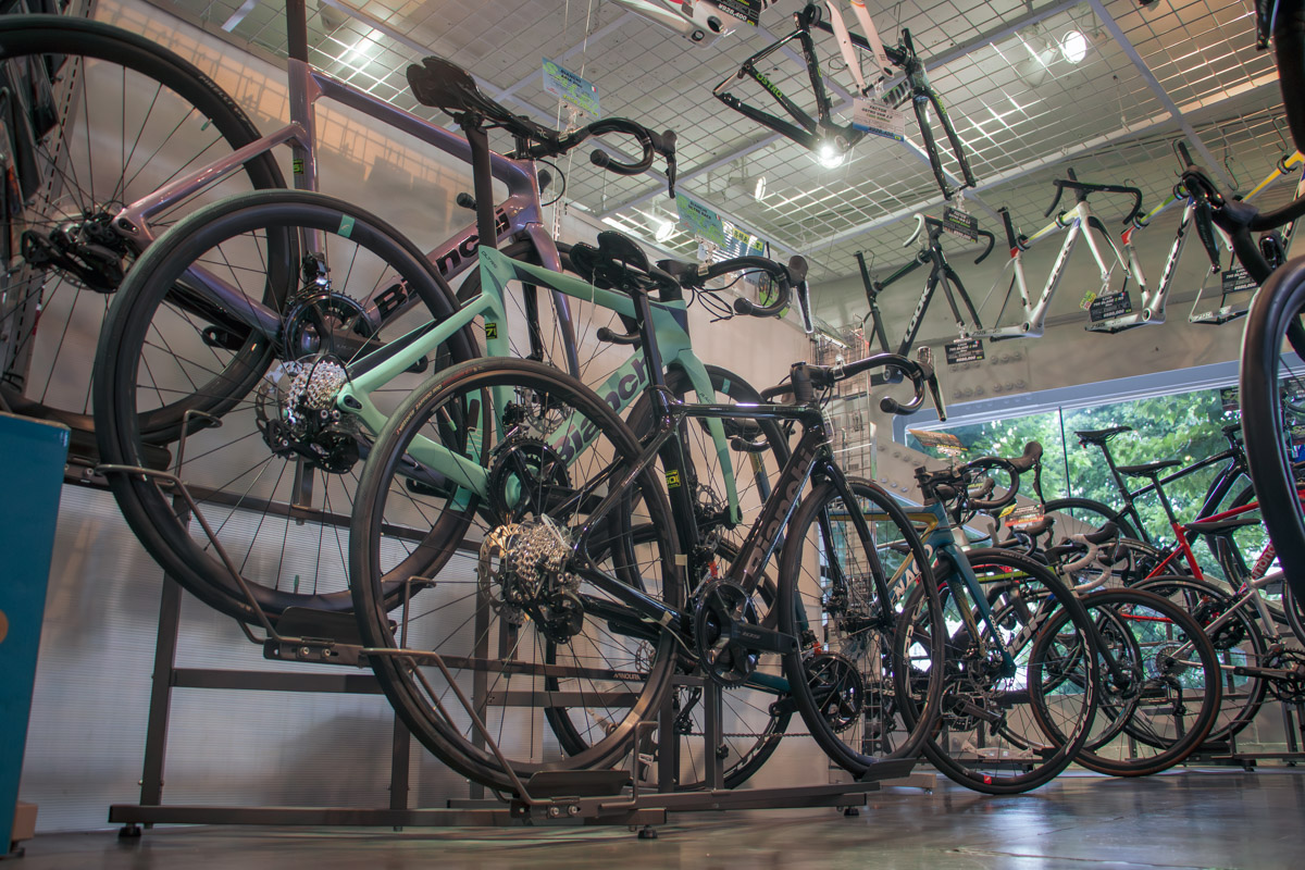 ビルの2階フロアの広々とした店内は、階の上下移動がなく買い物ができる。店内には人気ブランドごと、スペシャライズド、ルック、ピナレロ、デローザ、キャノンデール、ビアンキ、シーポなど、スタッフが厳選したロードバイクが並ぶ。