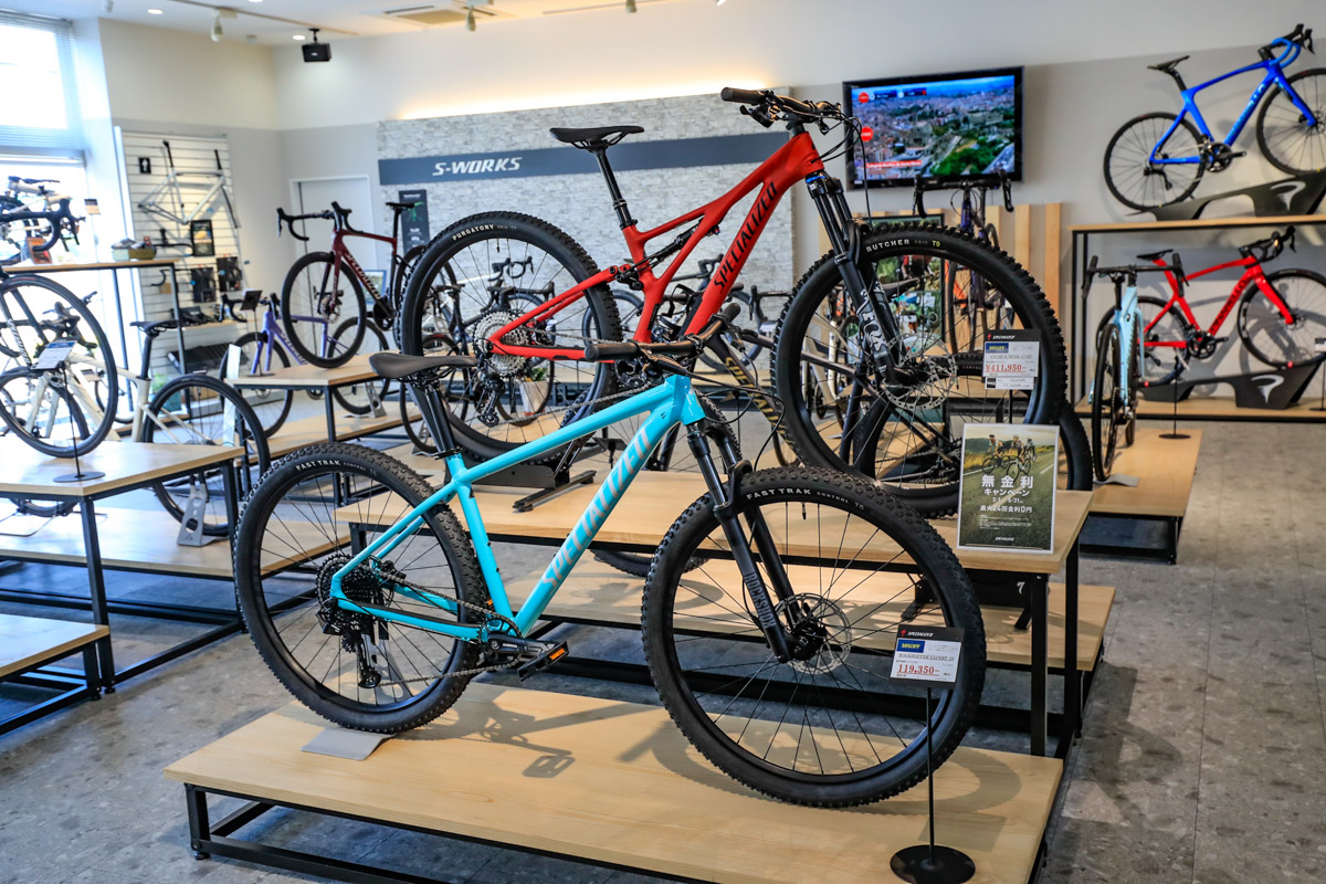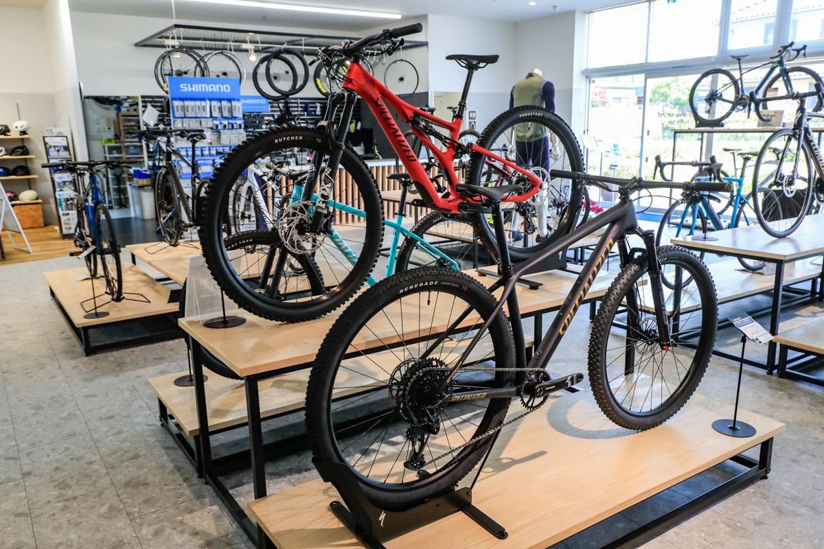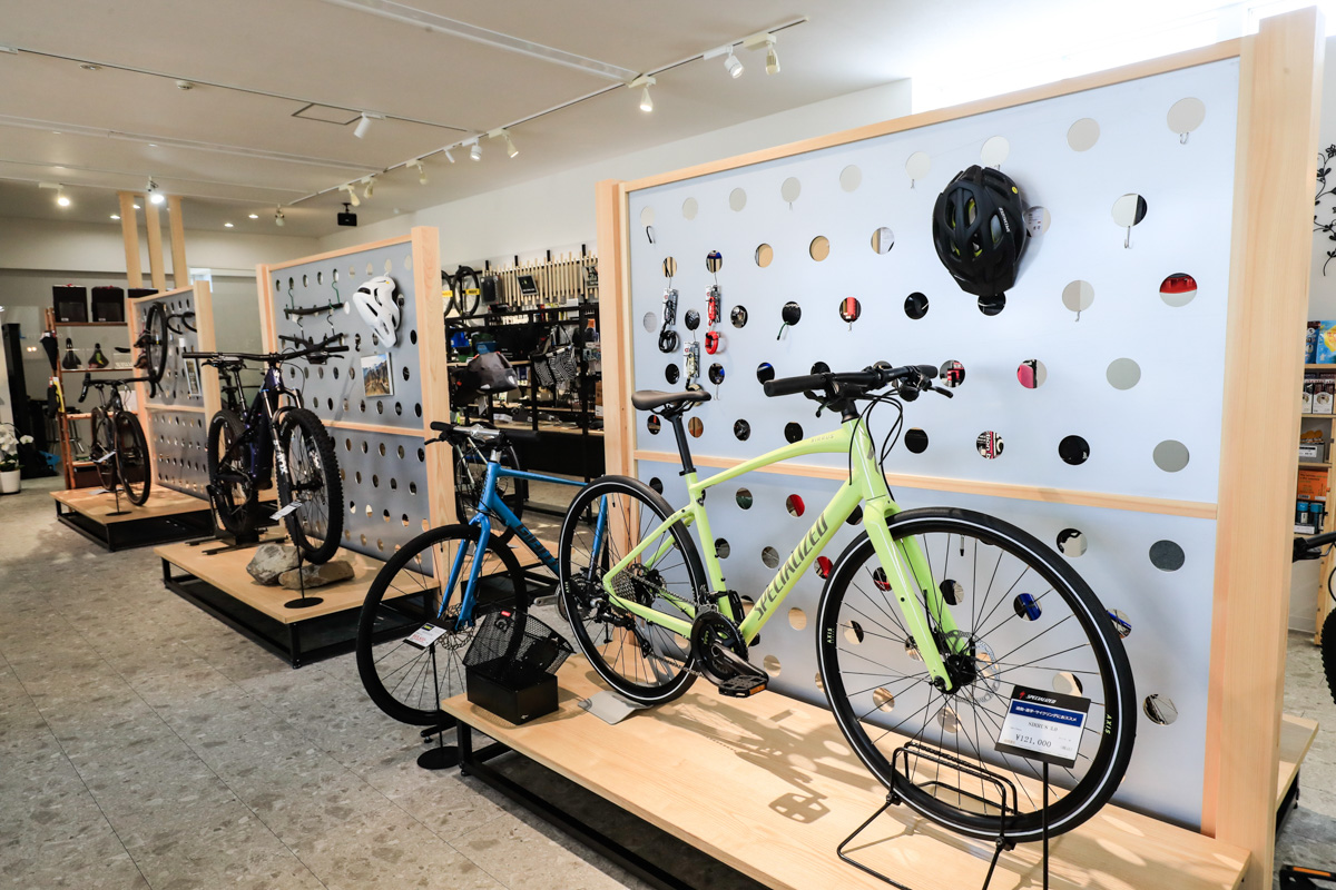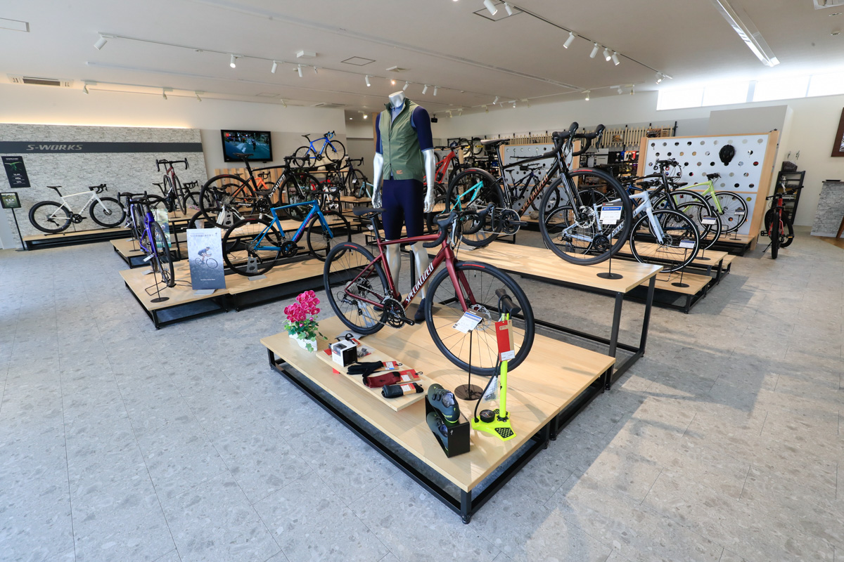 約80坪という驚くほど広々とした店舗スペースに、スポーツバイクが余裕を持ってゆったりとディスプレイされる。店内に整然と並ぶバイクはスペシャライズド製品がそのほとんどを占めるが、ジャンルによって選べるラインナップをわかりやすく揃えている。