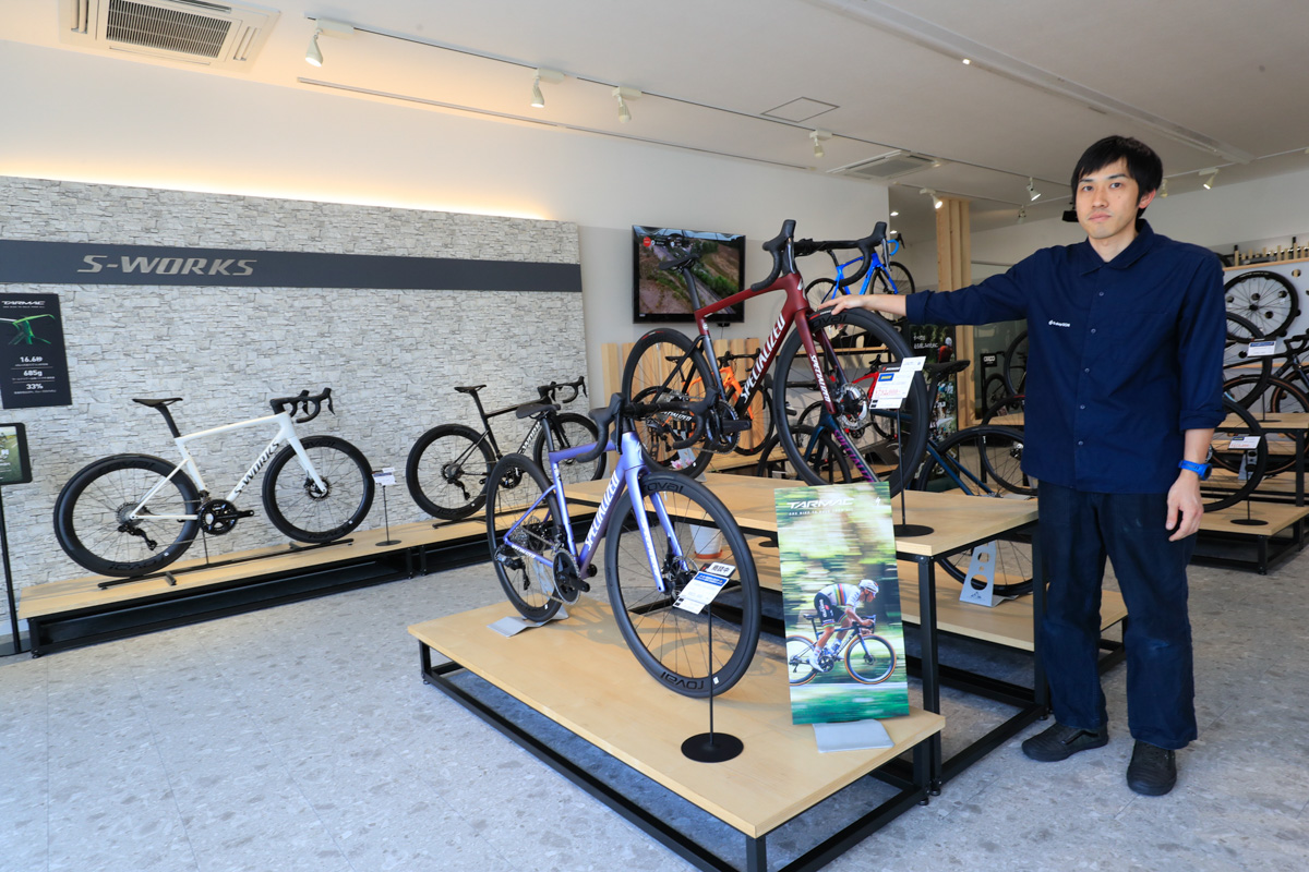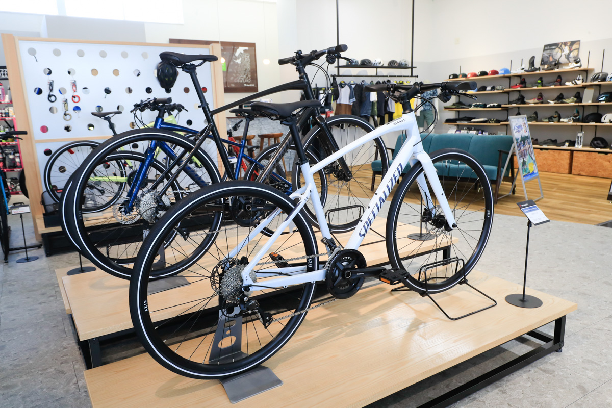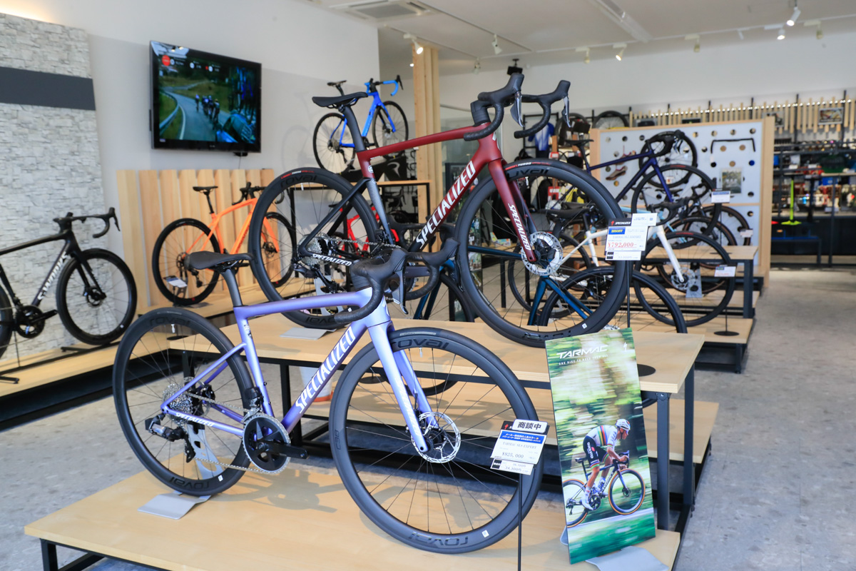人気のS-Worksコーナーを筆頭にスペシャライズドのバイクが店内の8割以上を占め、ロードバイク、クロスバイク、MTB、グラベルバイク、キッズバイク、小径車などをカテゴリーごとに並べて展示する。ほかにピナレロのロードバイクや小径車のDAHON、KHS、トライアスロンバイクのCEEPO(シーポ)など、特色のあるブランドや車種を生かした展示もある。またオフロードコーナー、グラベルコーナー、トライアスロンコーナーなど、乗り方・遊び方のジャンルを軸とした展示も展開される。スポーツバイクに詳しくなくても、ゆったりした空間で、グレードやジャンルごとに並んだバイクの一台一台をしっかり見て、確かめながら選ぶことができるのだ。