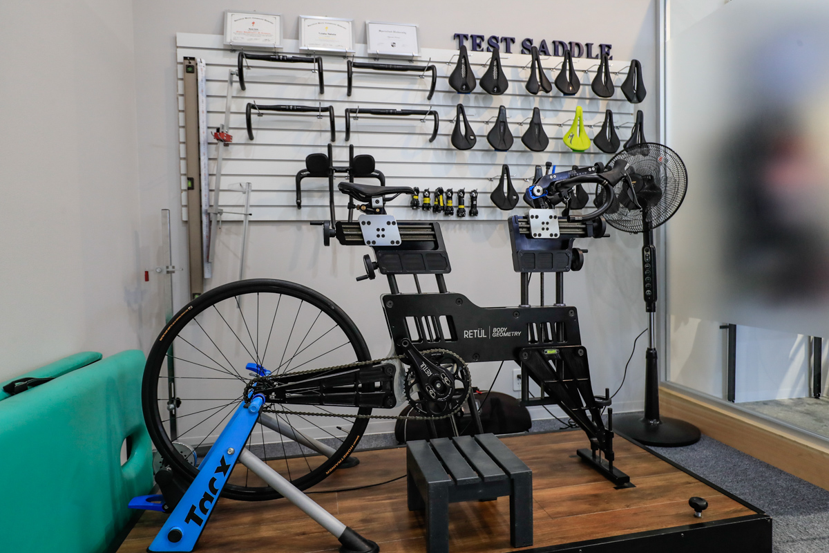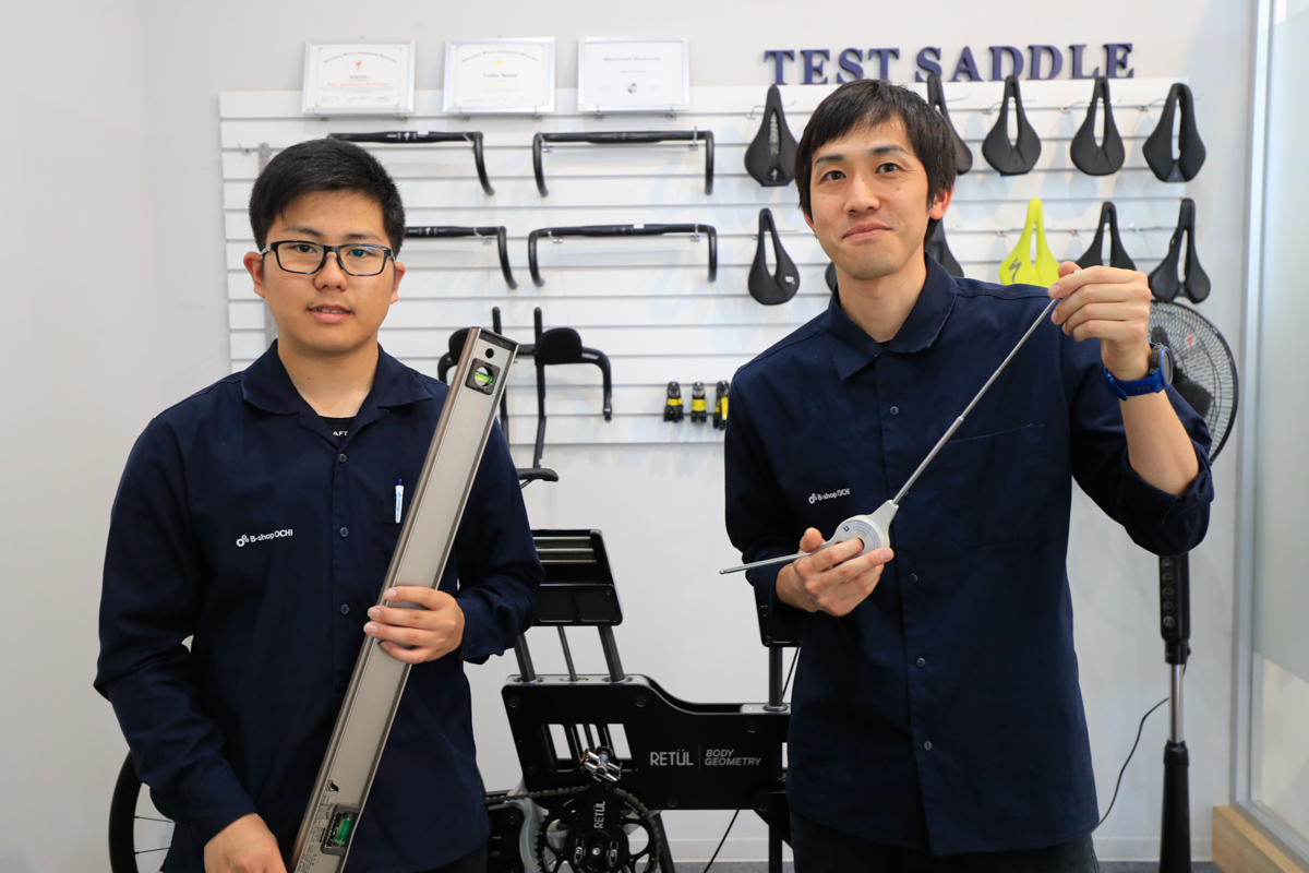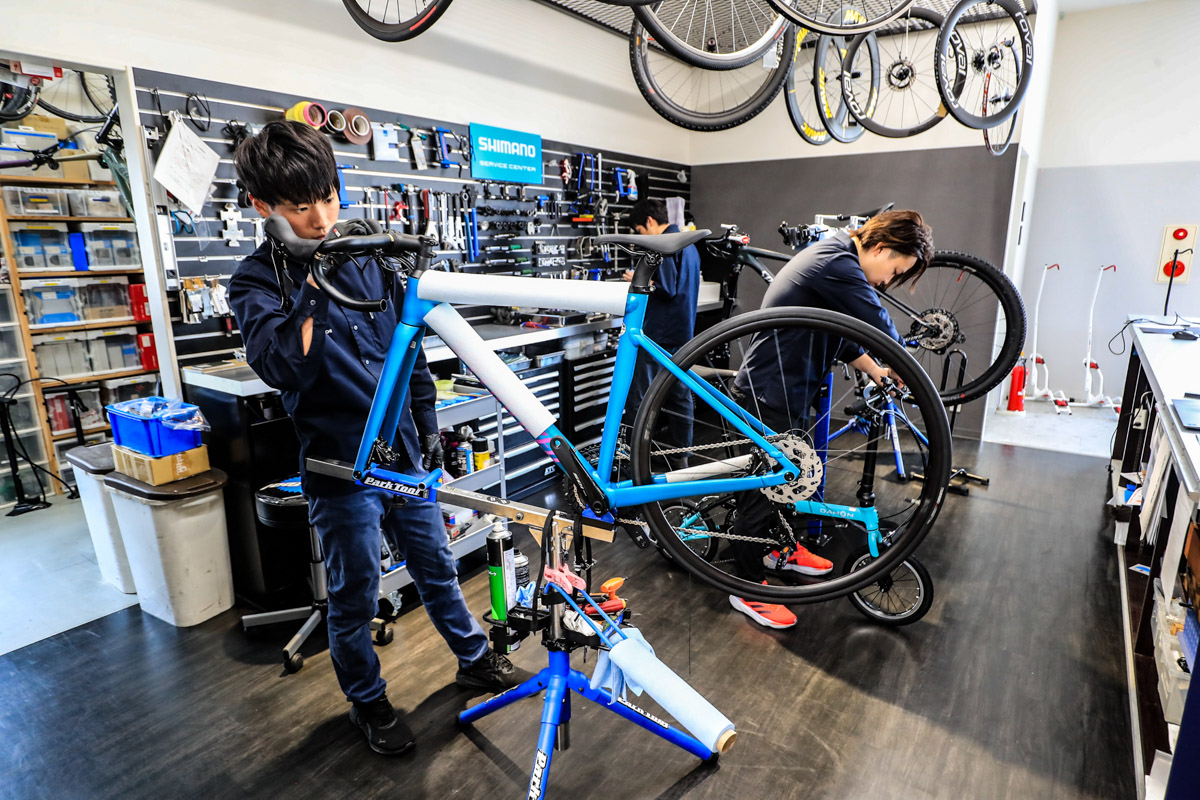 「メカニック作業は基本に忠実に」をモットーとしながらも、上級者の要望にも充分応える技術力とノウハウを持つことがB-Shop OCHIの強みだ。愛媛県にありながら四国4県から来店があり、とくにフィッティングを受けにくる人は県外からも多いという。現在スペシャライズドのフィッティングメソッド「RETUL」を取り入れており、中田さんと大前さん、そして越智代表の3人ものフィッター有資格者が対応にあたっている。購入前のバイクのポジション測定からのフレームサイズ選定はもちろん、スポーツライド入門者からロングライドやレースなどを目指す人の要望にも対応する。フィッティングルームのパーソナルスペース化は、より満足度の高い対応を目指した設備の充実でもある。