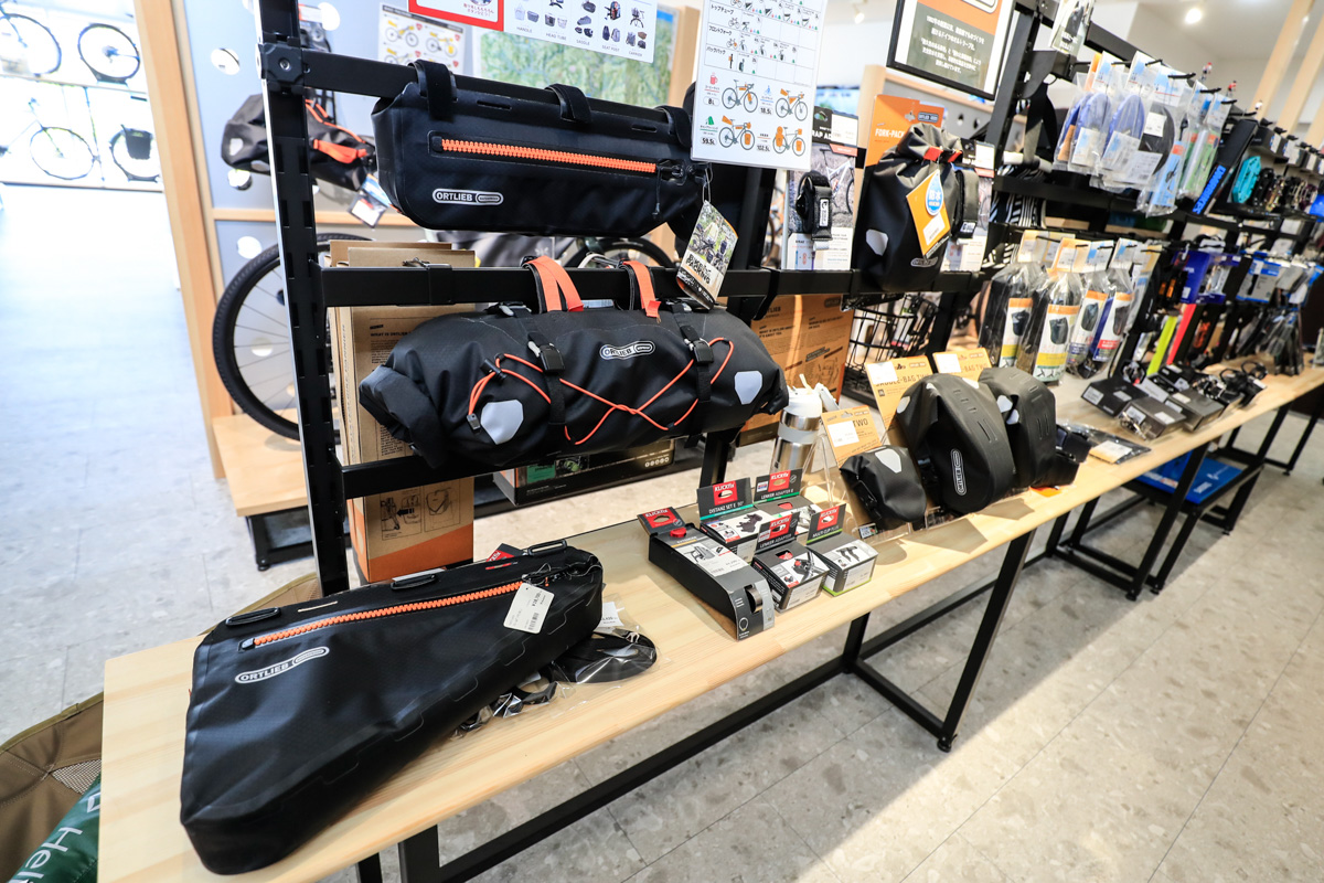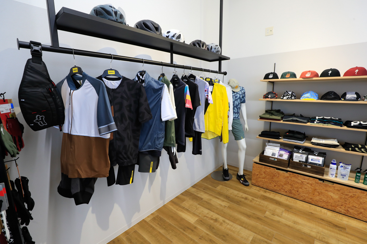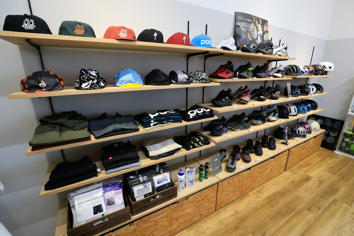 バイク以外の用品もかなり充実している。人気のあるスペシャライズドのサドルやアクセサリーは充実の品揃え。マヴィックのホイール&アパレルや、MTBブランドとして人気のFOXやPOCのアパレルやプロテクター類、ヘルメットはジロやKABUTOの人気モデル、オークリーやDontPanickのアイウェア、2XUのトライアスロン用ウェットスーツなどが揃う。オルトリーブやアピデュラのバッグやバイクパッキング製品類も充実している。サイクリング向きの気が利いたアウトドア用品まで揃っている。
