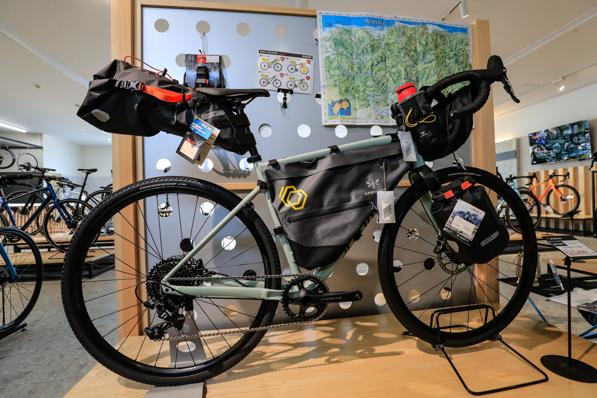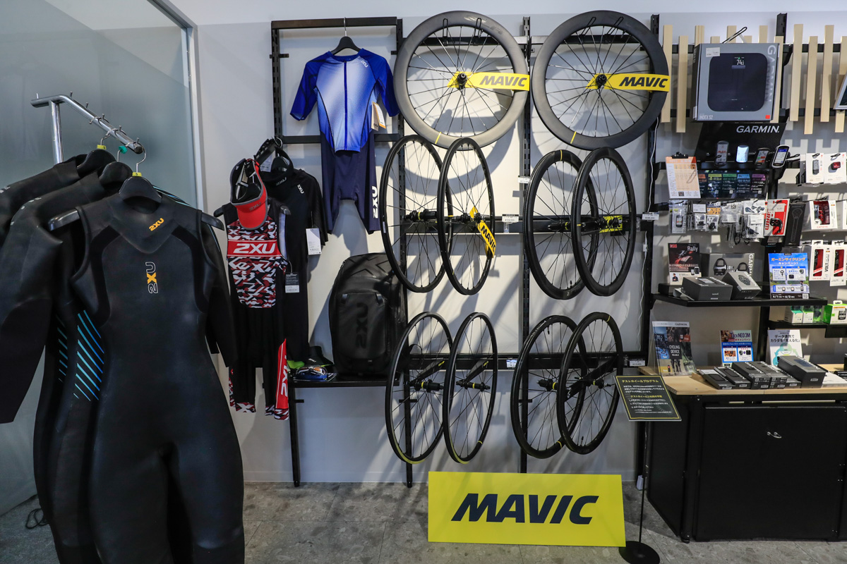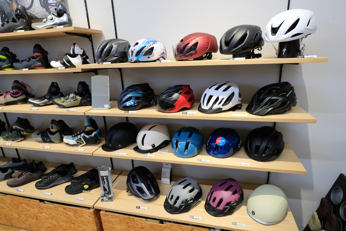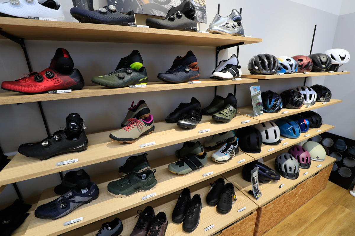 バイク以外の用品もかなり充実している。人気のあるスペシャライズドのサドルやアクセサリーは充実の品揃え。マヴィックのホイール&アパレルや、MTBブランドとして人気のFOXやPOCのアパレルやプロテクター類、ヘルメットはジロやKABUTOの人気モデル、オークリーやDontPanickのアイウェア、2XUのトライアスロン用ウェットスーツなどが揃う。オルトリーブやアピデュラのバッグやバイクパッキング製品類も充実している。サイクリング向きの気が利いたアウトドア用品まで揃っている。