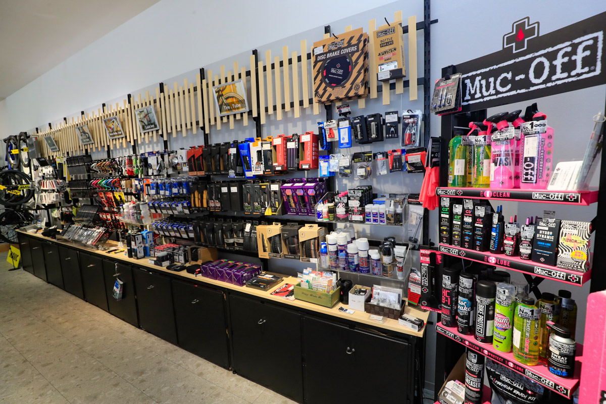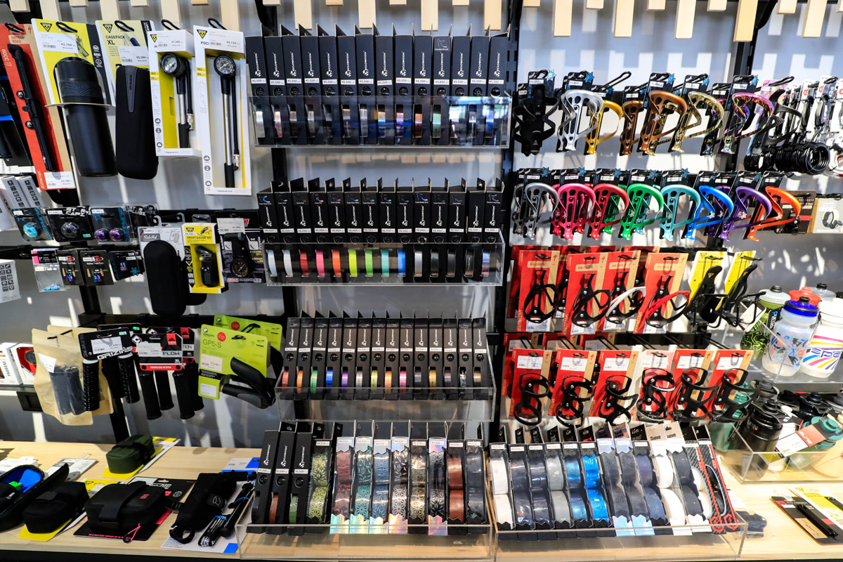 スパカズのボトルケージやシクロベーションのバーテープなど、バイクをカラフルに彩るアクセサリー類も厳選した人気ブランドのものを揃えるほか、キャットアイのライト、ガーミンのサイクルコンピュータ類、TOPEAKの携帯工具などが揃い、街乗りに便利な用品類も充実。好評のマックオフのケミカルはフルラインナップで展示され、今マーケットで人気のある製品の数々を厳選してラインナップしている。