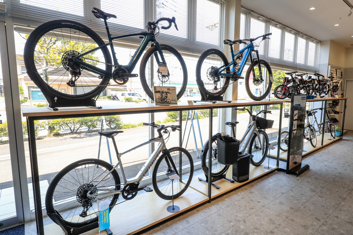 店舗前には試乗できるバイクが並び、レンタル可能な本格的なe-Bikeやe-MTBも店内に多く揃っているため、興味のあるスポーツバイクやEバイクを、まずは体験してみたいといった要望に応えてくれる。