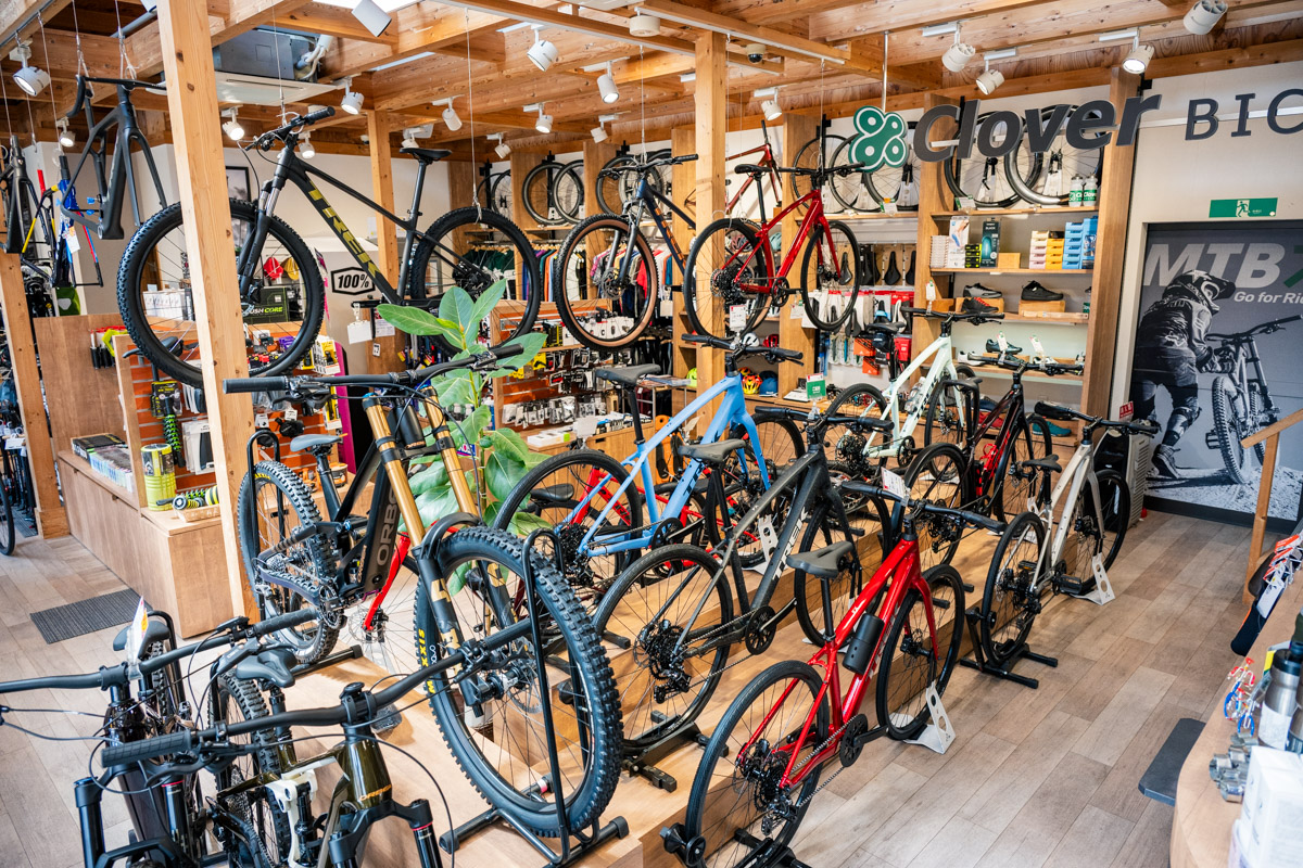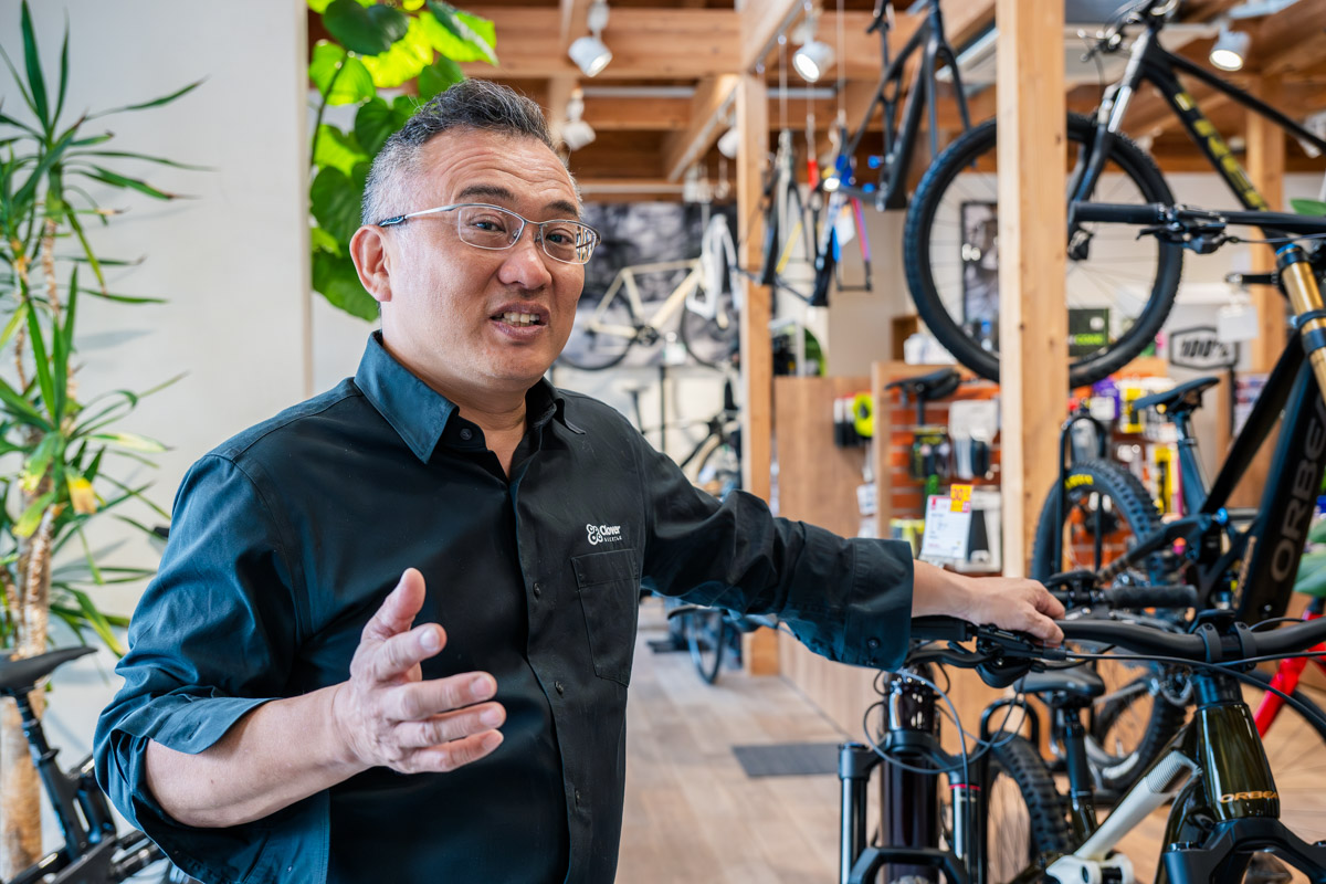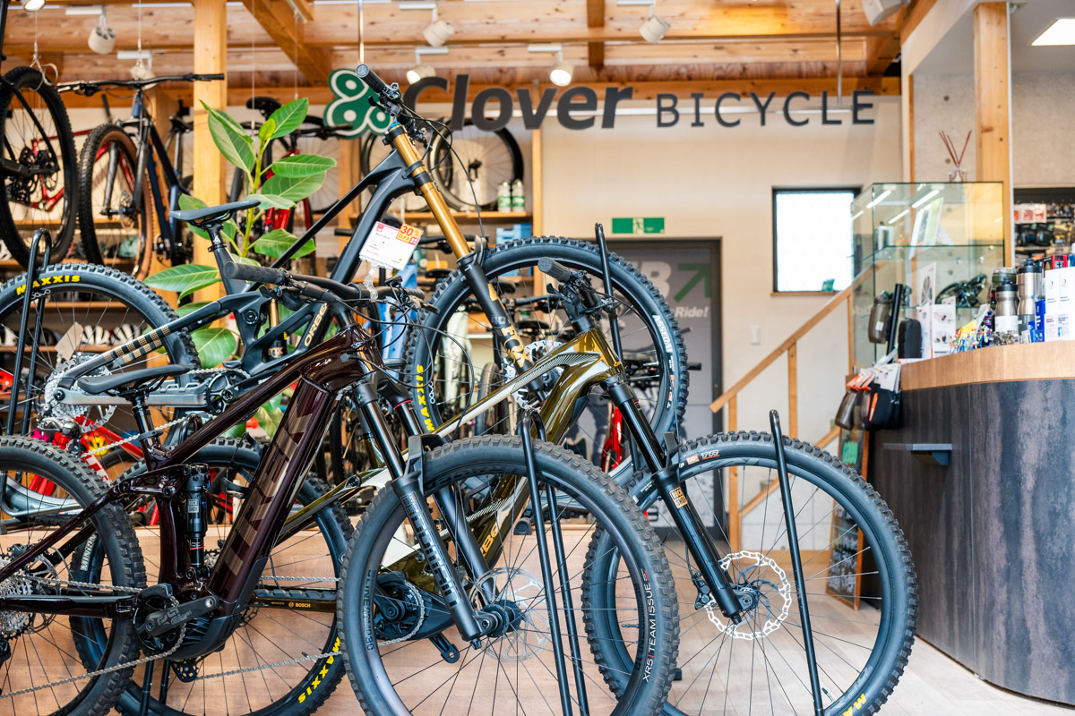E-MTBに関しては全国でも有数の販売実績を持つクローバーバイシクル。それは、柴谷さんが心底E-MTBの魅力に惚れ込んでいるから。「E-MTBが生まれてから、トレイルの常識は変わりましたね。下れる本数が増えるので、上達するスピードが段違い。MTBという趣味の敷居を格段に下げてくれました」とその魅力を教えてくれた。実際、クローバーバイシクルのお客さんの中では還暦からE-MTBでトレイルライドを始めた方もいるのだとか。関西でトレイル遊びに興味があるという方は、ここに来れば間違いない。