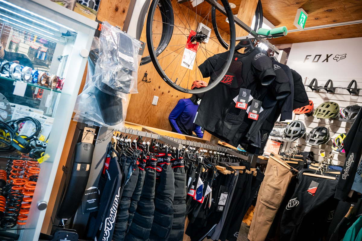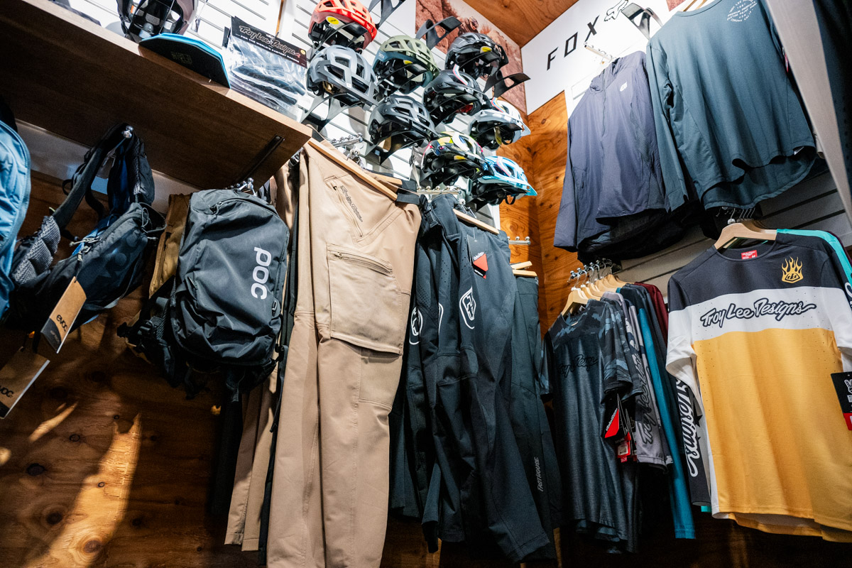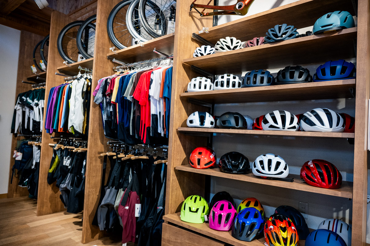 特徴的なポイントは、ロードバイクやクロスバイクはもちろん、MTB、そしてE-BIKEのラインナップが充実していることだろう。MTBはトレイルやエンデューロ系を中心に、バイクやホイール、各種パーツはもちろんシャツやパンツ、プロテクター類、バックパックにヘルメットなど山遊びに出かけるためのアイテム類が一通り、それもカッコイイものばかり揃っている。他にも試着室やカウンター、フィッティングスペースの用意など、「無いものは無い」といった充実の店舗構えだ。