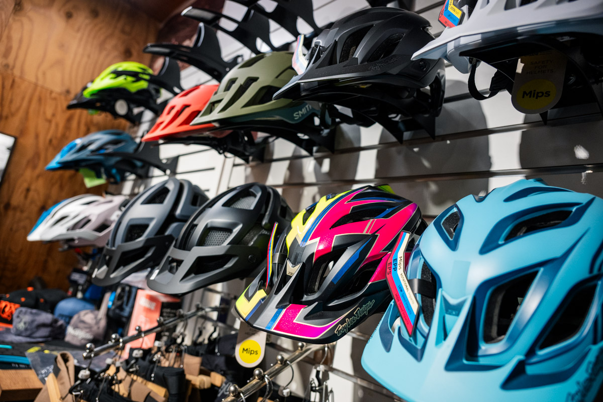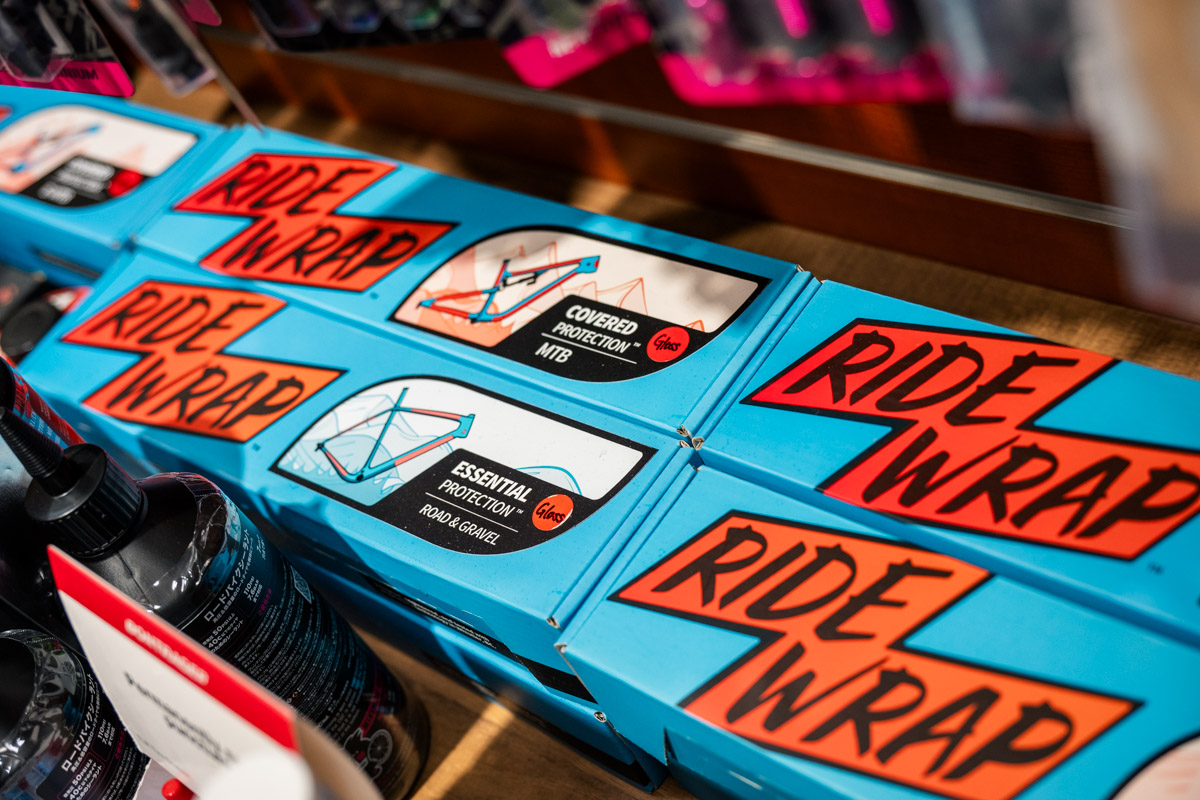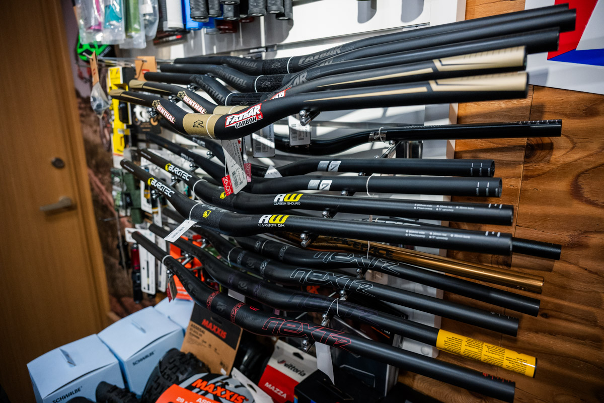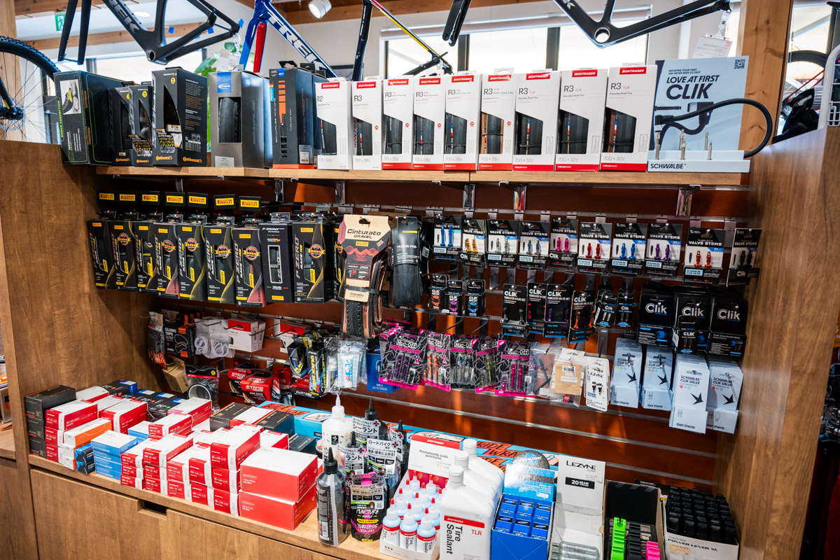 特徴的なポイントは、ロードバイクやクロスバイクはもちろん、MTB、そしてE-BIKEのラインナップが充実していることだろう。MTBはトレイルやエンデューロ系を中心に、バイクやホイール、各種パーツはもちろんシャツやパンツ、プロテクター類、バックパックにヘルメットなど山遊びに出かけるためのアイテム類が一通り、それもカッコイイものばかり揃っている。他にも試着室やカウンター、フィッティングスペースの用意など、「無いものは無い」といった充実の店舗構えだ。