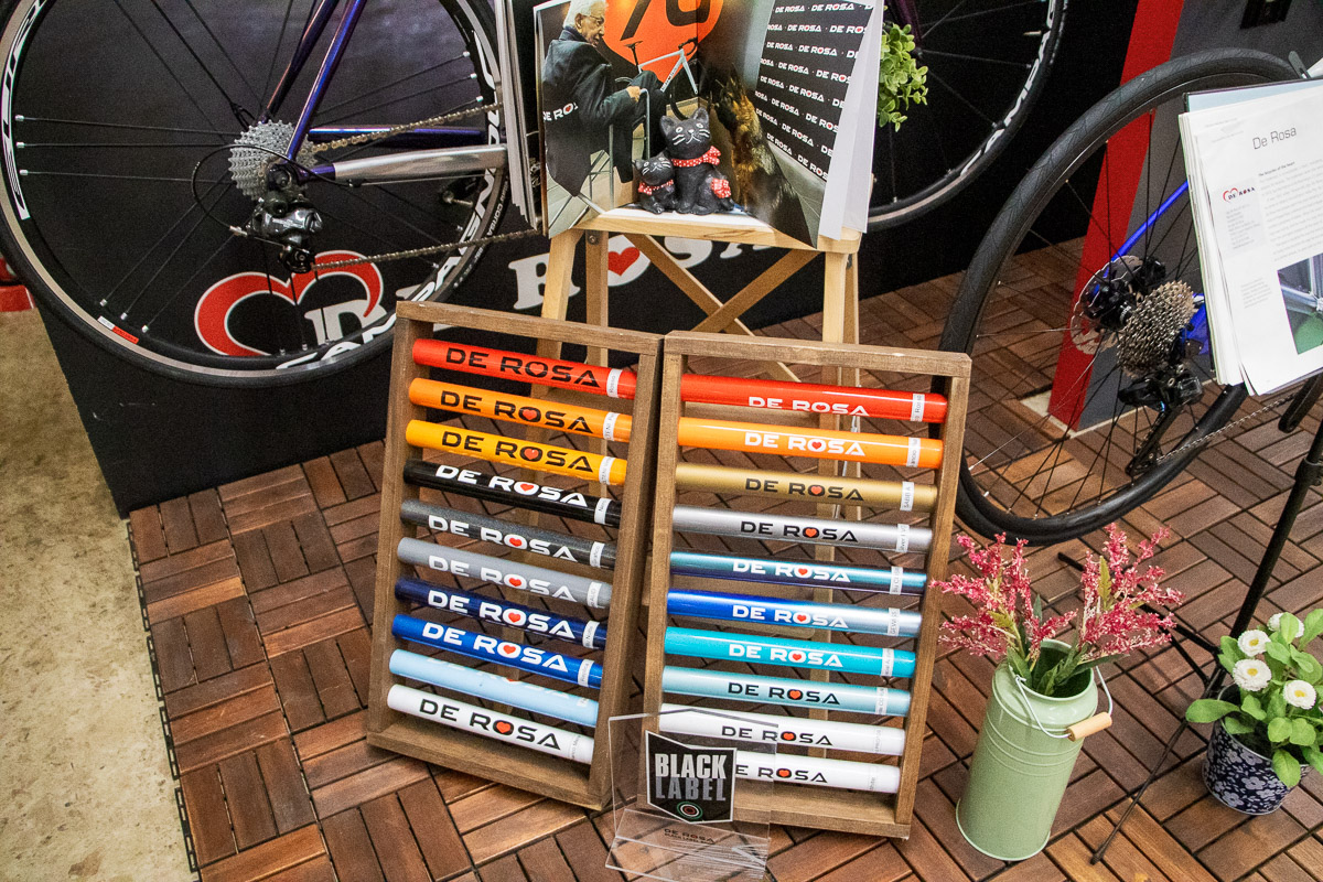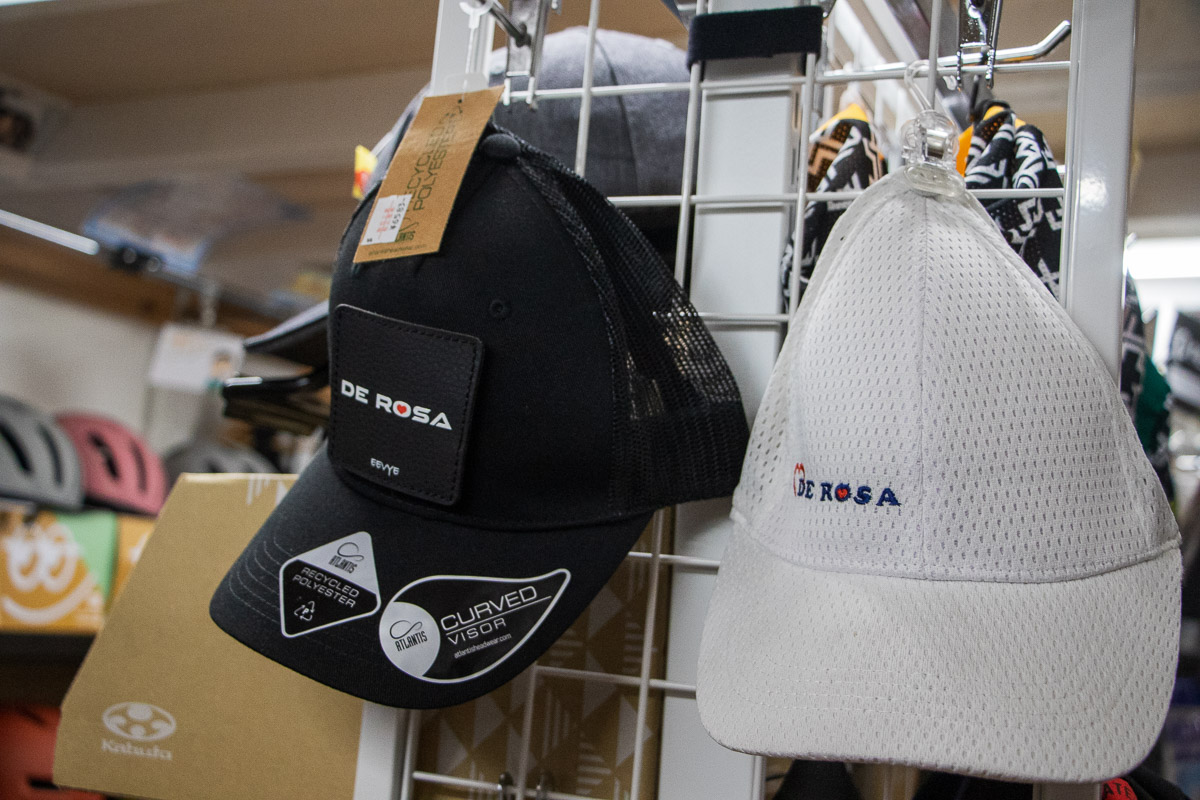 2階の一角に設えられたデローザコーナーには、森井さんがデローザの本社に訪れた際の写真や貴重なジャージなどがズラリ。同社の金属フレームのオーダーシステムであるブラックラベルのカラーサンプルもディスプレイされており、実際にオーダーしたいという方もしっかりイメージできるようになっている。
