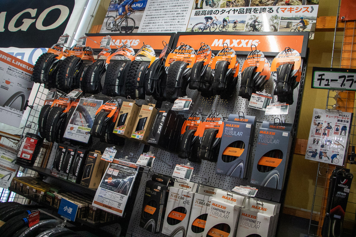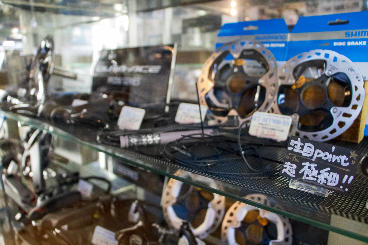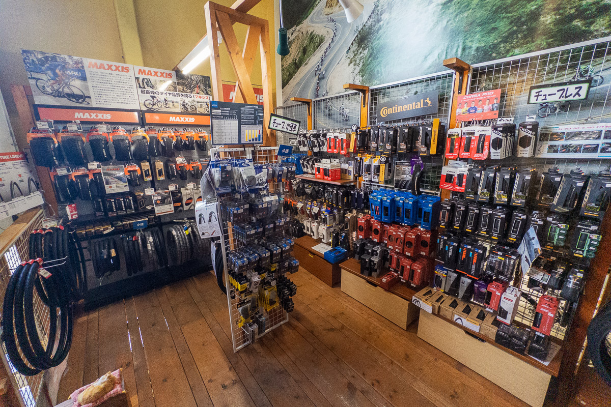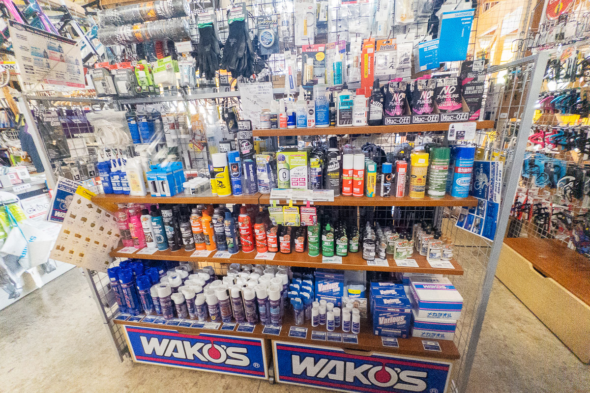さて、店舗を見渡せば、カウンターの奥側にある、4〜5名が同時作業できるほど広いメカニックスペースに気づくだろう。壁やツールボックスにはあらゆる作業に対応できるよう無数の工具が用意され、緊急の駆け込み作業に対応できるよう、シマノ、カンパニョーロ、スラム関連の補修パーツ類も非常に多い。
