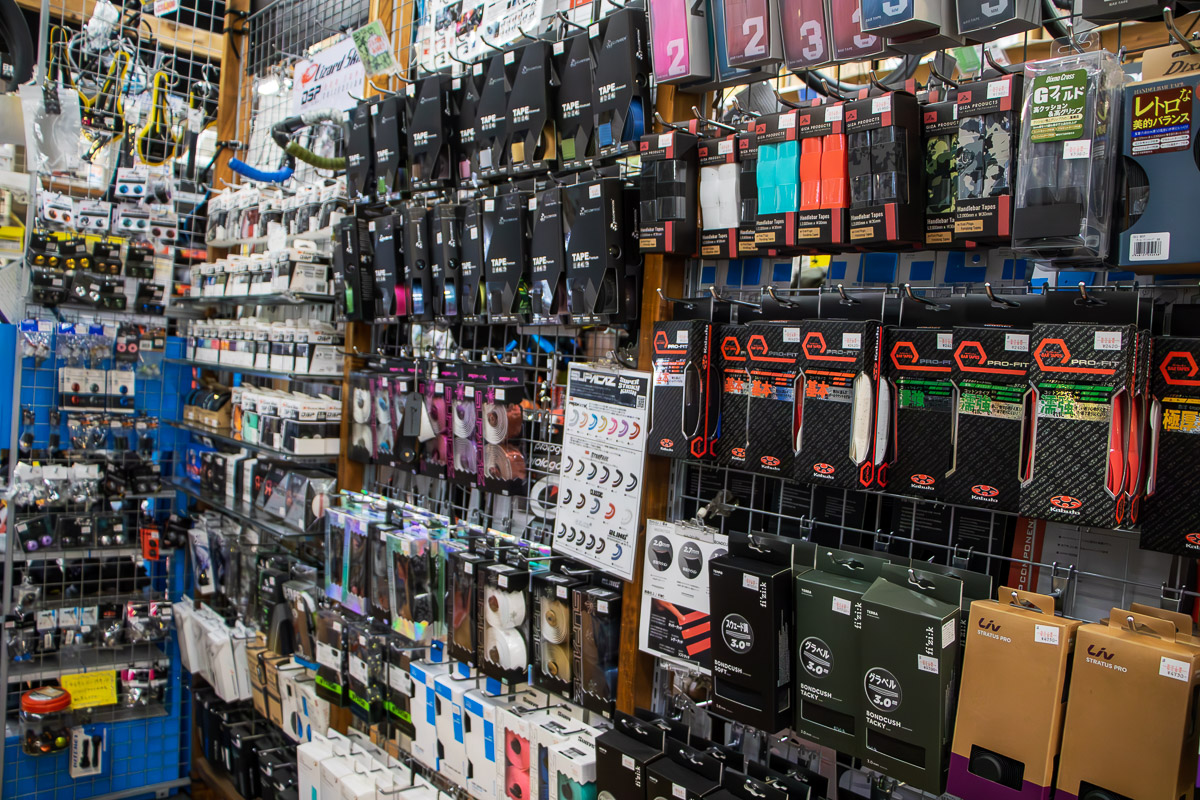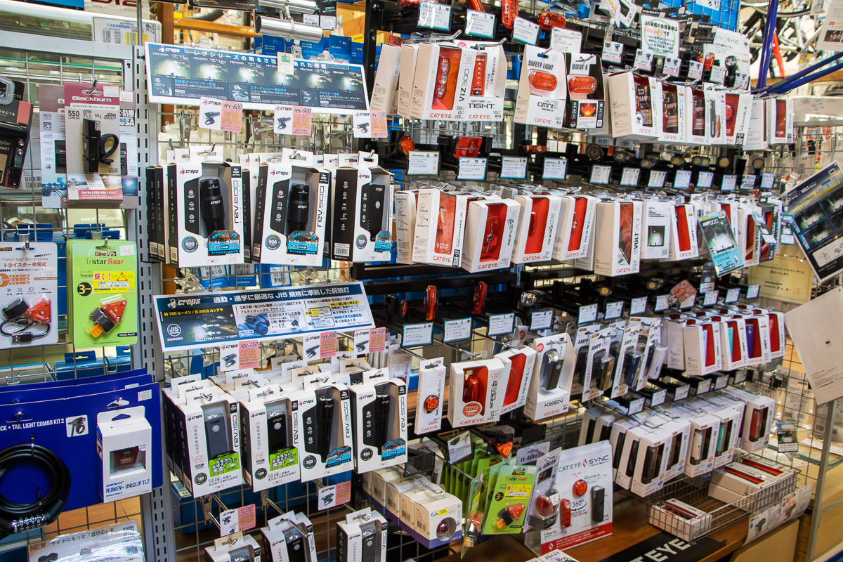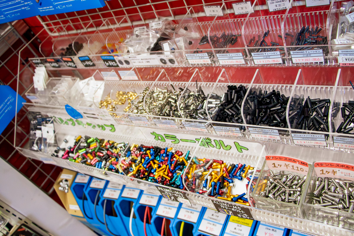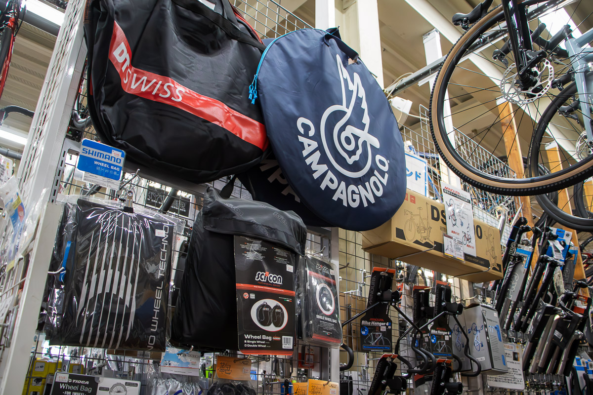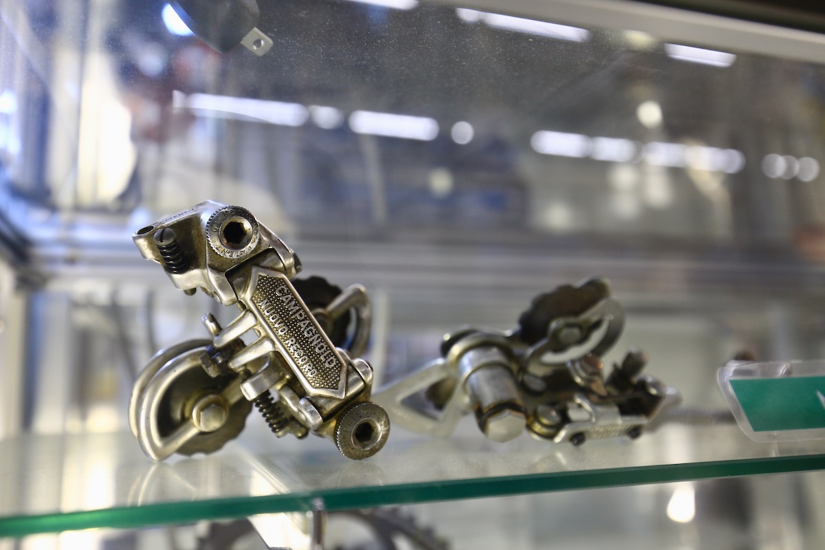 さて、店舗を見渡せば、カウンターの奥側にある、4〜5名が同時作業できるほど広いメカニックスペースに気づくだろう。壁やツールボックスにはあらゆる作業に対応できるよう無数の工具が用意され、緊急の駆け込み作業に対応できるよう、シマノ、カンパニョーロ、スラム関連の補修パーツ類も非常に多い。