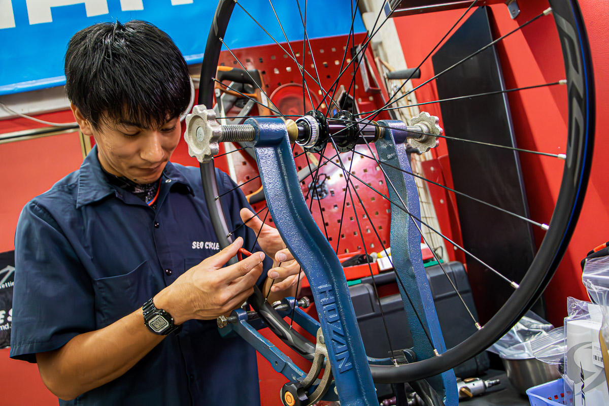完成車が入荷してきた場合は当然各部のチェックを怠らず、ワイヤー長を適正値に調節し、グリスアップと増し締め、当たり調整を行ってからユーザーの手に渡る。金属フレームの場合はBBやヘッドなどのフェイシングやタップ立てなど、もうひと手間をプラス。メカニックスペースは売り場に向けてオープンとなっており、自分の愛車が仕上げられていく様子を確かめられることも安心に繋がるポイントだ。「”お客様に安心安全を、社員にも家族にも安心安全を”、というのがセオサイクルの会社方針。当たり前のことですが、自転車のプロとして当然ですよね」と、森井さんは話す。