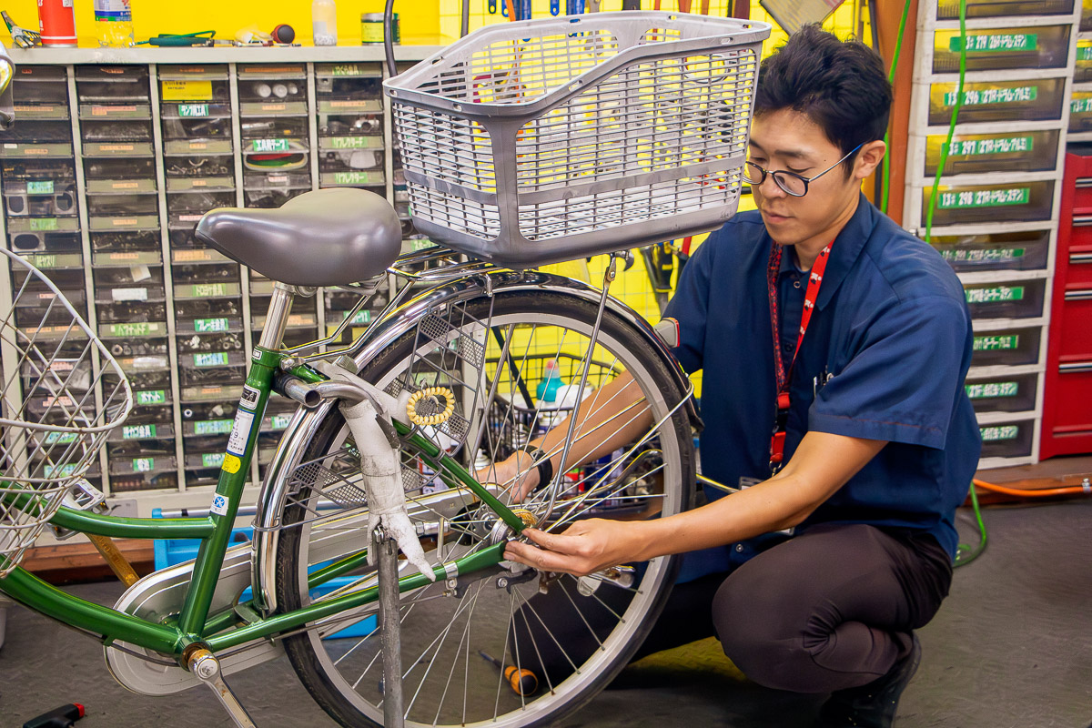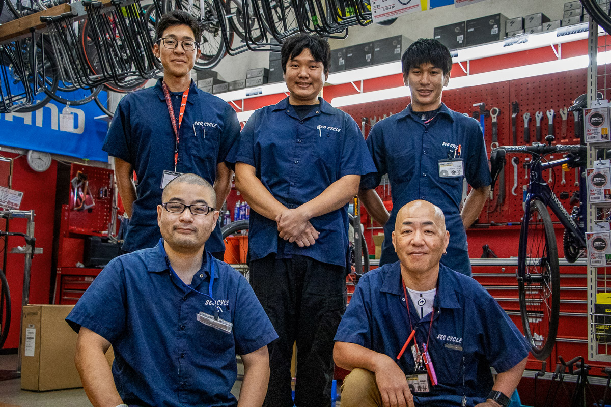 在籍するスタッフは、スポーツバイク部門と一般車部門を合わせて5名。全員が自転車を楽しみ、接客も整備作業もドンと来いのマルチタレント揃い。学生時代は競技に情熱を燃やしていた人、ツーリング派、トライアスリート、サイクルデザイン専門学校でフレーム作りを学んできた人など、それぞれ得意分野の違う様々な人材がバイシクルセオ新松戸店には揃っている。
