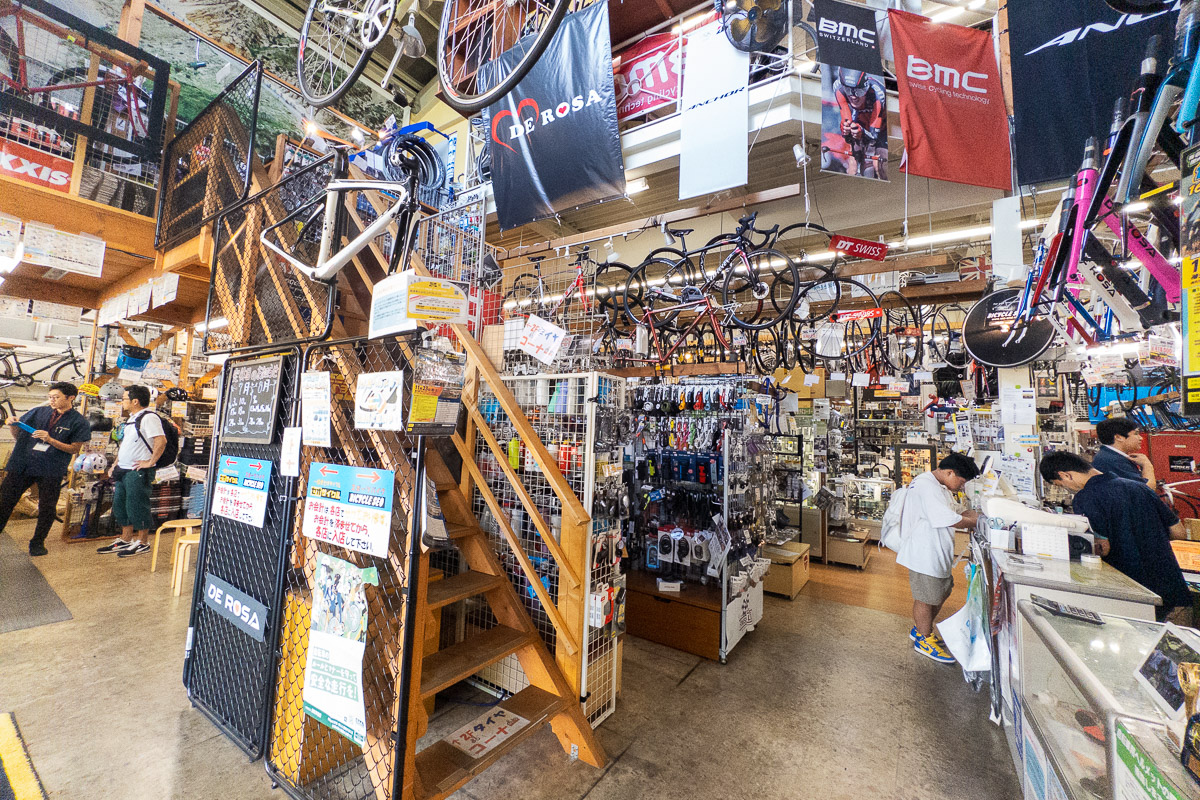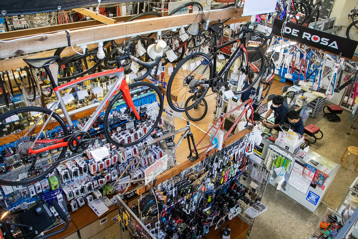 ドアをくぐって圧倒されるのが、その広さと圧倒的な在庫商品の数々。1階と2階合わせて160坪という売り場には、ロードバイクはもちろん、クロスバイクやMTB、ミニベロやE-BIKEまで常時250台もの在庫が用意されている。そして、パーツ、消耗品、アパレル、ヘルメット、シューズ、アクセサリー、そしてトレーニング機材やバイクラックまで、ありとあらゆる製品がフルボリュームで準備されており、あらゆるニーズを満たしてくれる。最新バイクやパーツだけでなく、よく目を凝らせば絶版パーツや、オールドカンパといったコレクションの数々もあって、その規模は首都圏ではあまり類を見ない。