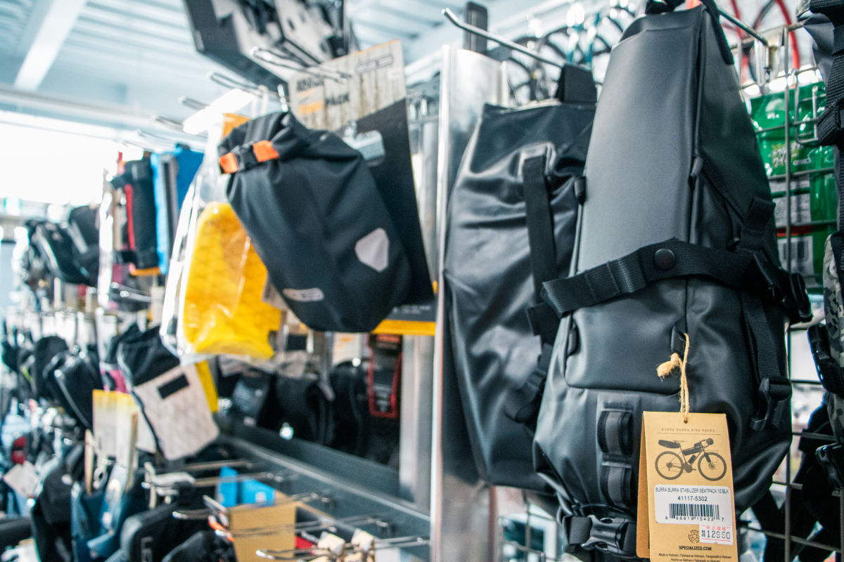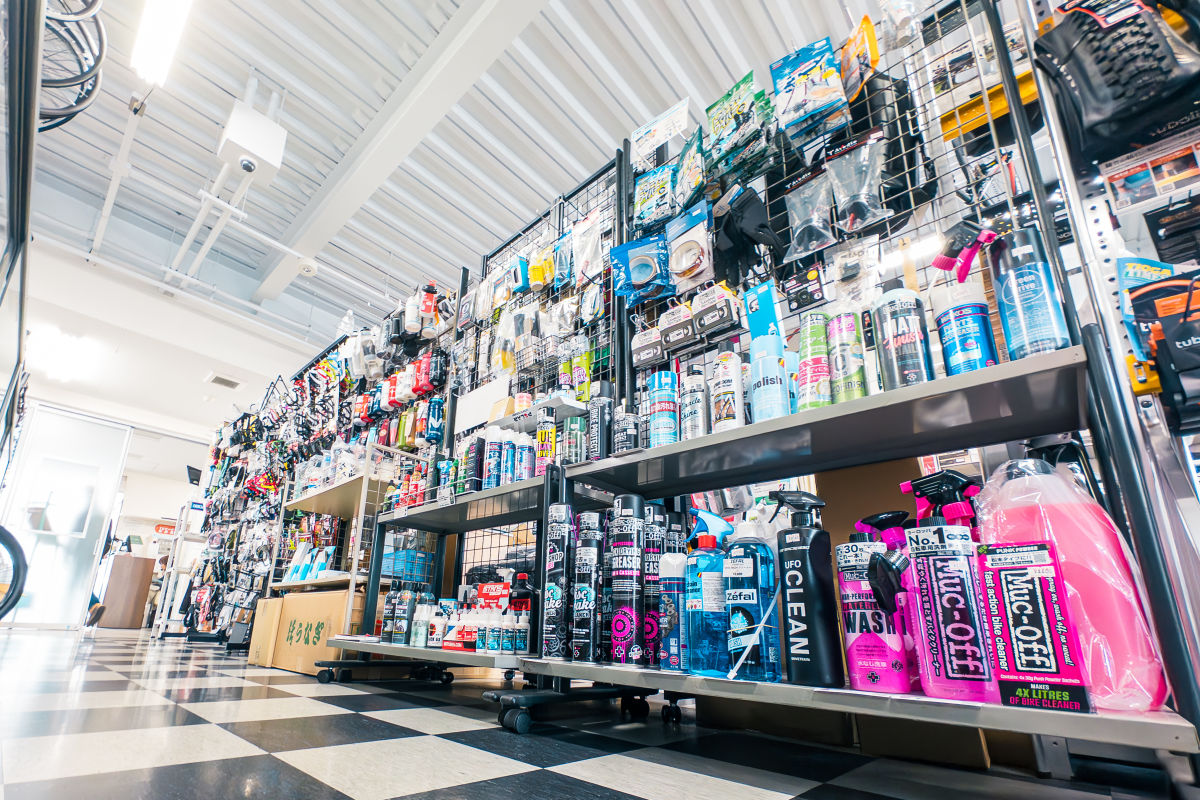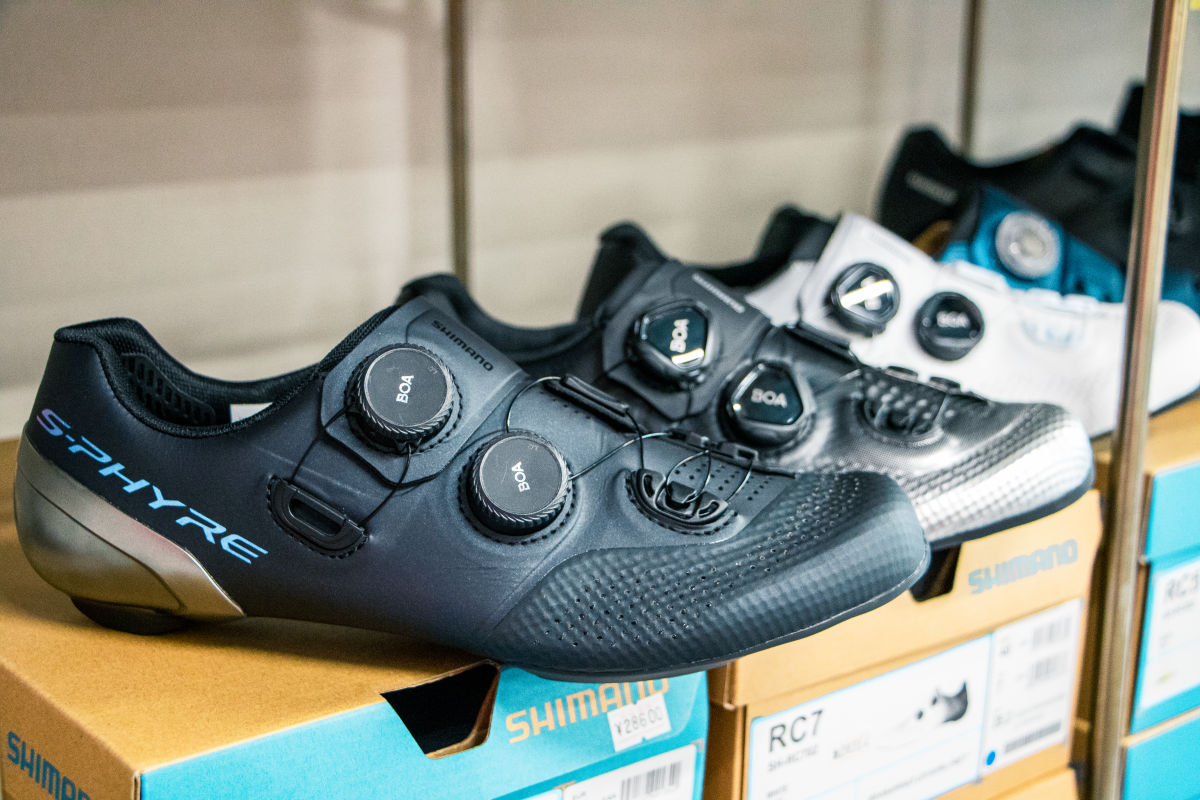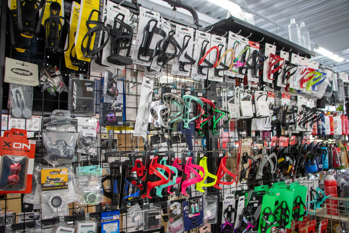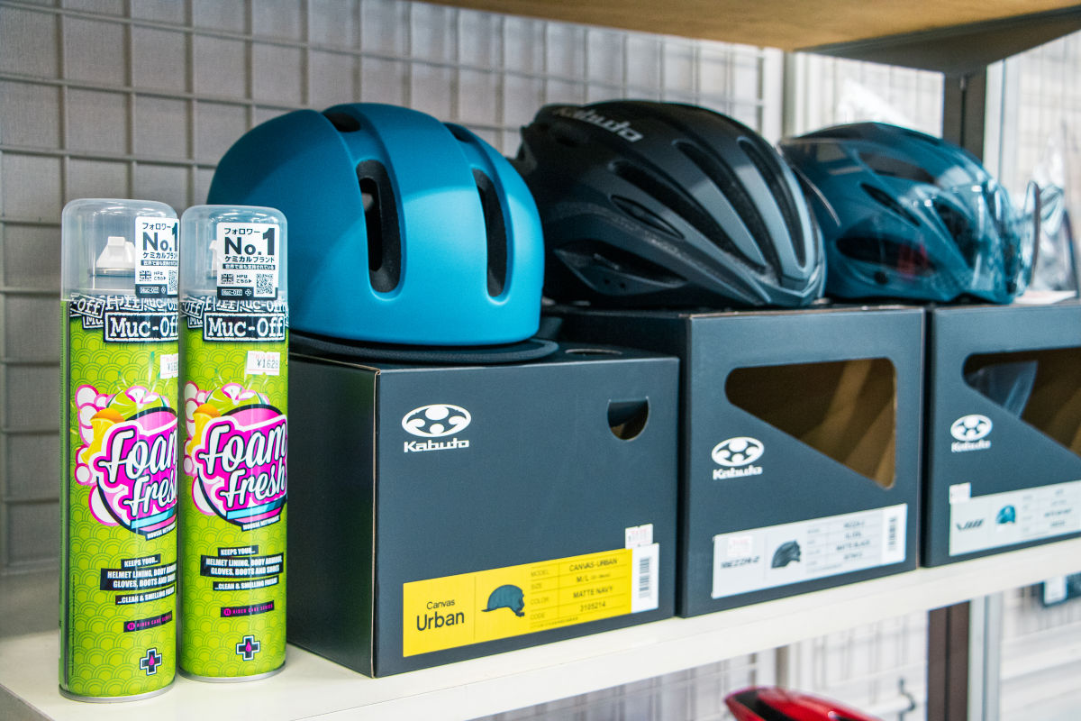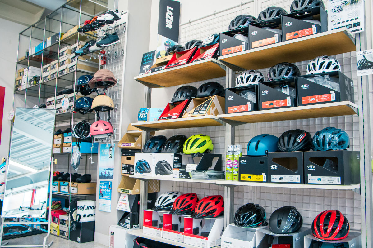 用品の充実度は高い。シューズはシディ、ジロ、シマノ、マヴィック等を扱う。「ロード、MTB,シティなどすべての用途に対応できるよう揃えています。サイズのストックもできるだけ多く在庫します。フィットするものを探すには現物合わせしか無いですからね」。