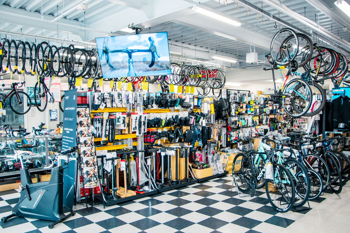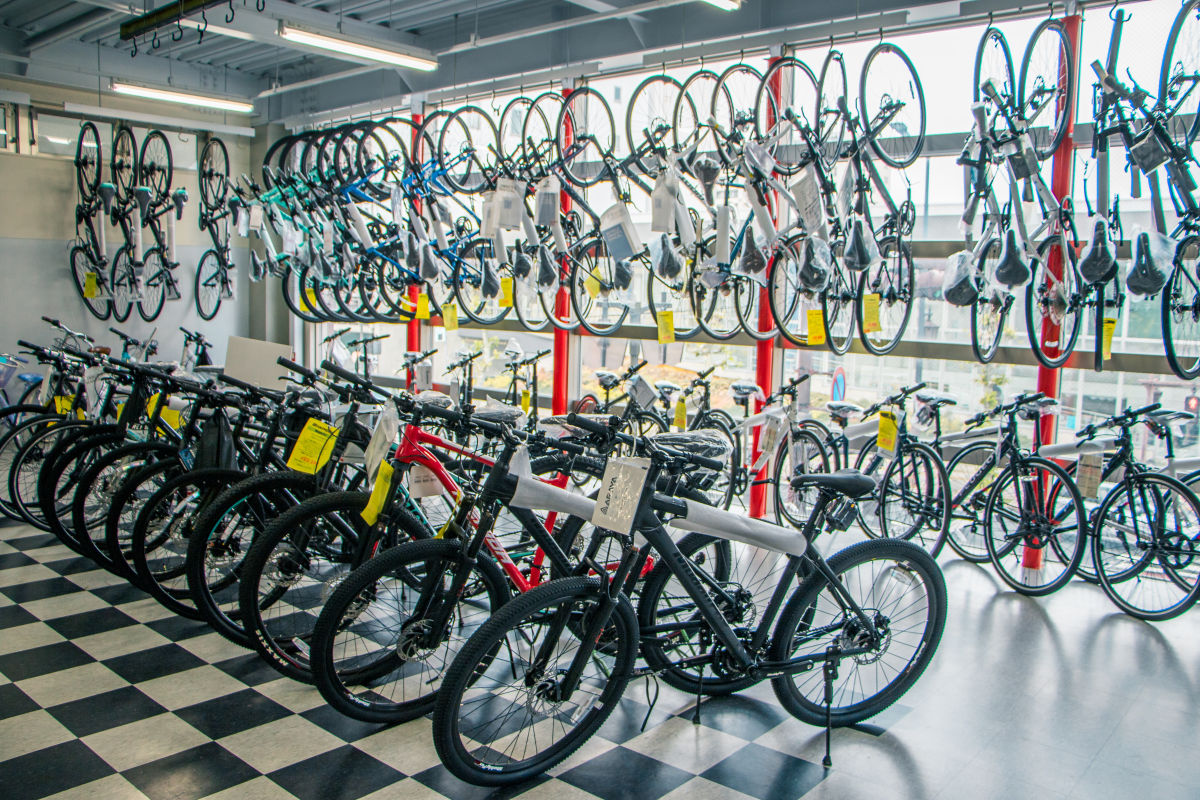 1階はスポーツバイクと関連用品売り場、そして奥にメカニックスペース。現在の取り扱い主力ブランドはトレック、ジャイアント、メリダ、ビアンキ、コルナゴ、アンカー、他にもコラテック、ジオス、フォーカスなど多くのブランドを取り扱う。窓から光が差し込む広々としたフロアにブランドごとにバイクが陳列され、それぞれグレードの違うバイクを比較しながら選ぶことができる。ホイール、シューズ、パーツ、アパレルなど関係グッズもこのフロアに集中させて陳列している。