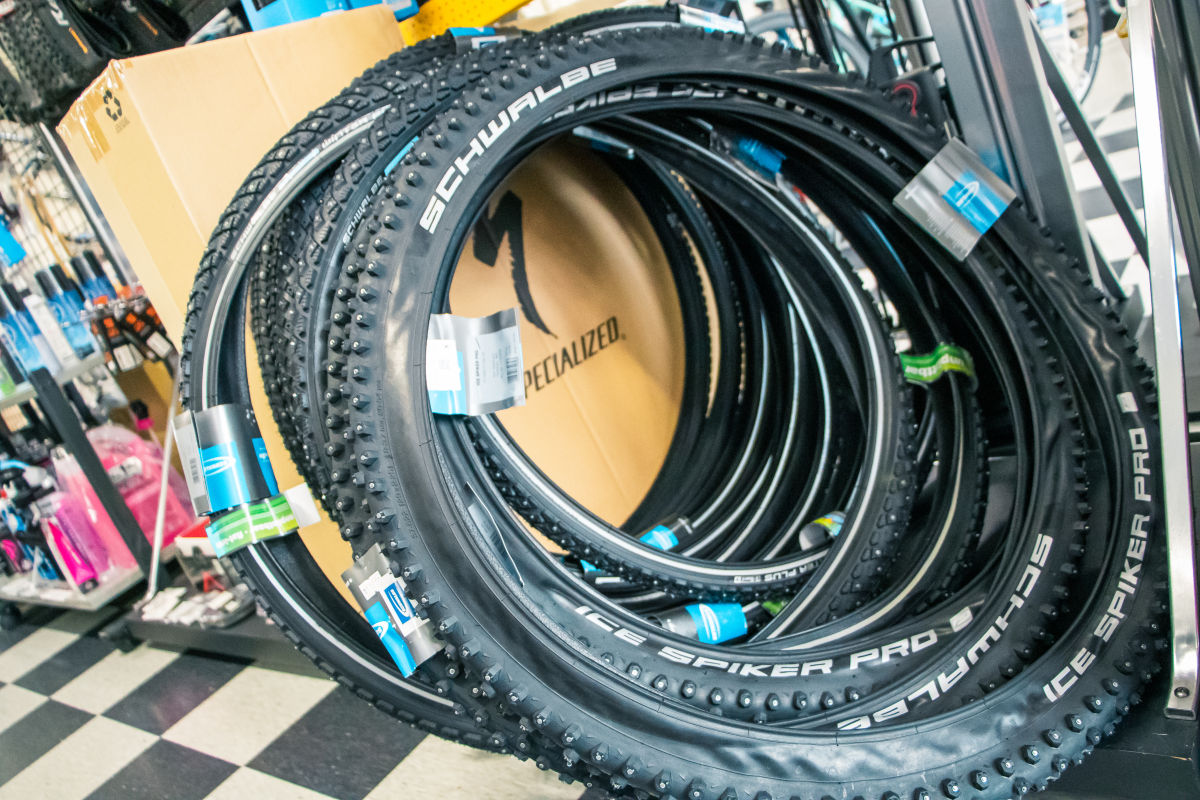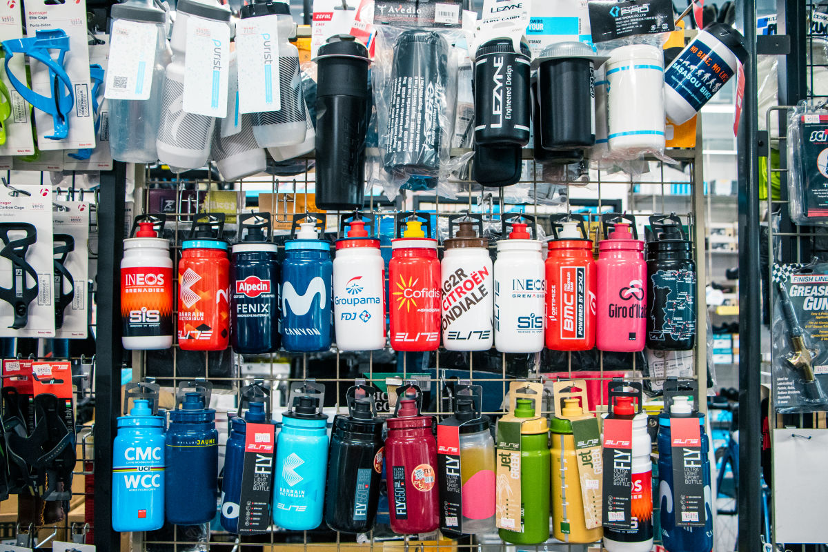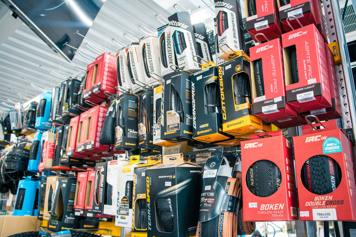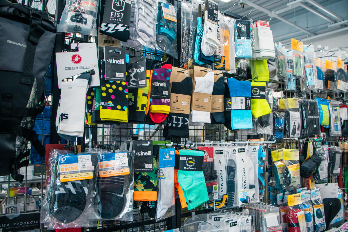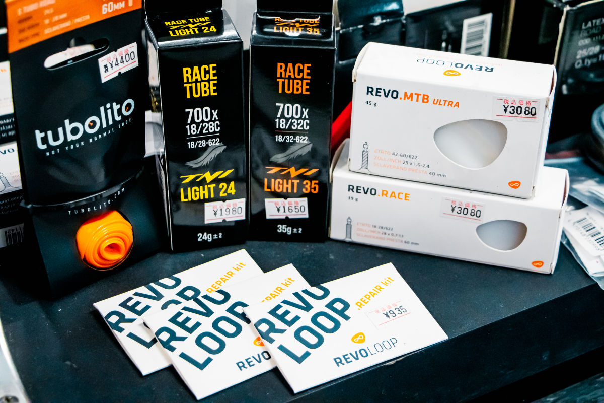 アパレルはパールイズミ、シマノ、マヴィックなど。ソックスはカラフルなものを多く揃えて選ぶ楽しみを。特に、バーテープやボトルケージ、アクセサリーなど「取り替えることでちょっとしたカスタマイズが楽しめるもの」は多くのバリエーションを揃える方針だという。最新のトレンドにも敏感で、TPUチューブなどエンスーなサイクリストが気になるような製品も、複数取り扱い比較検討できるようになっている。