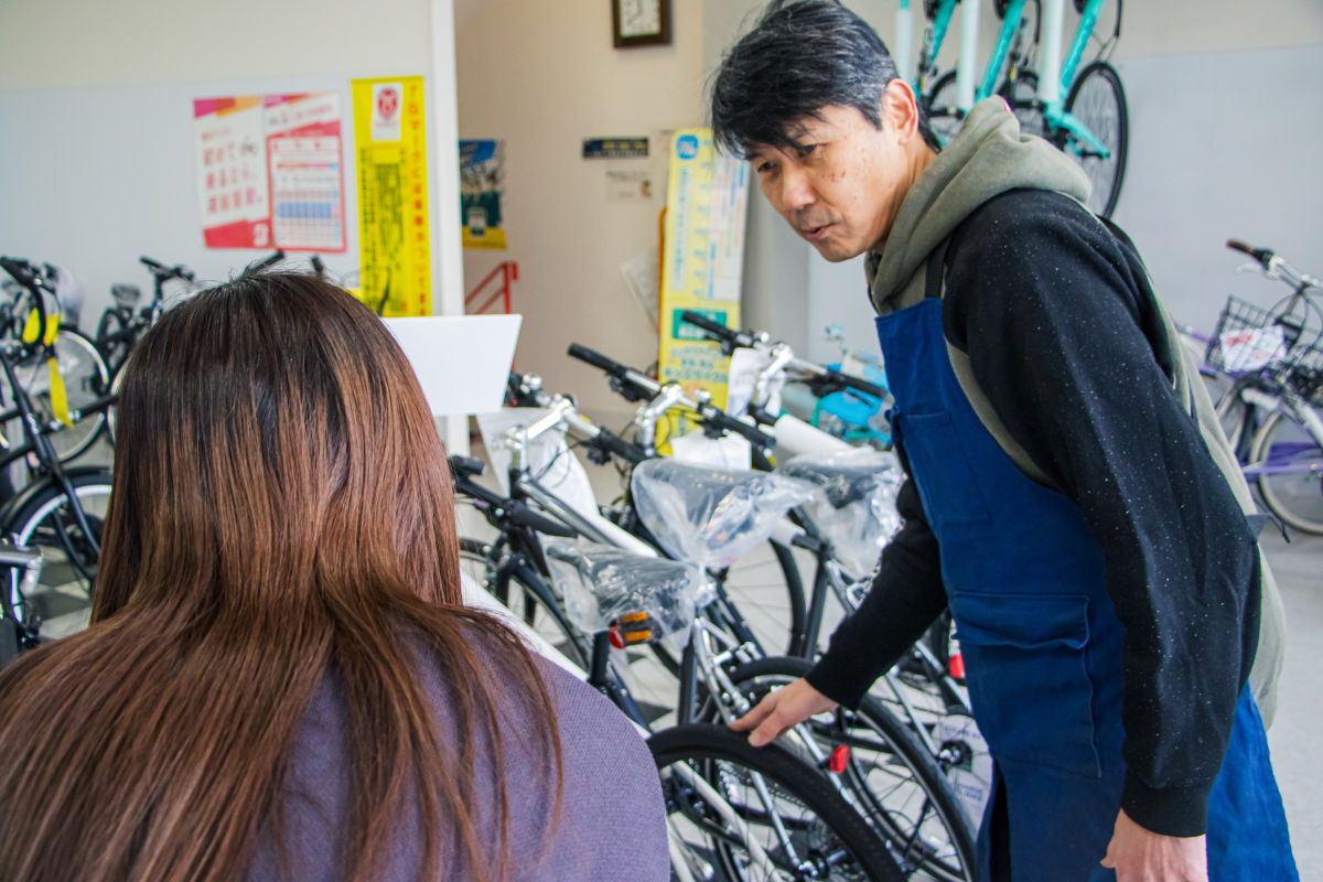各バイクには特徴の説明書きPOPがわかりやすく取り付けられ、店員さんの同伴がなくてもある程度は見分けられるが、接客に力を入れているため、佐々木店長やスタッフが訪れたお客さんの希望を聞きながら、各バイクごとのおすすめのポイントを丁寧に時間をかけて紹介している。そうしてその人にあった自転車を一緒に探していく。