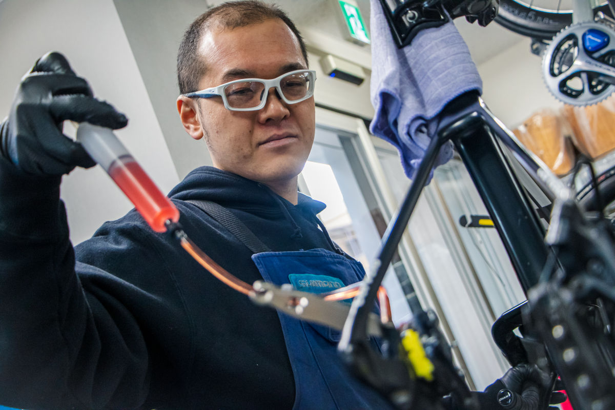 特に、近年スタンダードとなったディスクブレーキバイクの取り扱いにも精通している。しっかりとエア抜きをするのは当然のこと、完成車でもディスクブレーキ台座のフェイシングまで行い、高精度で組み上げる。この作業を行うことで、ローターとパッドの接触やそれに伴う音鳴りの発生リスクも大幅に低くなる。上質なライドのためには欠かせない工程だ。