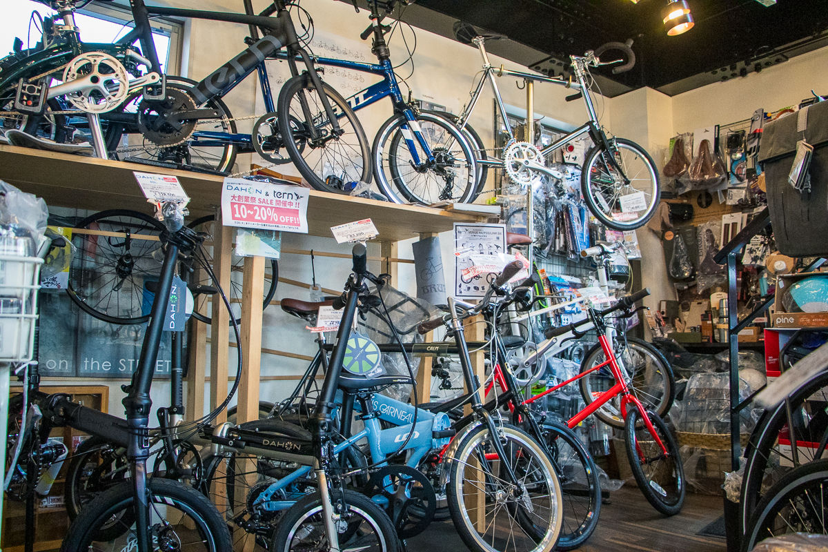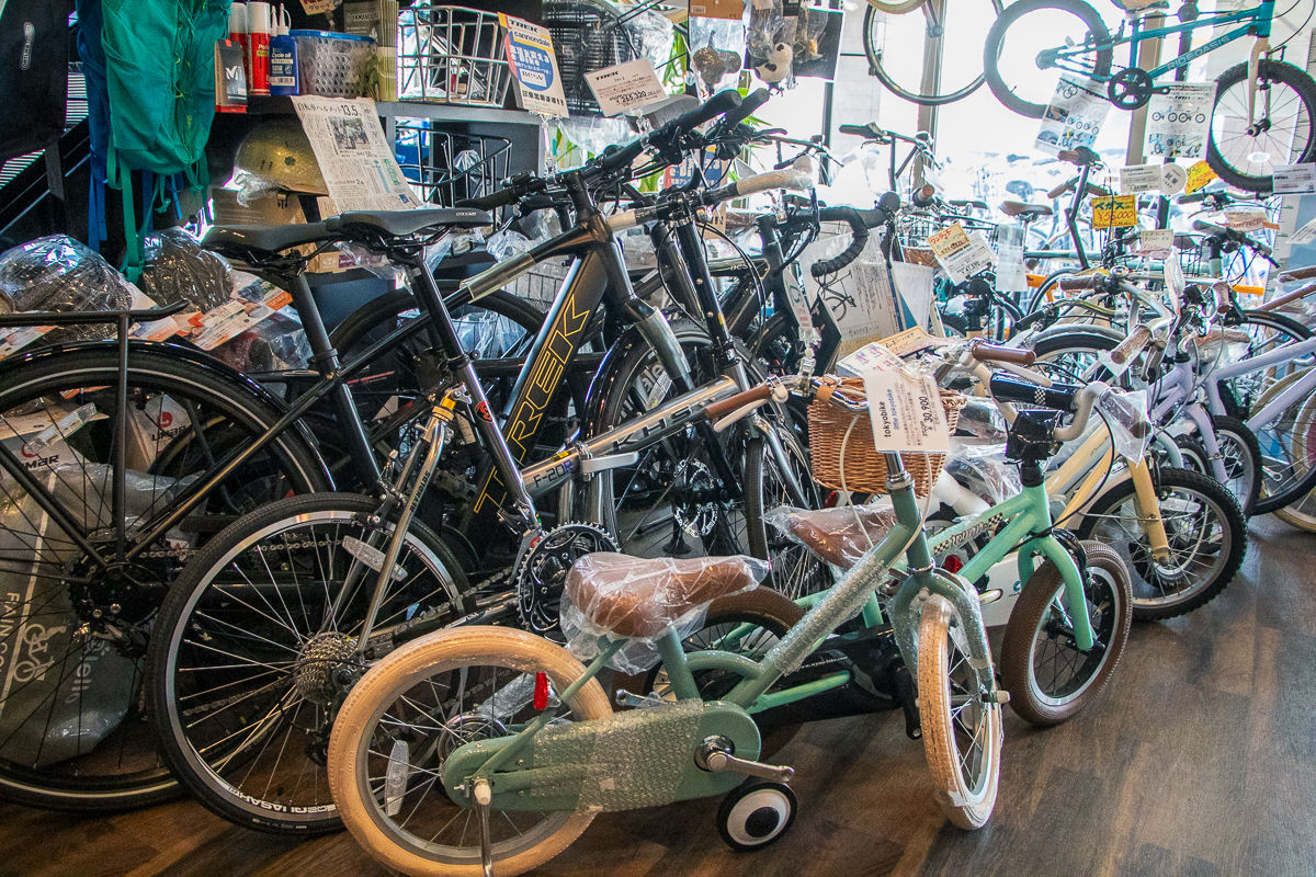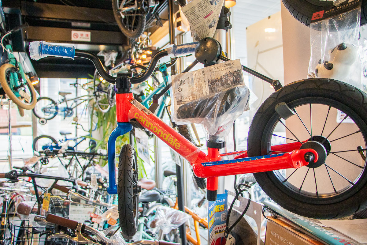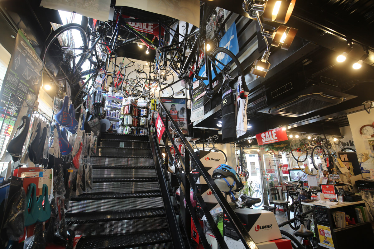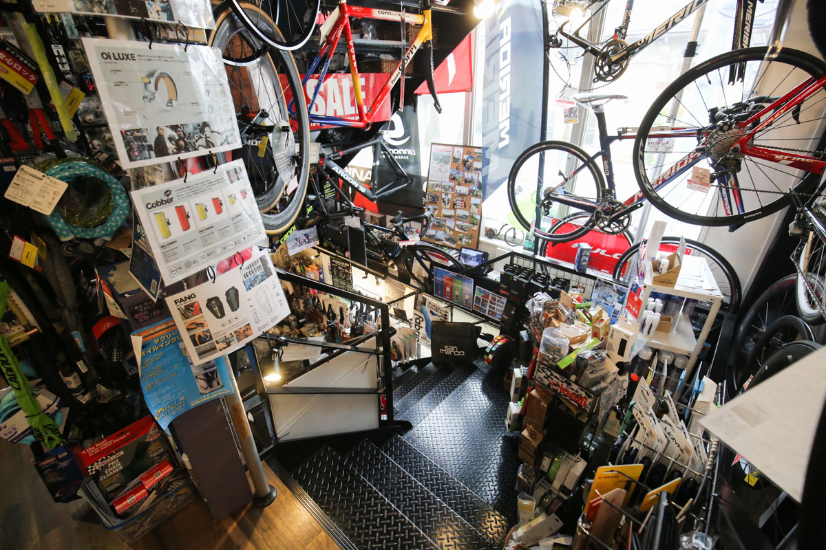 真新しい建物に足を踏み入れると、1階には街乗り向けのミニベロやキッズバイク、さらにはE-BIKEが。フロアの奥にある階段をトントンと上がると、そこにはスポーツバイクの「おもちゃ箱」のような空間が広がっていた。