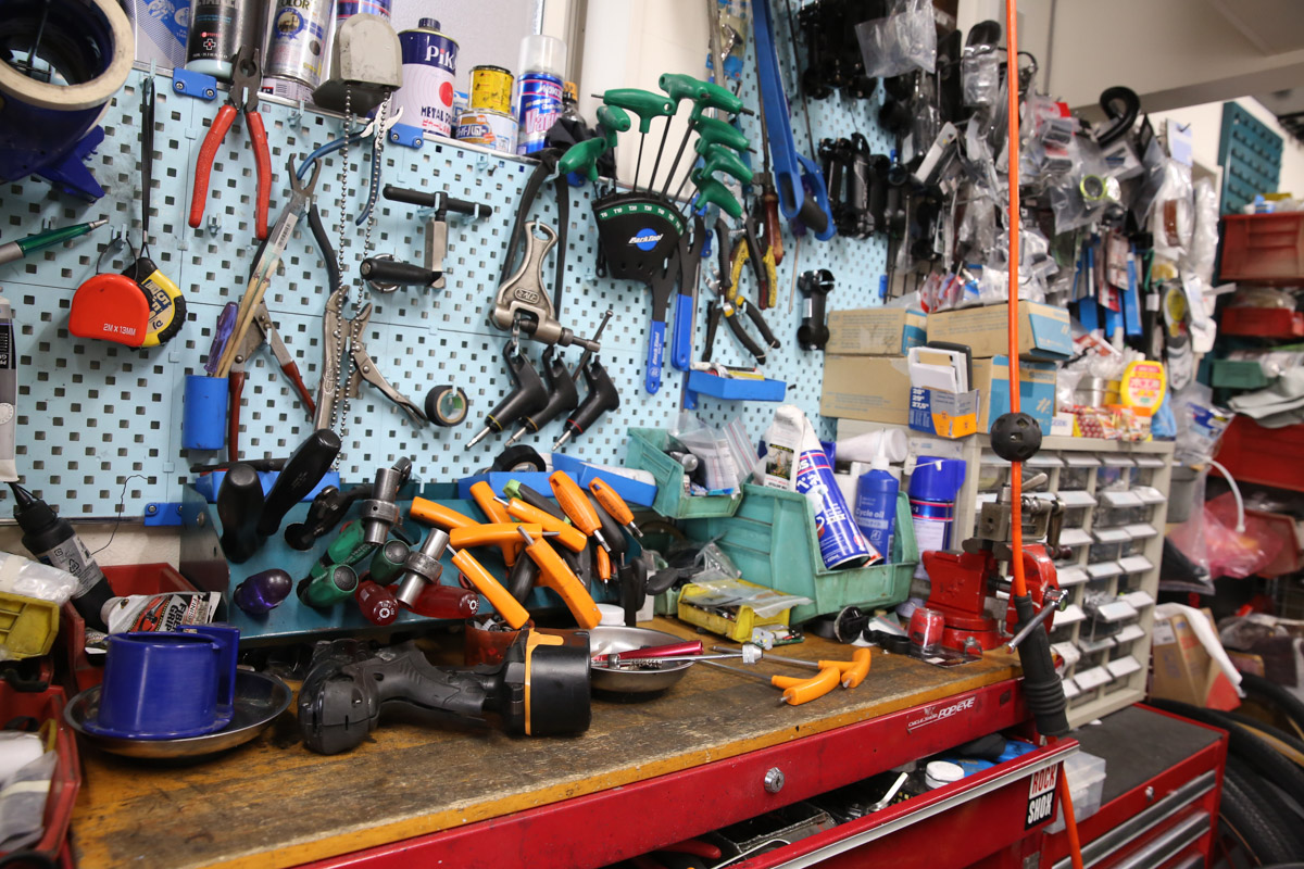 もちろんメカニックの腕は折り紙付き。40年近い経験を持つ親父さんと、その薫陶を受けた2代目がテキパキと作業をこなす様は見ていて気持ちいいほど。取材日は平日で、地元のお客さんが軽快車の修理に訪れていたが、あっという間に修理を終える手際の良さは脱帽もの。高い精度で作られるスポーツバイクよりも、一般車のほうが作業の難易度は高いとも言われるのだから、その技術レベルの高さは容易に察せられる。
