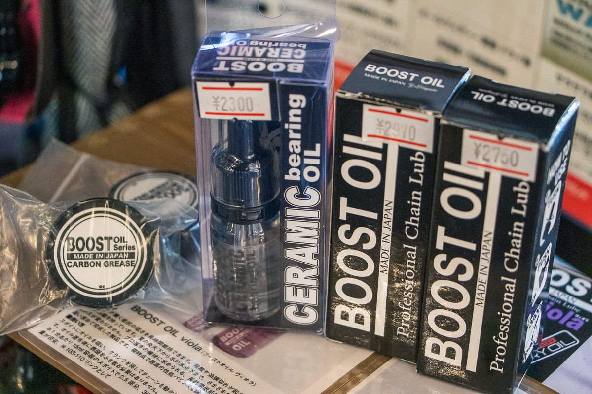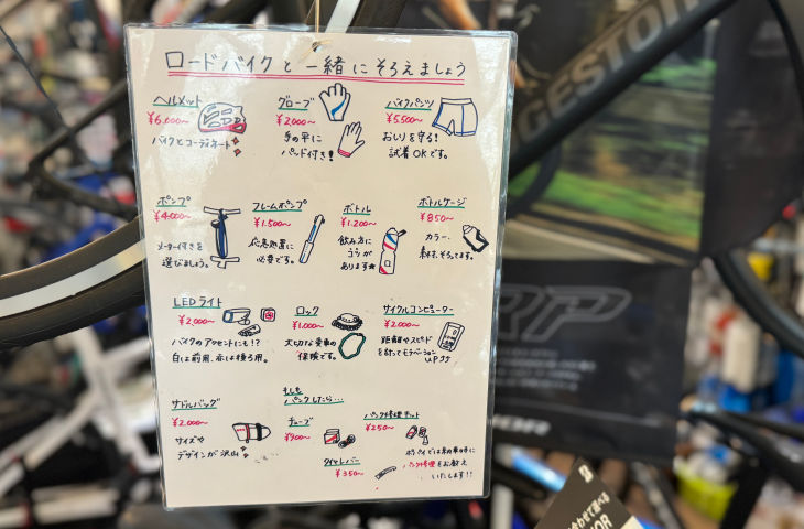 陳列されるバイクやパーツには、店長の奥さんによる手書きのPOPが貼られており、それぞれの特徴もわかりやすい。もちろん、バイクだけでなくパーツやアパレルの在庫も豊富に取り揃えられている。「まずは自分が使ってみたいと思えるようなモノであることを基準に仕入れています」というように、店長の目利きが光るラインアップだ。
