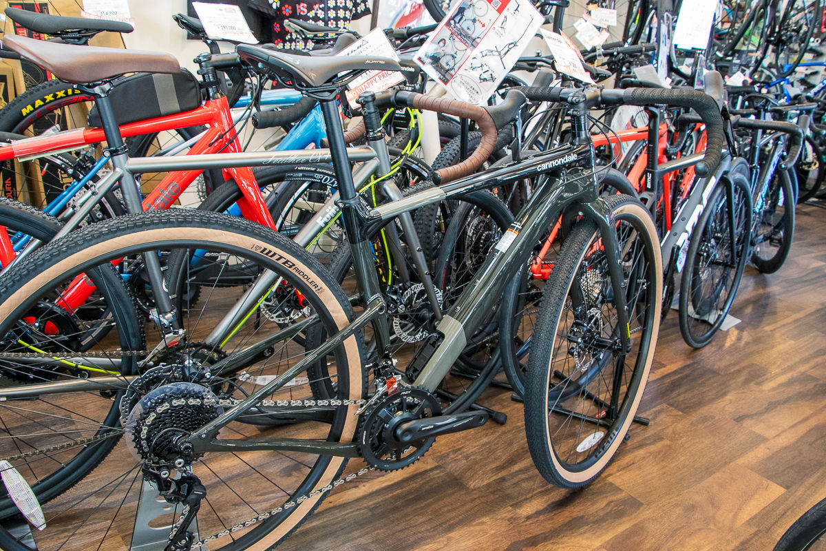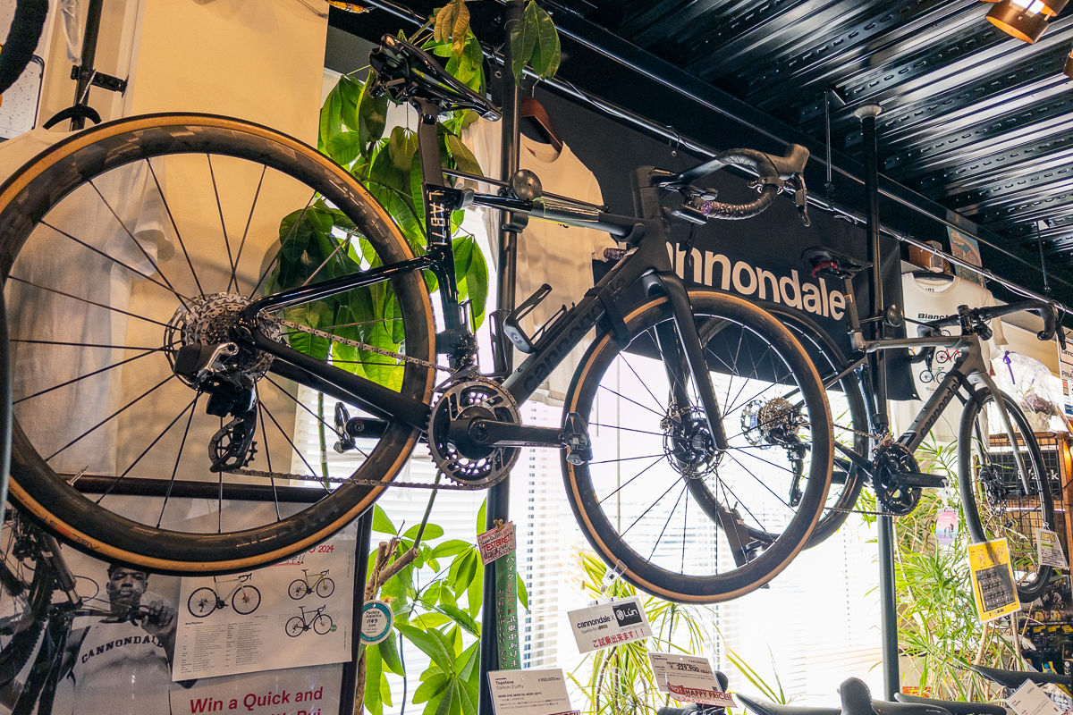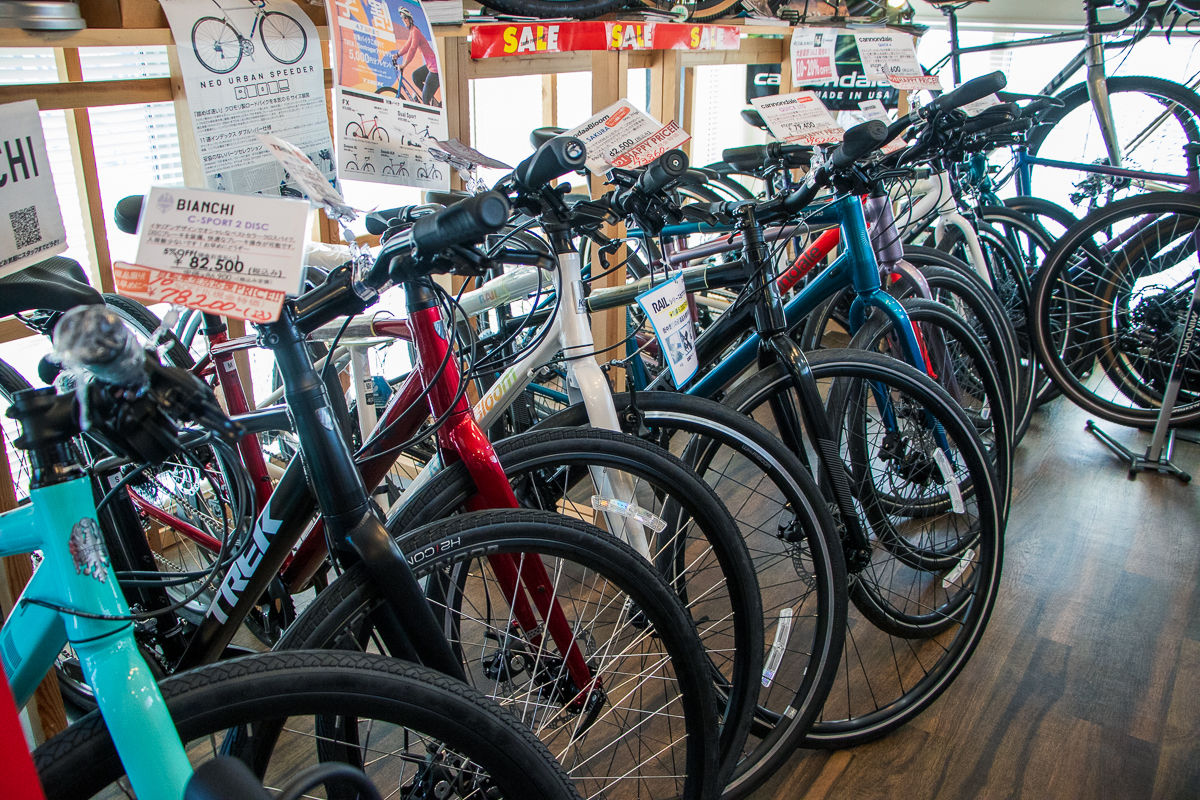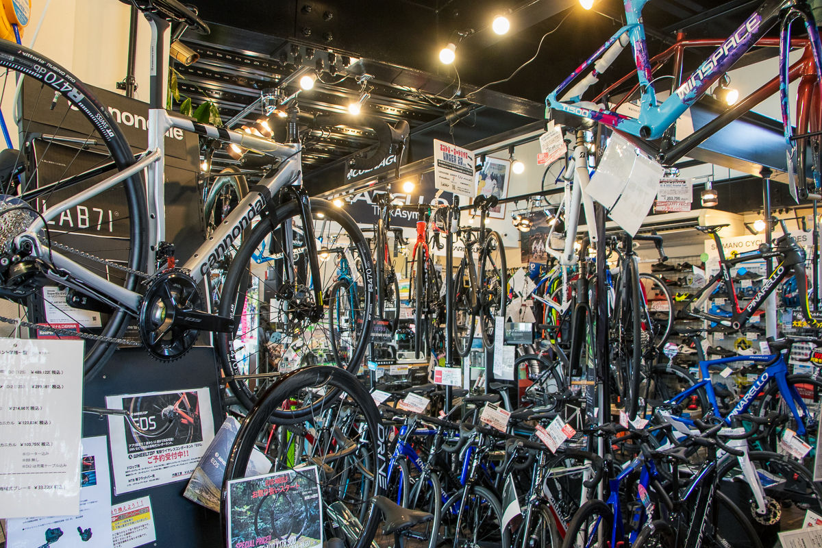 所狭しと並べられたスポーツバイクたち。割合としてはロードバイクが7割、クロスバイクが2割、MTBが1割といったところだろうか。よくぞこれだけ並べたな、と思ってしまうほどの密度で名だたるブランドのバイクたちが陳列されている。