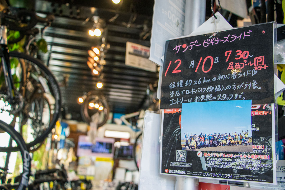 初心者に向けては月一で「サンデービギナーズライド」を開催。市内を流れる木曽川沿いの河川敷など、交通量やアップダウンの少ないコースを約30kmほど走り、ブレーキの掛け方や変速の方法など、スポーツバイクの基本的な走り方をしっかり学ぶことが出来るライドとなっている。年に2回ほど開催される、琵琶湖や岐阜の山々などを巡るライドでは、ベテランのメンバーやショップのサポートカーがしっかりとサポートに回ってくれ、ロングライドデビューにも不安はない。