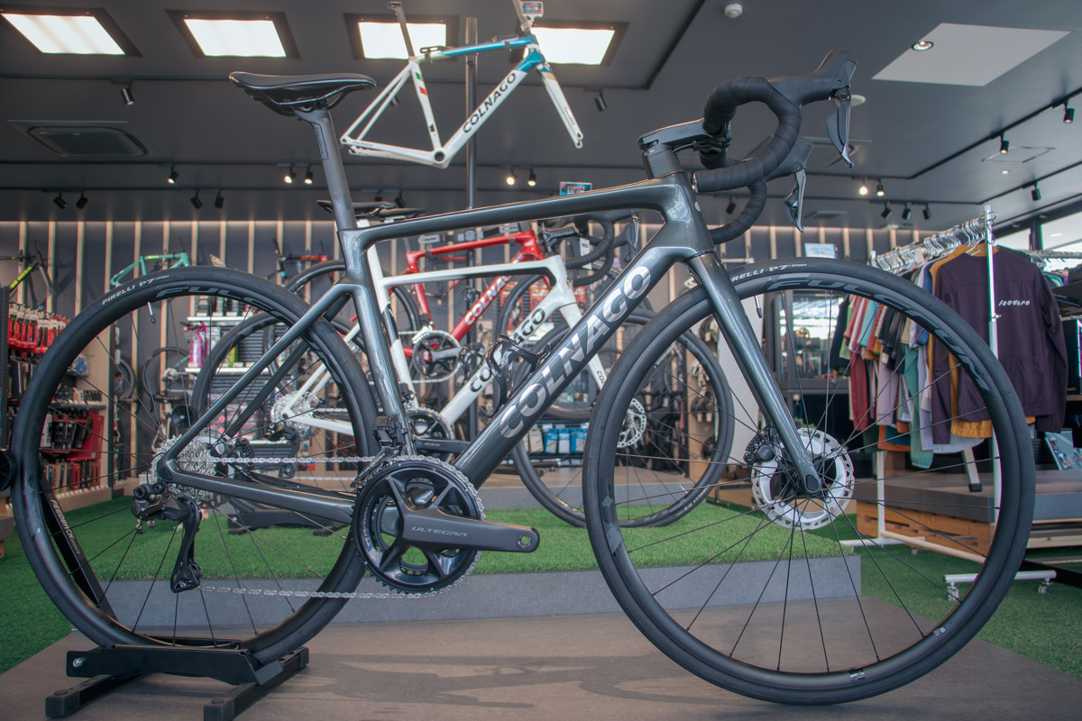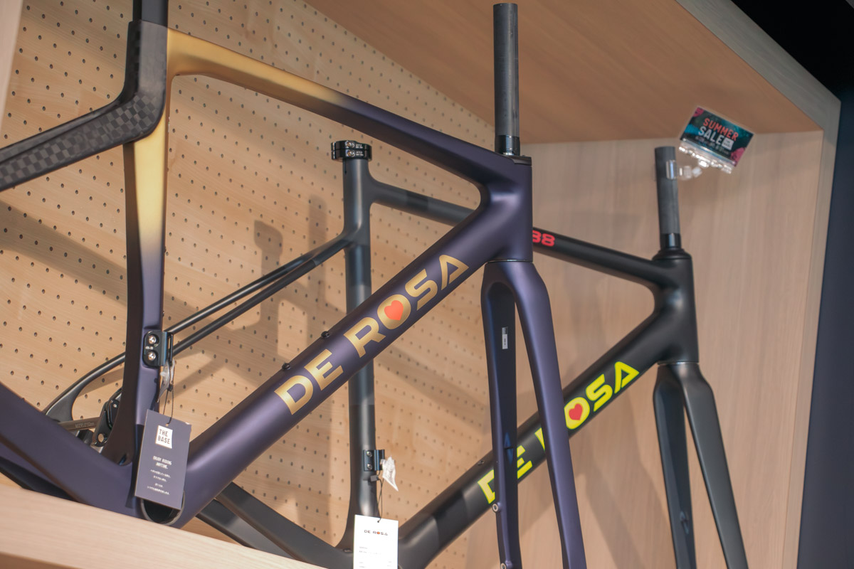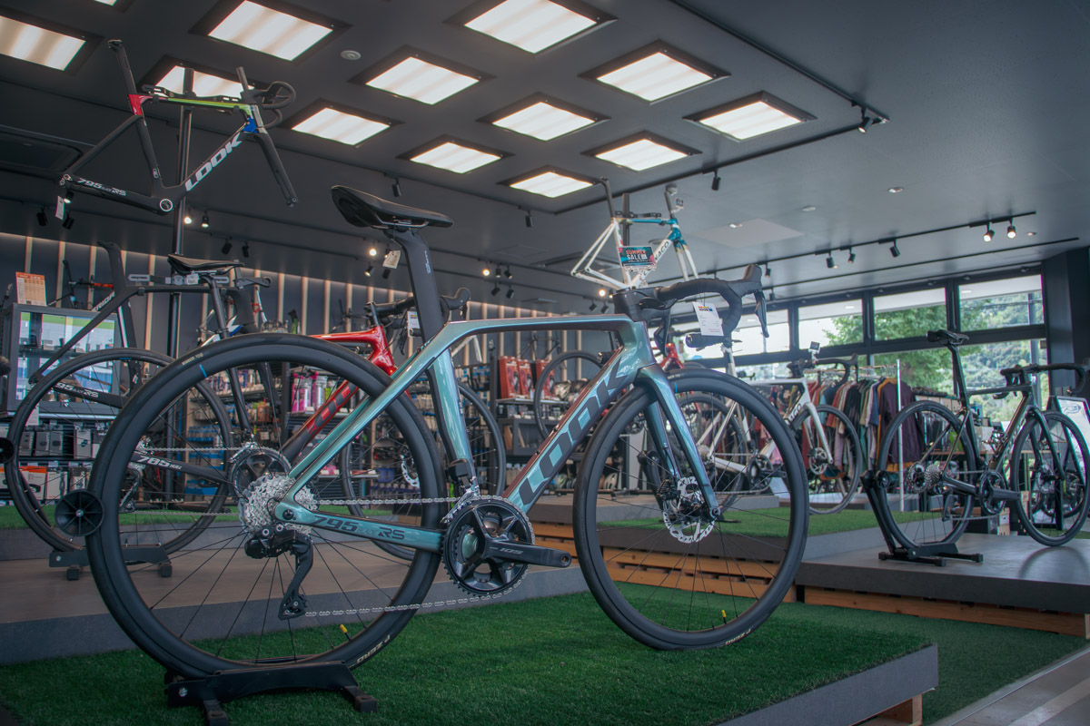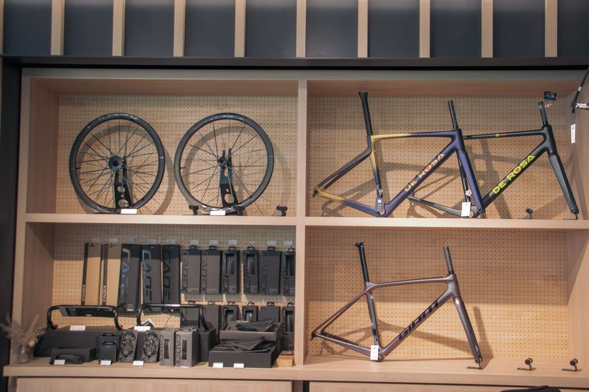 初心者でも安心して店内を回遊できる雰囲気がある一方で、並べられているバイクやパーツはこだわりを持ったセレクトが光る。コルナゴやデローザ、ルックといったサイクリスト憧れのヨーロピアンバイクが広々とした空間でスポットを浴び、壁面にはビアンキやジャイアント、メリダといった定評あるブランドが並ぶ。