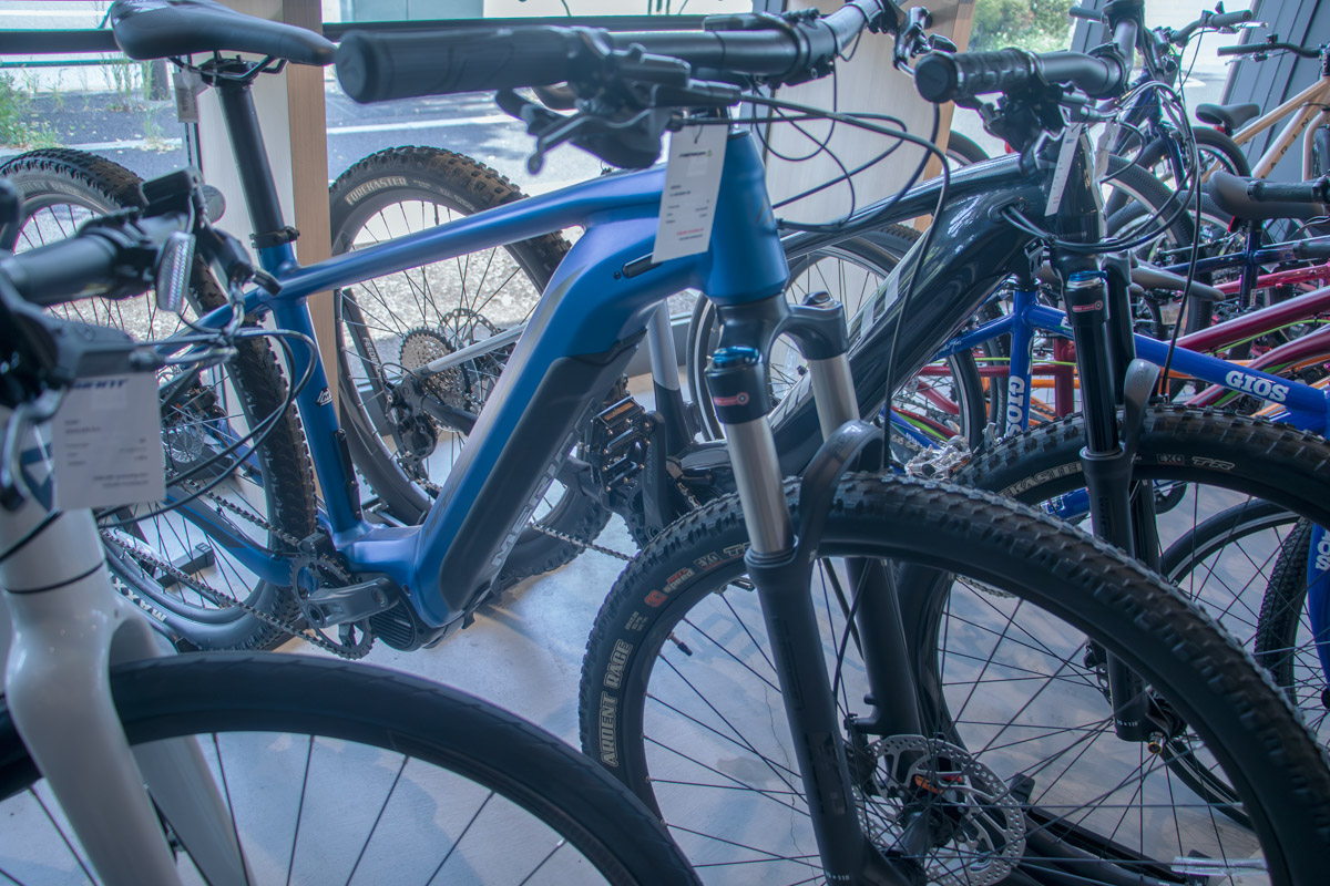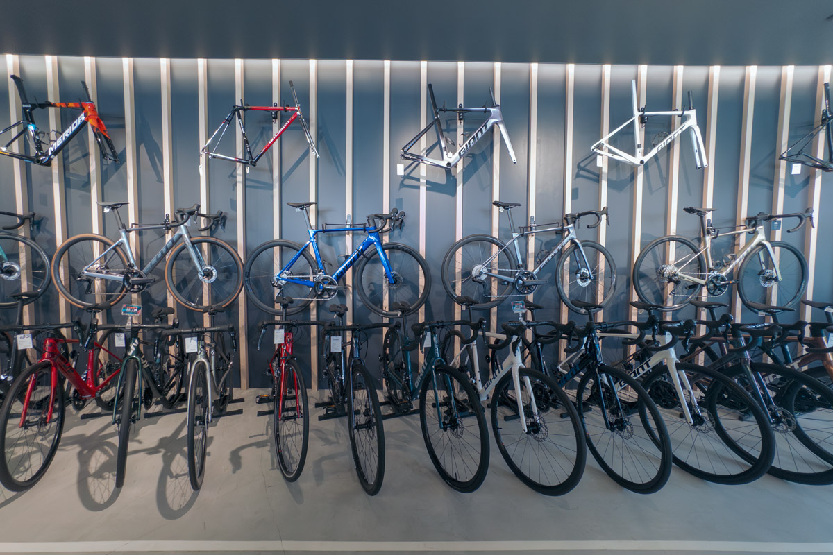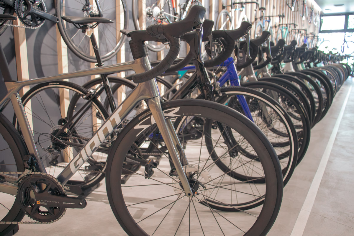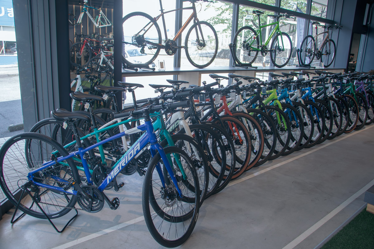 価格帯はハイエンドからエントリーまで万遍なく。ロードバイクをメインとしつつ、昨今流行のグラベルバイク、シクロクロス、MTBにE-BIKE、クロスバイクやキッズバイクまで、幅広いカテゴリーのバイクが計100台以上用意されているが、不思議なことに大量の自転車が並んでいる圧迫感はない。
