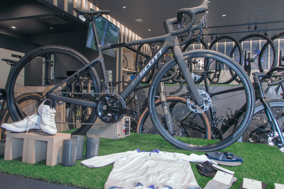 一言で言えば、敷居が低い。洗練されているけど押しつけがましいことはなく、プロショップにありがちな猥雑さが脱臭されたクリーンな店内は、初めてスポーツバイクの世界に触れる人を優しく受け入れてくれるだろう。それでいて、店内に並べられた製品を見渡すとハイエンド製品やマニア心をくすぐる品揃えも目を惹く。間口は広く、敷居は低く、それでいて奥は深い。店内をぐるっと見渡した第一印象は、そんな二面性だ。