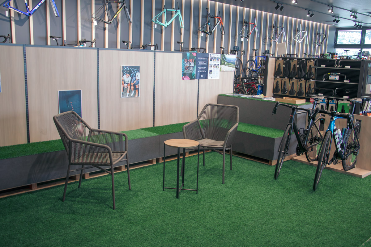 走り終えた後には、店外と店内それぞれに設けられたフリースペースが活躍する。「私たちのイベントは、特に参加条件が無いんですよ。お店で自転車を購入していただいた方でなくても、自由に参加してもらえます。初対面の方も多いのですが、走り終えた後にライドしたメンバー同士で更に交流してもらえるように、テラスやスペースを用意してるんです」という。