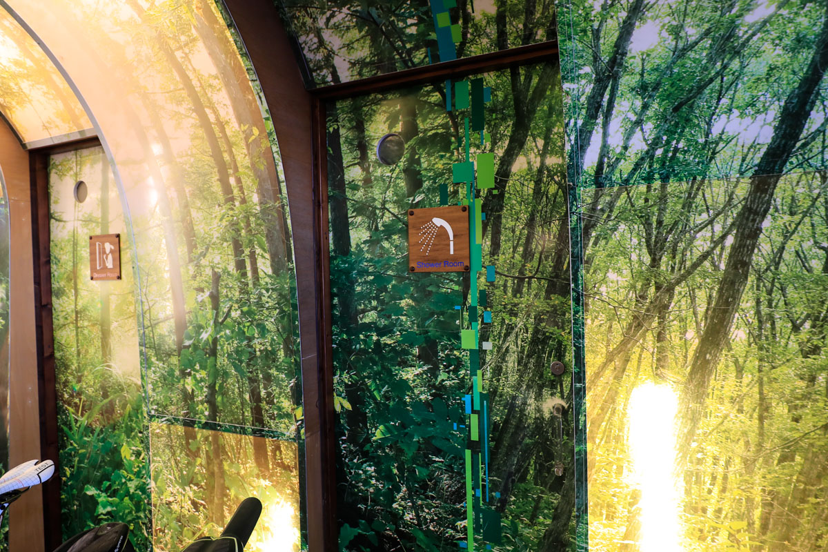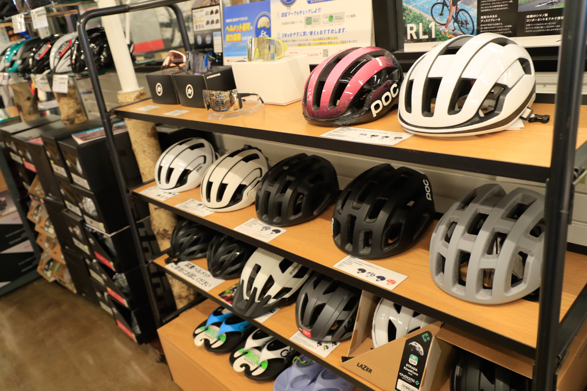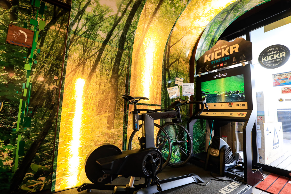 ヘルメットはオージーケー、ジロ、POC、カスクなど10ブランド以上の主要モデルをエントリーからハイエンドまで揃える。インドアトレーナーも各社製品を揃えるほか、「ワフーKICKRステーション」にもなっており、モニターを見ながら実走感をもって試すことができる。Zwift体験も思う存分試すことが可能なようにシャワーや更衣室も完備している。コーナー奥には屋外テラスがあり、ライド後の休憩やイベントスペースとしても活用されている。