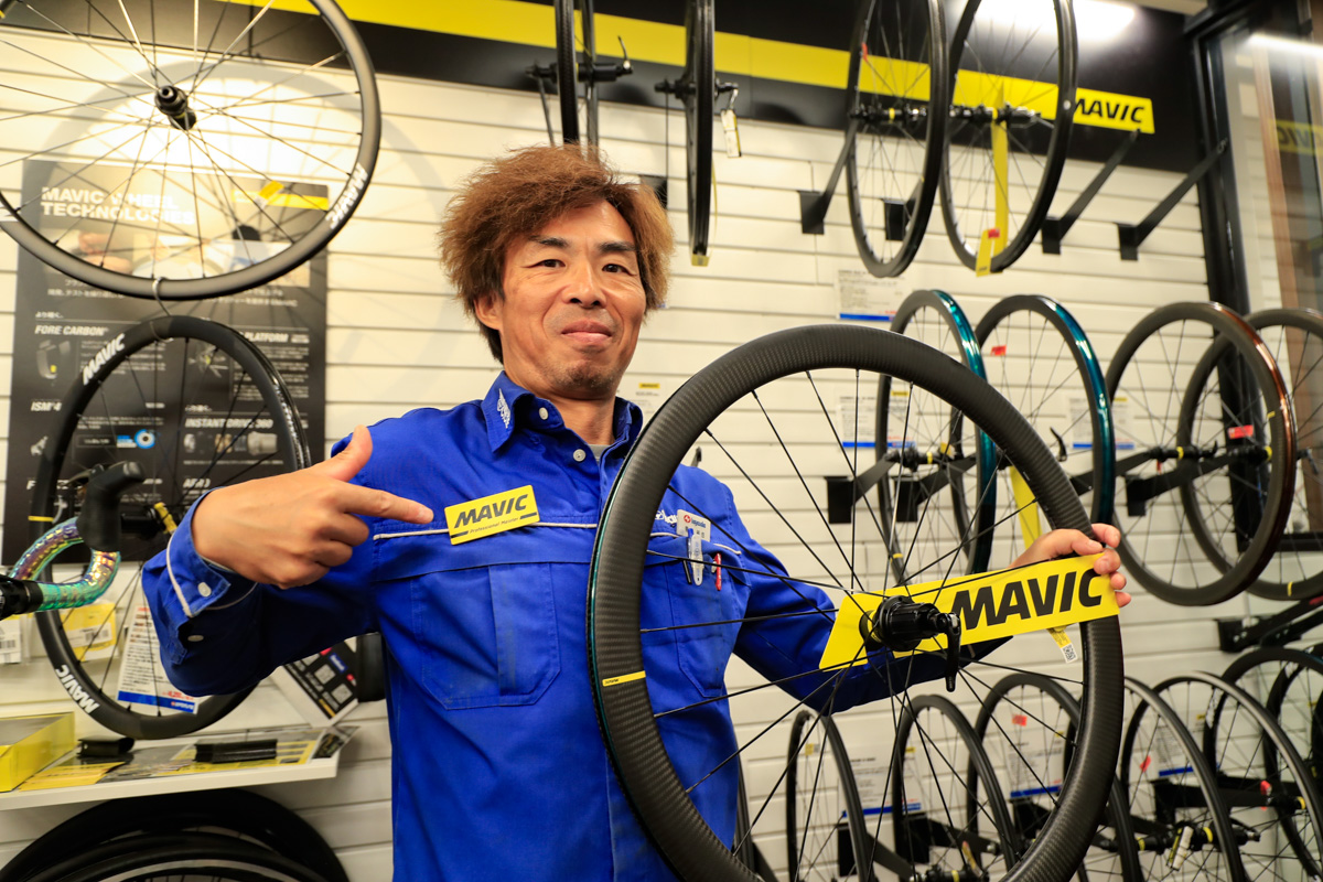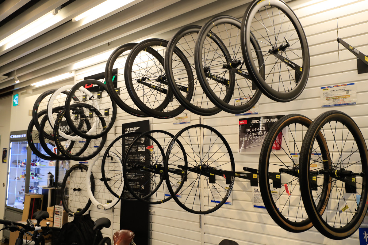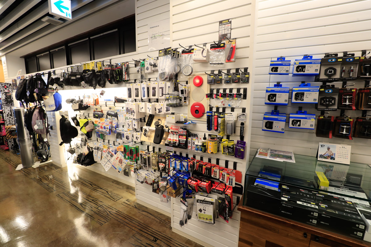 4Fはホイール、シューズ、ヘルメット、バッグやケミカルなどのグッズ類やインドアトレーナーなどを揃えたパーツ&アクセサリーのフロア。主要ブランドの多くを揃えるホイールコーナーでも特筆すべきはマヴィックのコーナーで、一週間レンタルが可能なテストホイールも多く用意しているのに加え、テクニカル面に精通した有資格者「マヴィック・マイスター」が6人も居るとか。「ホイールは使ってみなければ分からないので、じっくり試して納得してから購入できますよ」と菅田さん。