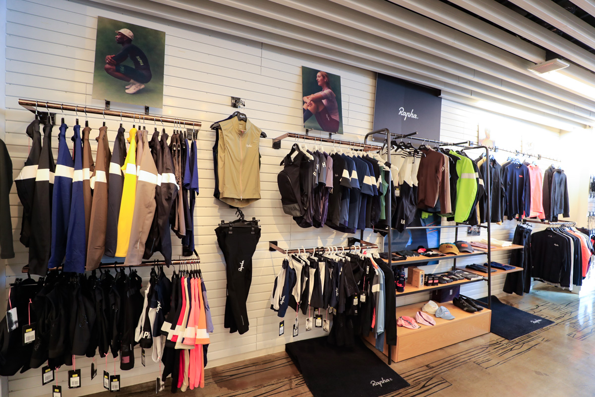 フロアの反対側奥にはサイクルウェアを大量に揃えるアパレルコーナーが広がる。姿見の鏡が随所に設置され、フィッティングルームもある。女性スタッフの菅原さんはアパレルコーナーのコンセプトを次のように話してくれた。