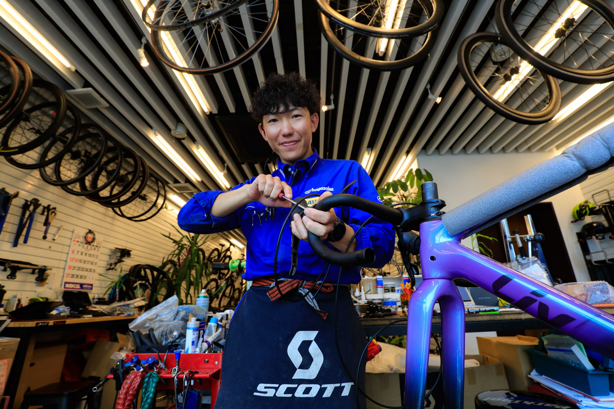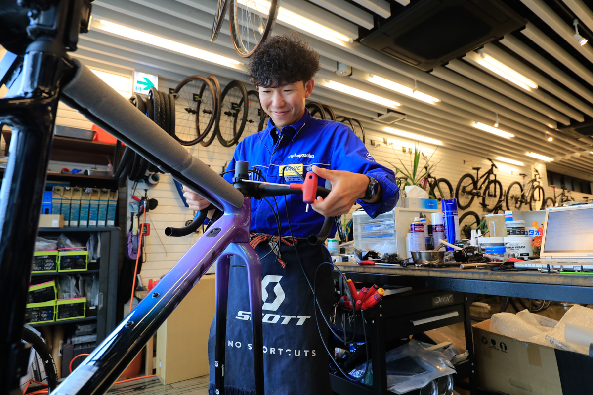 スポーツバイクのメカニック&販売スタッフとして中心となるのが齋藤雅(まさし)さんだ。かつてロードレースは実業団レベルで走り、シクロクロスは今も最高峰E1クラスで走る若手レーサーで、もともと医療系マッサーとして働いていた経験があり、フィッティングについても専門級で対応ができるほか、ハイエンドバイク系の組み立てとメンテナンスも一任されている腕前の持ち主。レース志向の方にとっても頼れる存在だ。