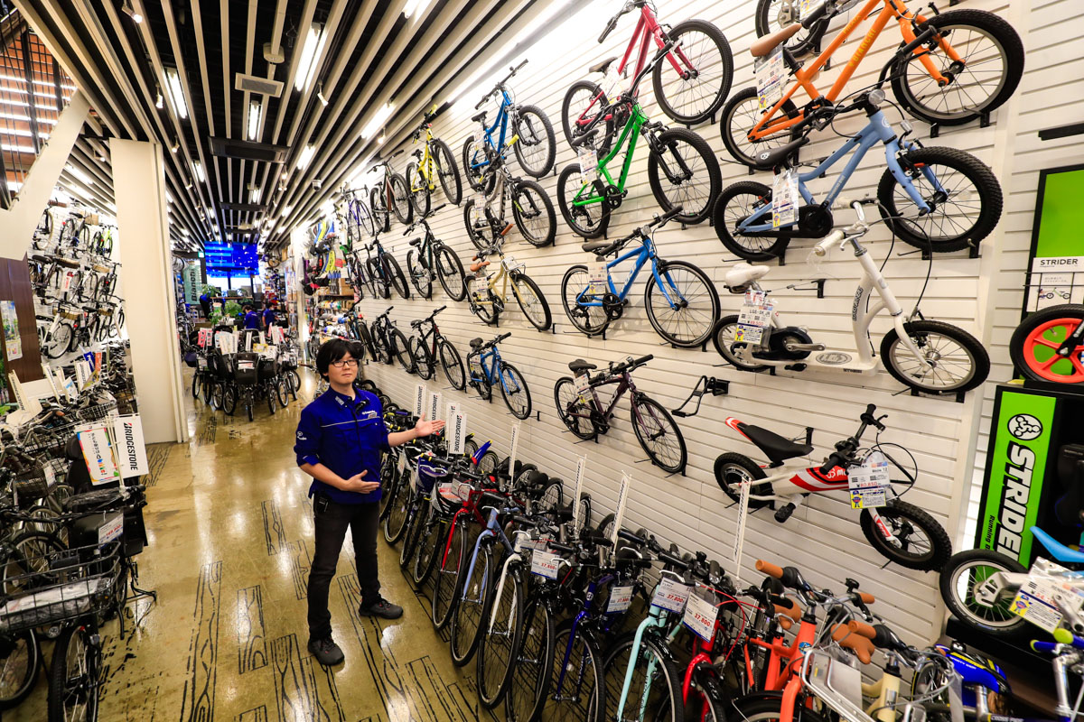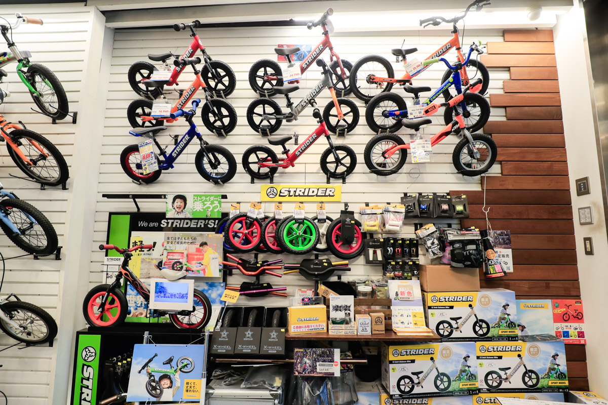 1Fは一般自転車のフロア。子供用のストライダからキッズバイク、電動アシストサイクル等、生活シーンで活躍する自転車を幅広くラインナップ。電動アシスト車は国産メーカーに加えて海外ブランドのベネリ、メイト、ベスビー等も取り扱う。