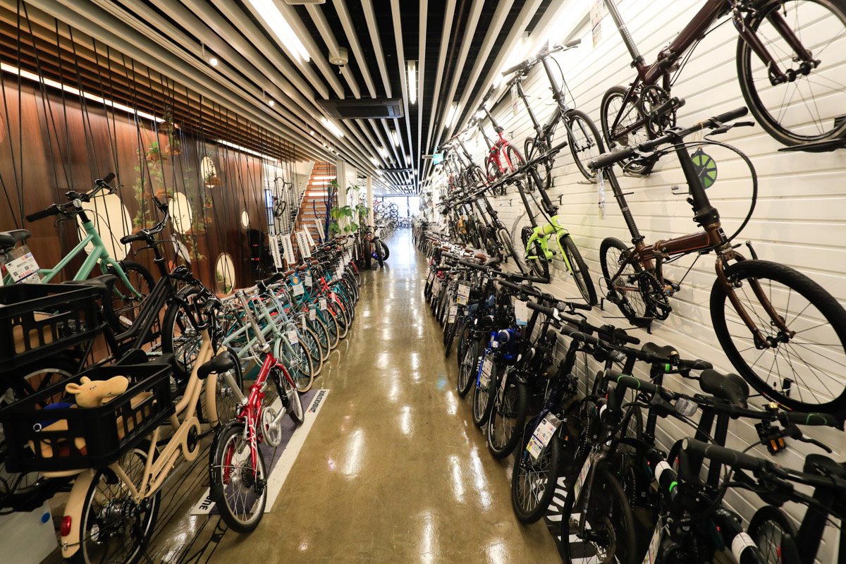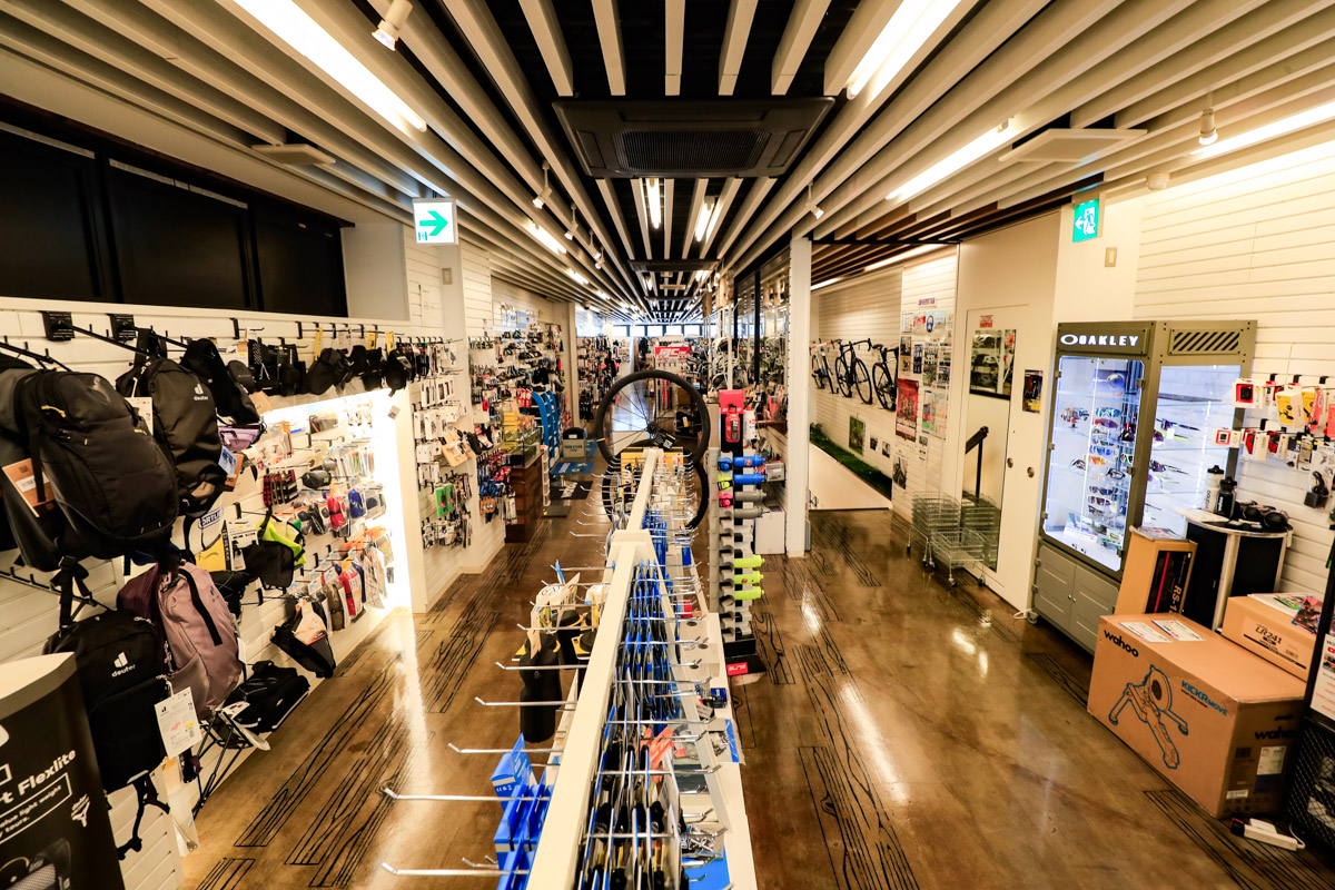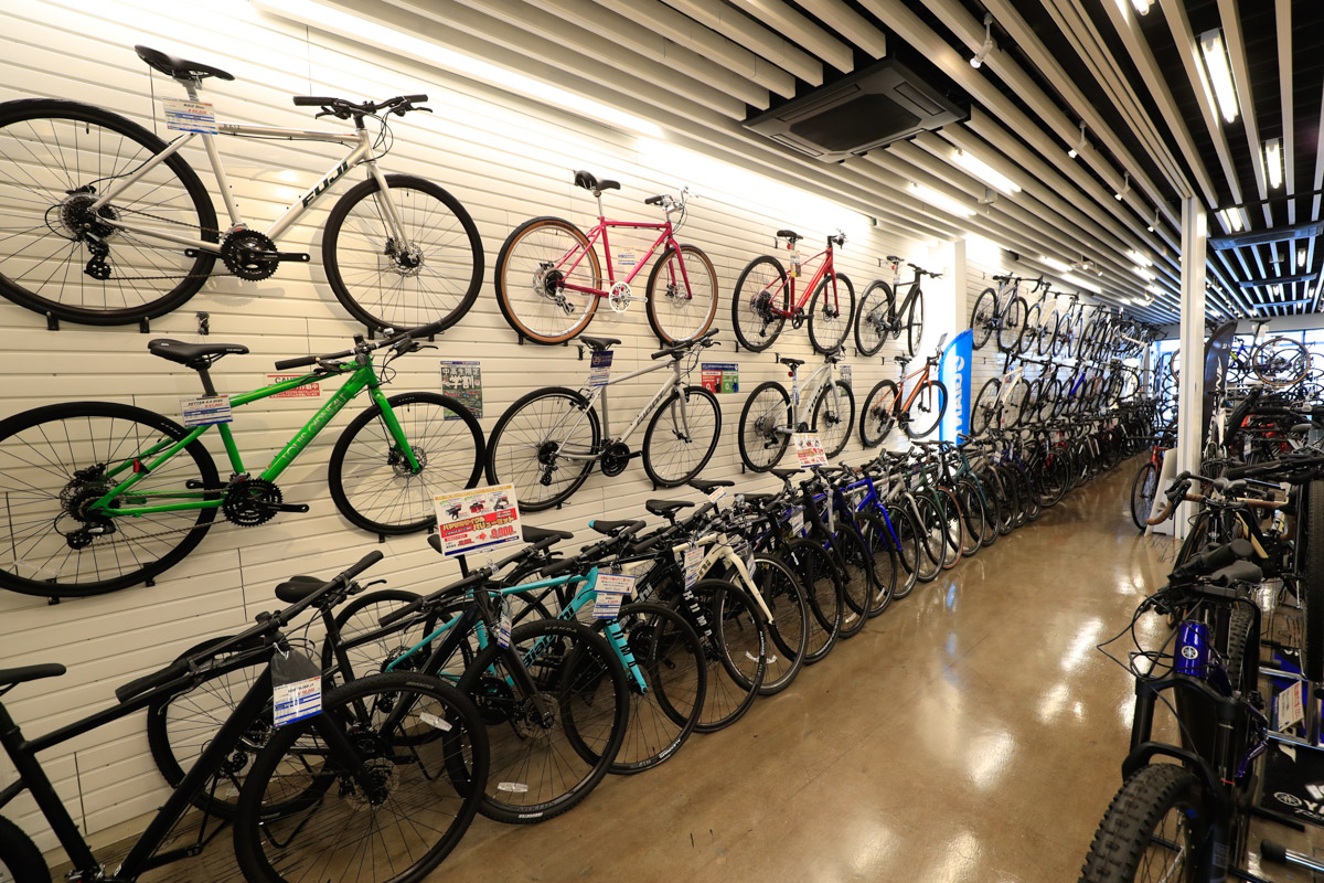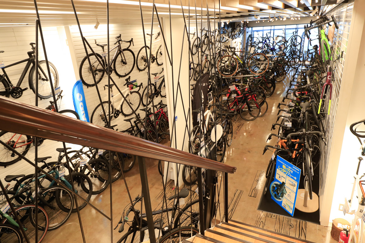 各フロア60坪、総計約240坪という広い売り場に、オールジャンルの膨大な在庫車数で誰でも欲しい自転車が手に入る。的確な商品知識を持ったスタッフからアドバイスを受けながら選べる商品点数と、サービスについても万全。初心者から上級者にまで教えてくれる提案力が高いショップだ。
