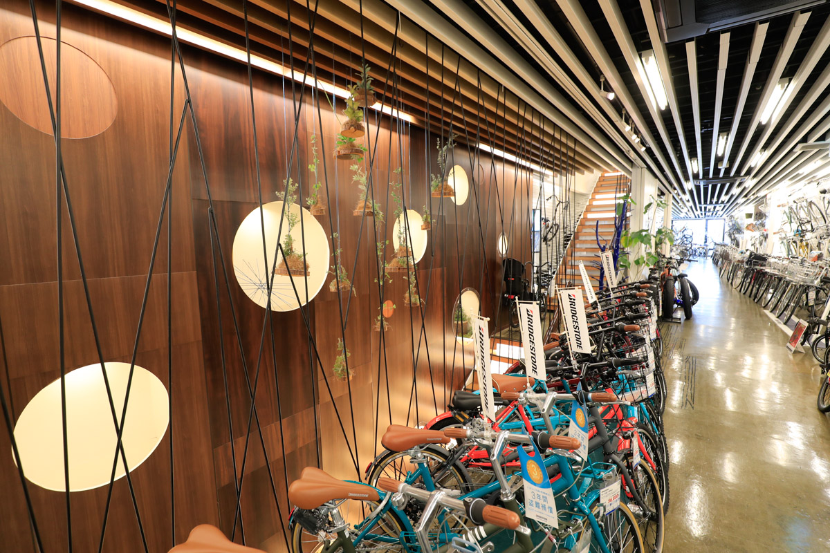 生活必需品としての自転車と用品、マストアイテムを豊富に揃えつつ、奥には総合カウンターとサービスファクトリーがあり、購入相談から点検・修理、メンテナンスにまで素早く対応。購入後のアフターもしっかりサポートするサービス体制を整えている。