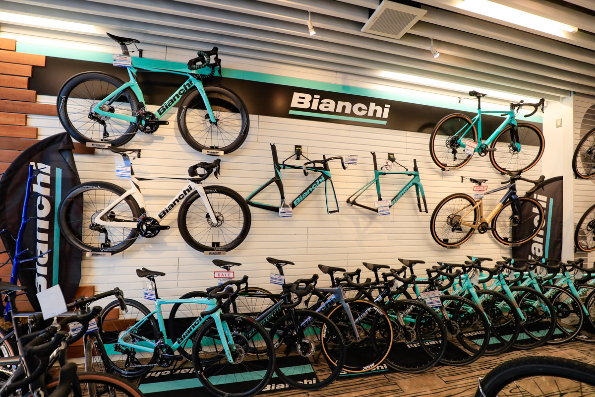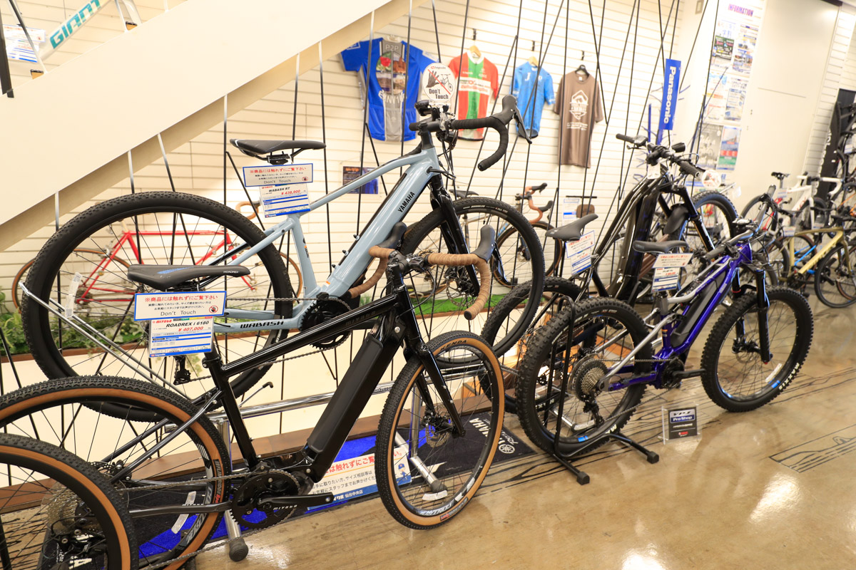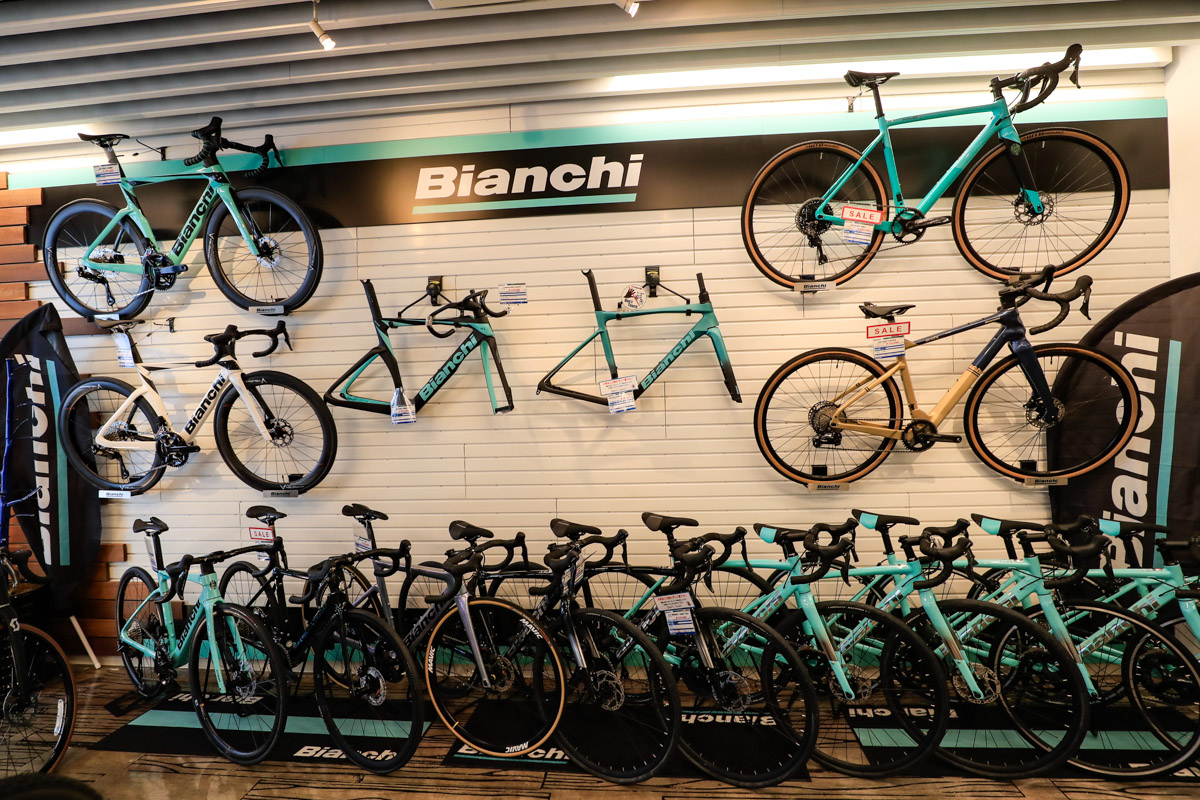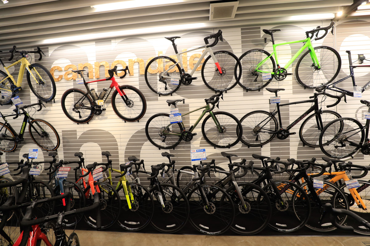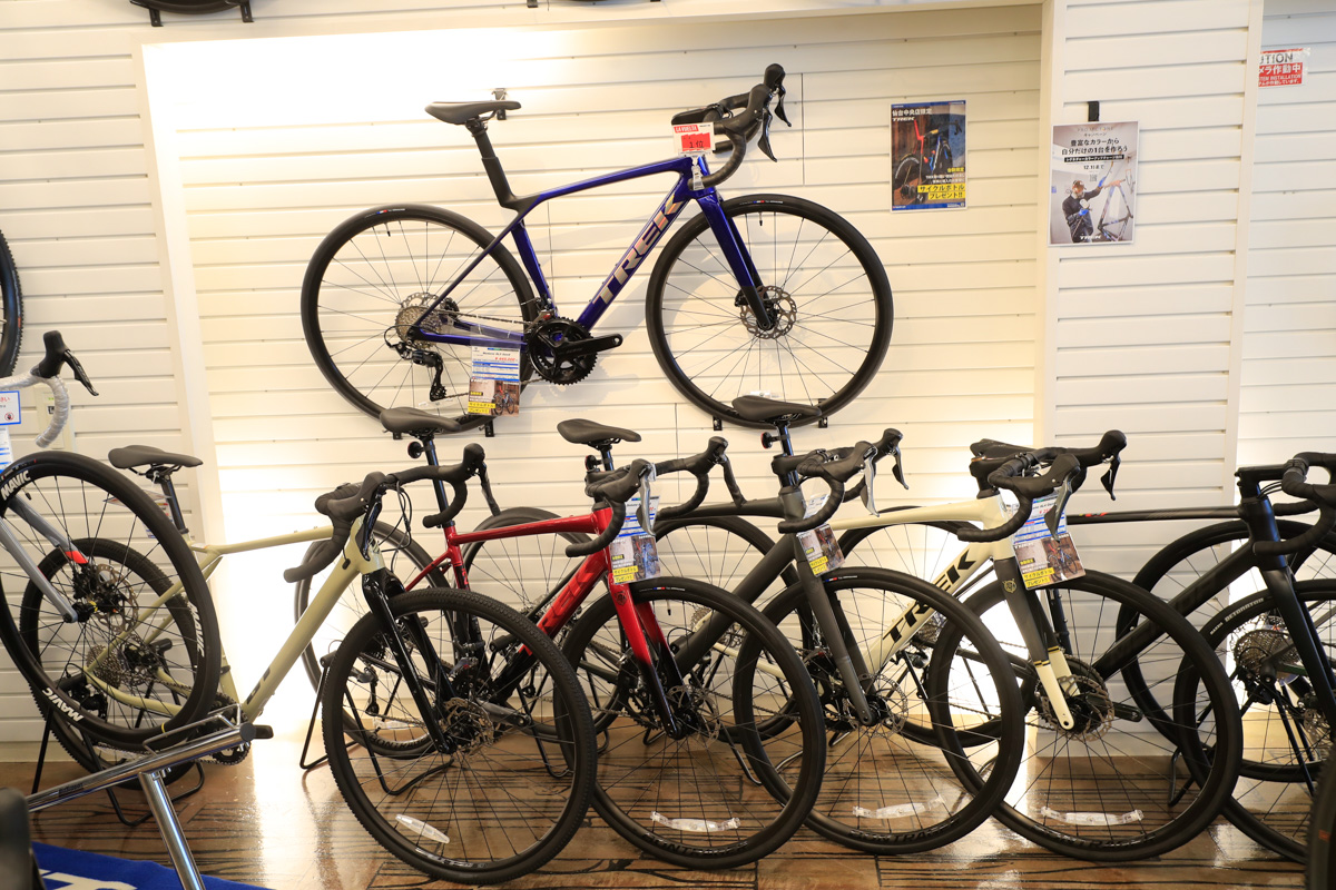 なかでも海外有力メーカーのスポーツバイクは、ブランドごとにまとまったスペースを確保してディスプレイ。とくに人気が高いキャノンデールとビアンキは壁面デザインを施した展示によってブランドの世界観を表現しつつ、グレードや価格帯から選べる車種ラインナップを整理して揃えている。2024年からはトレックの取り扱いも開始し、コーナーとして設けている。